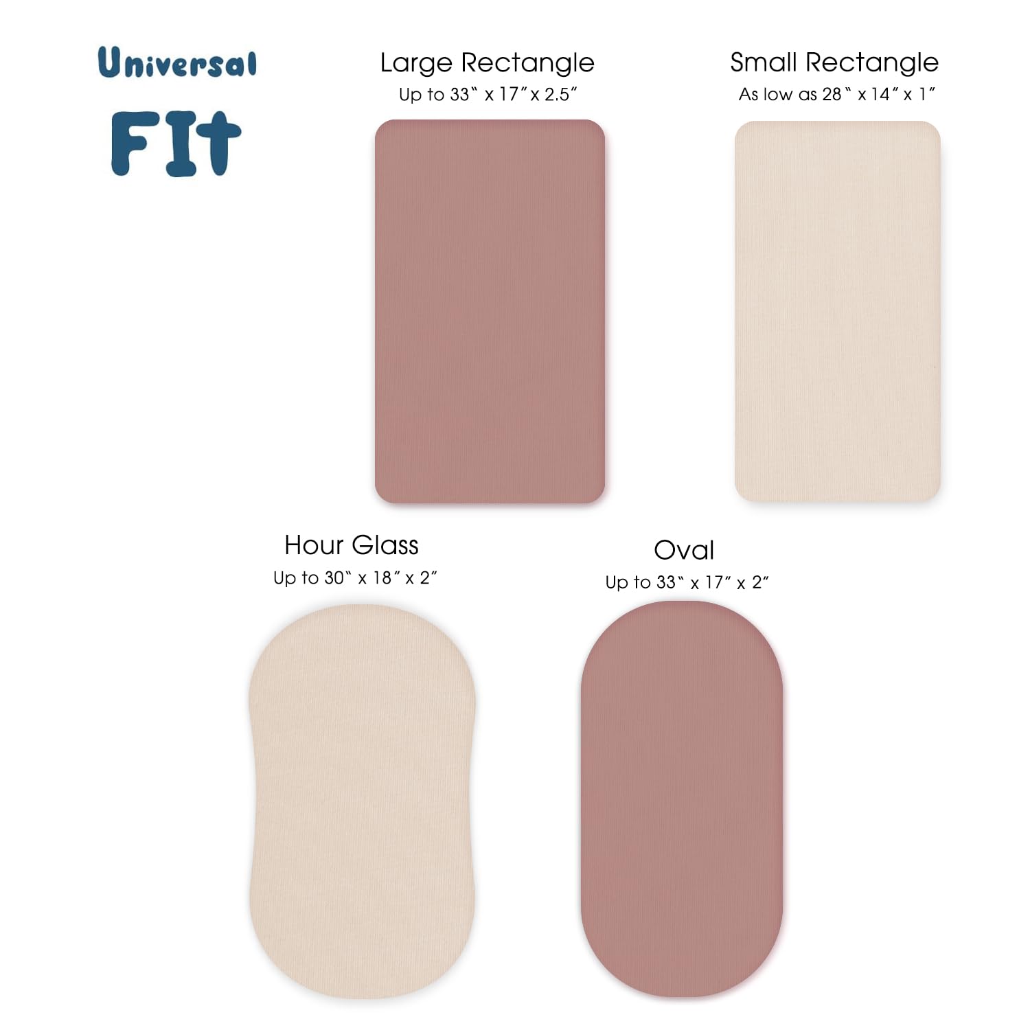 Universal Fit – Measuring 32" x 16" x 5". Our bassinet sheets fit almost all standard oval, round, rectangle, hourglass shaped bassinet mattresses and changing pads. Each bassinet mattress pad cover comes with an elastic band encased at the bottom for safety.