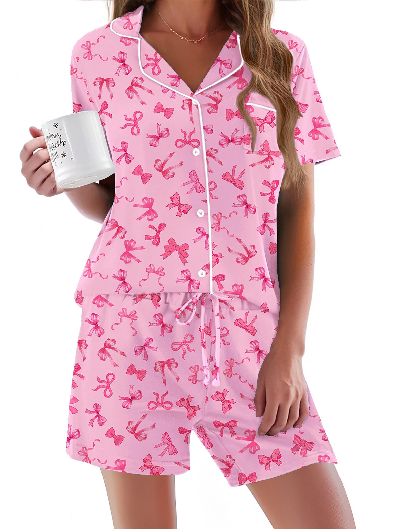 HUMANIZATION DESIGN: Features a hip-length button-down top with notch collar and chest pocket. Shorts include a chiffon drawstring elastic waist for maximum comfort.