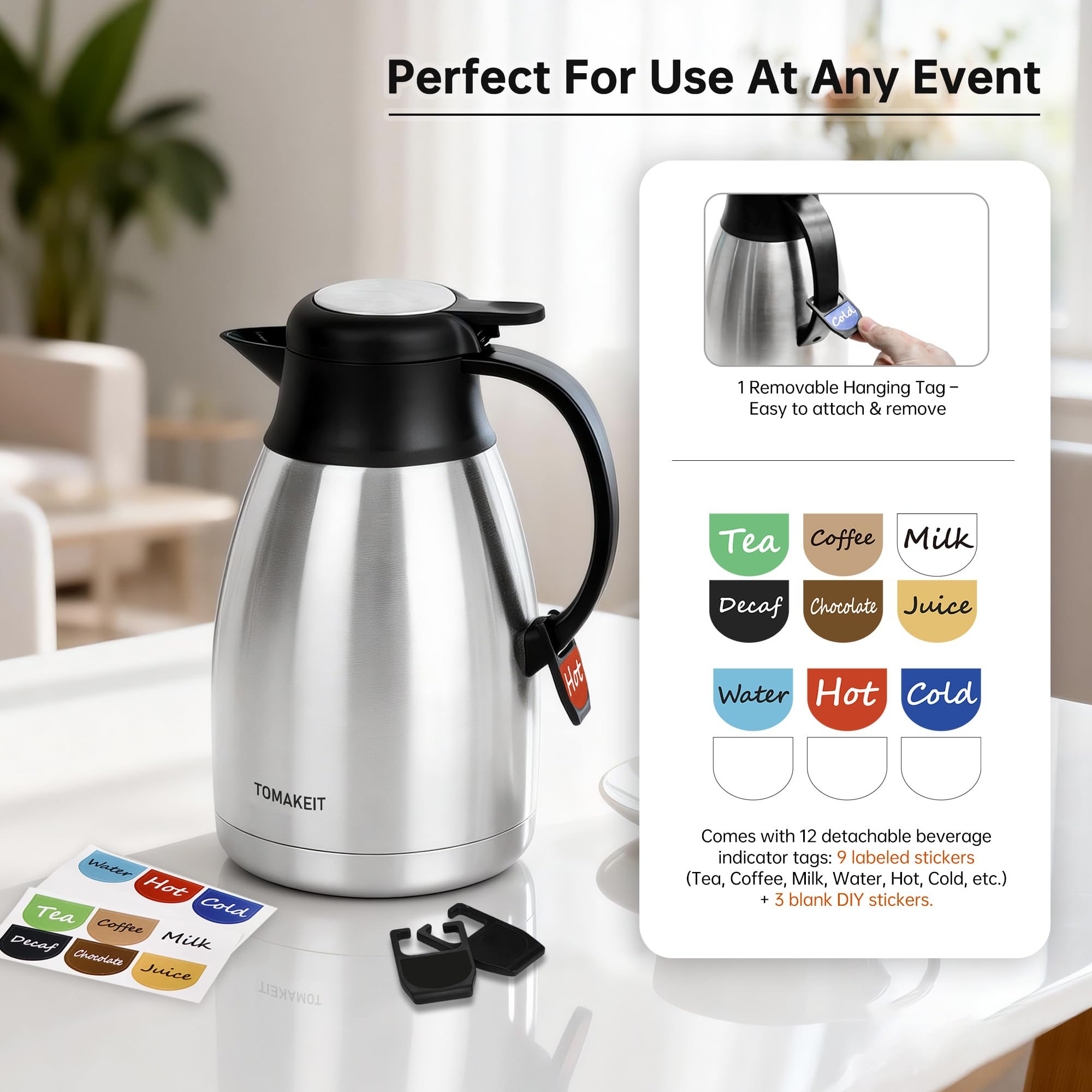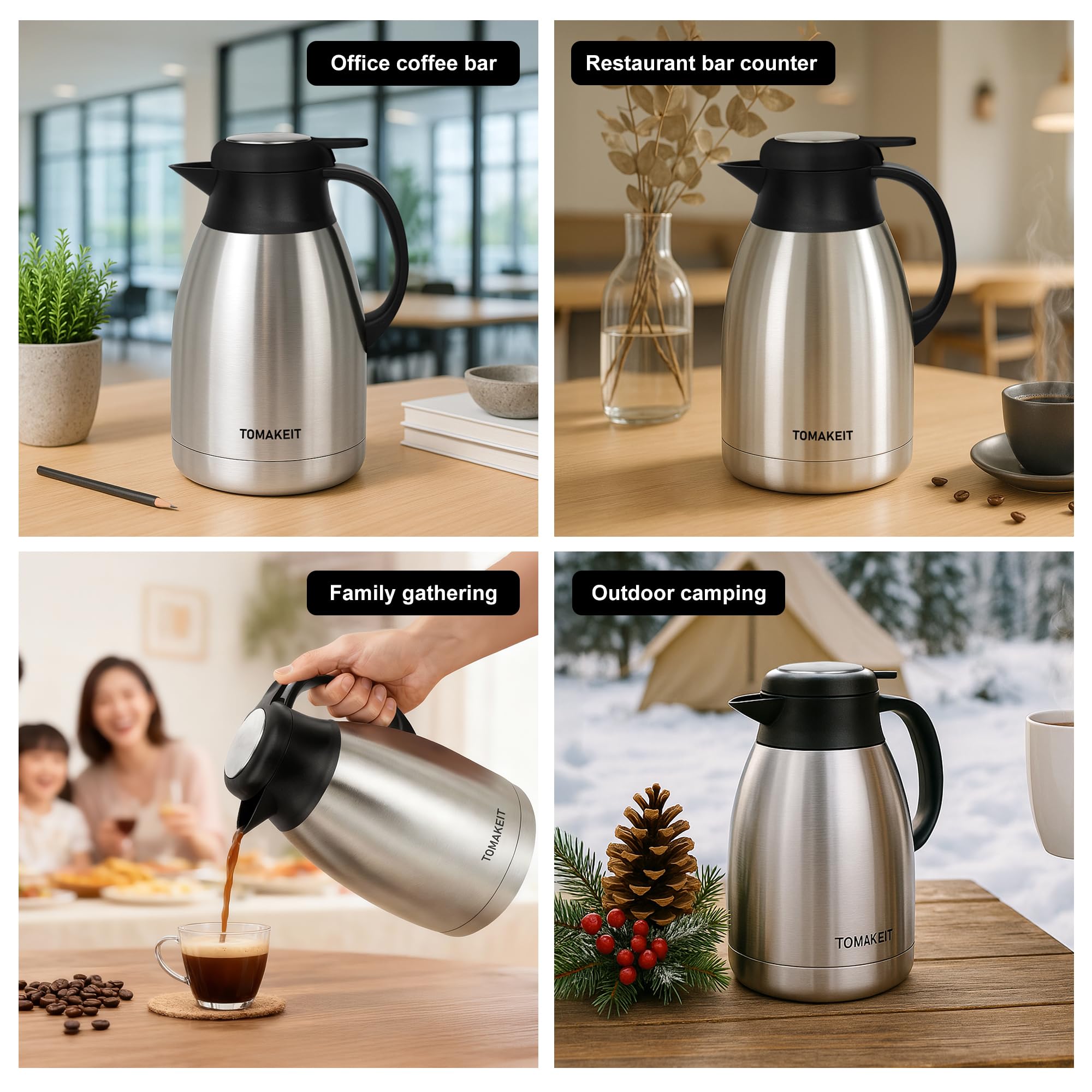 Advanced Vacuum Insulation Technology:This 2L stainless steel thermal carafe features double-wall vacuum insulation, ensuring your beverages stay hot or cold for up to 24 hours. Whether you're enjoying a steaming cup of coffee in the morning or a refreshing iced tea in the afternoon, this thermos maintains the perfect temperature for hours, making it ideal for daily use or outdoor adventures.