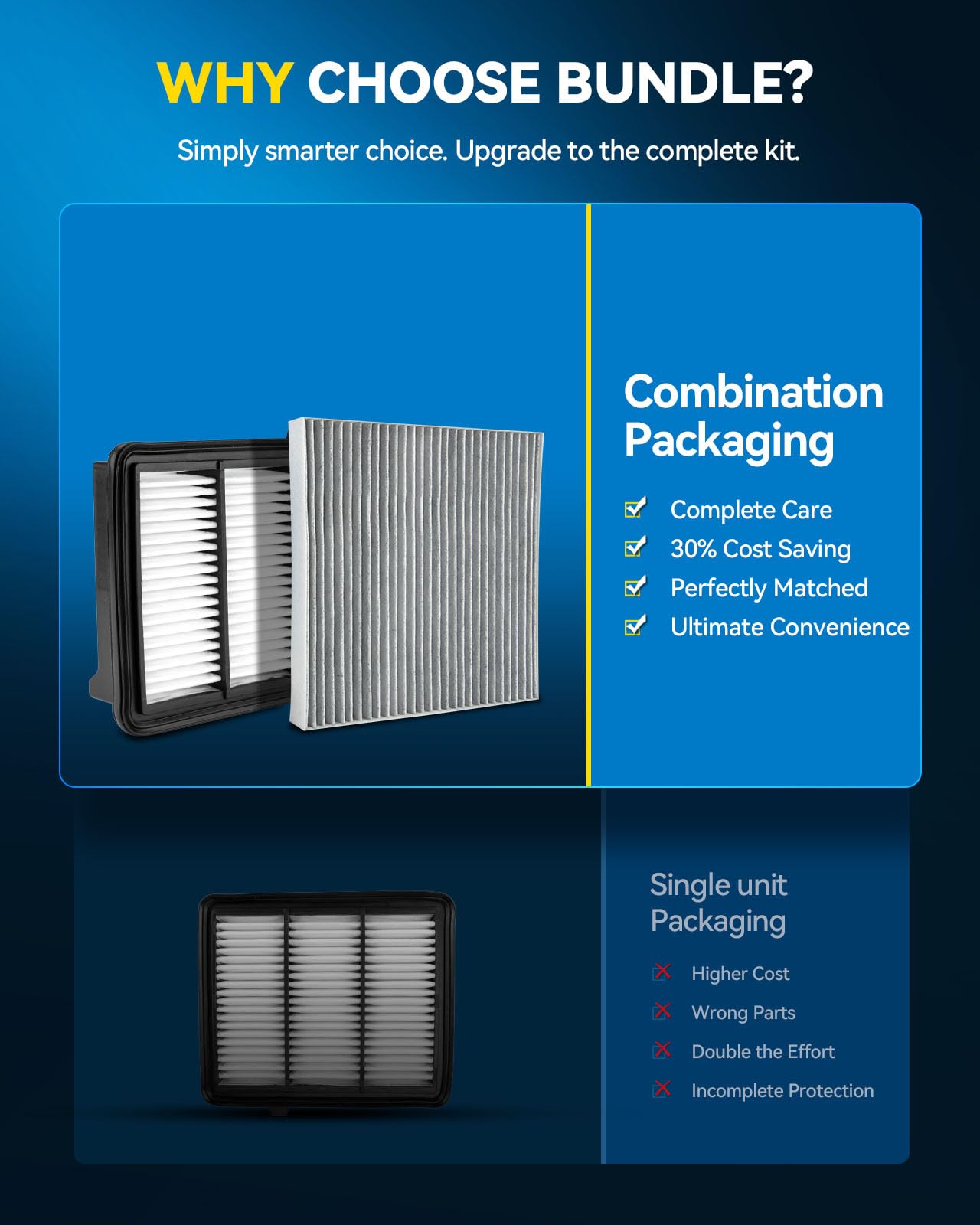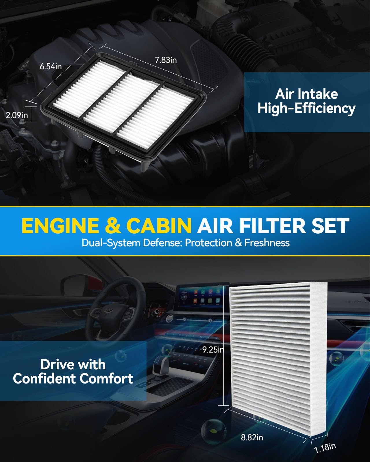 [Ultimate Convenience Bundle]: Skip the hassle of separate purchases! Our curated 2-in-1 kit matches the exact engine & cabin air filters your vehicle needs. Simply enter your make, model, and year for a perfect fit. One click, one box, one-stop shopping that saves you both time and money