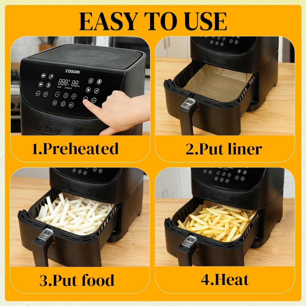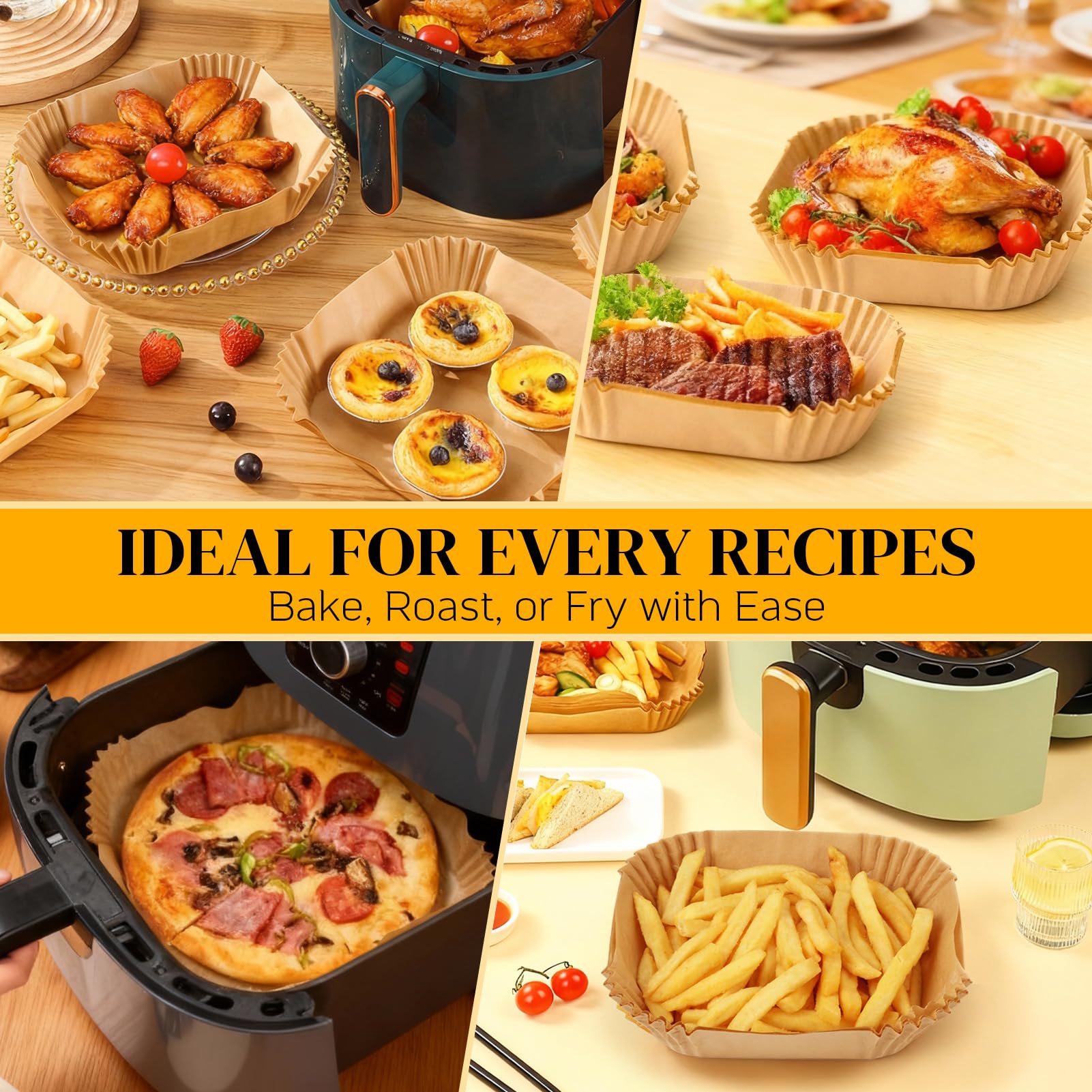 PREMIUM FOOD GRADE MATERIAL: Made from 100% food-grade pulp with a food-grade nonstick coating, unbleached, nonstick, grease-proof, waterproof, and non-absorbent, these disposable air fryer liners are 100% safe for daily use.