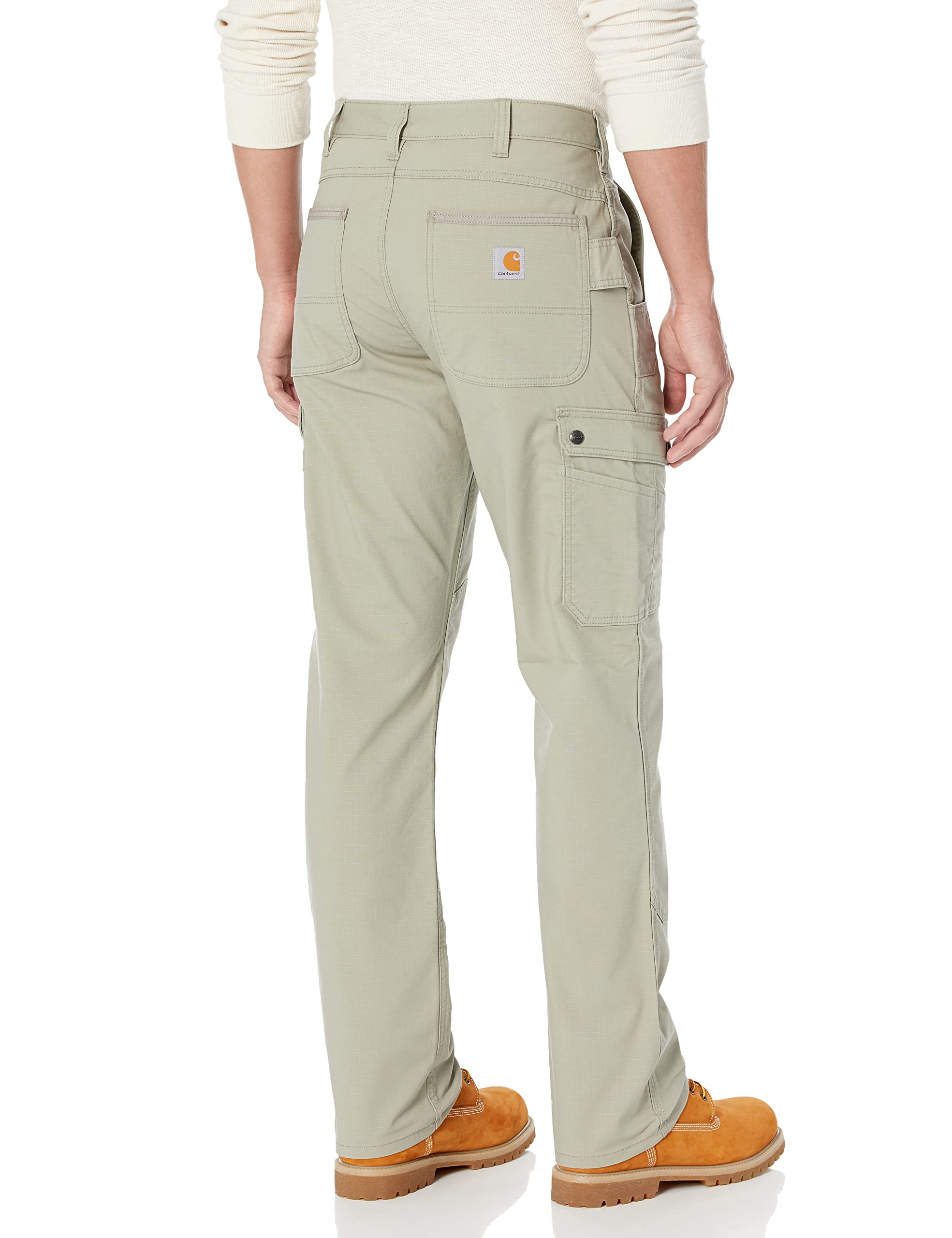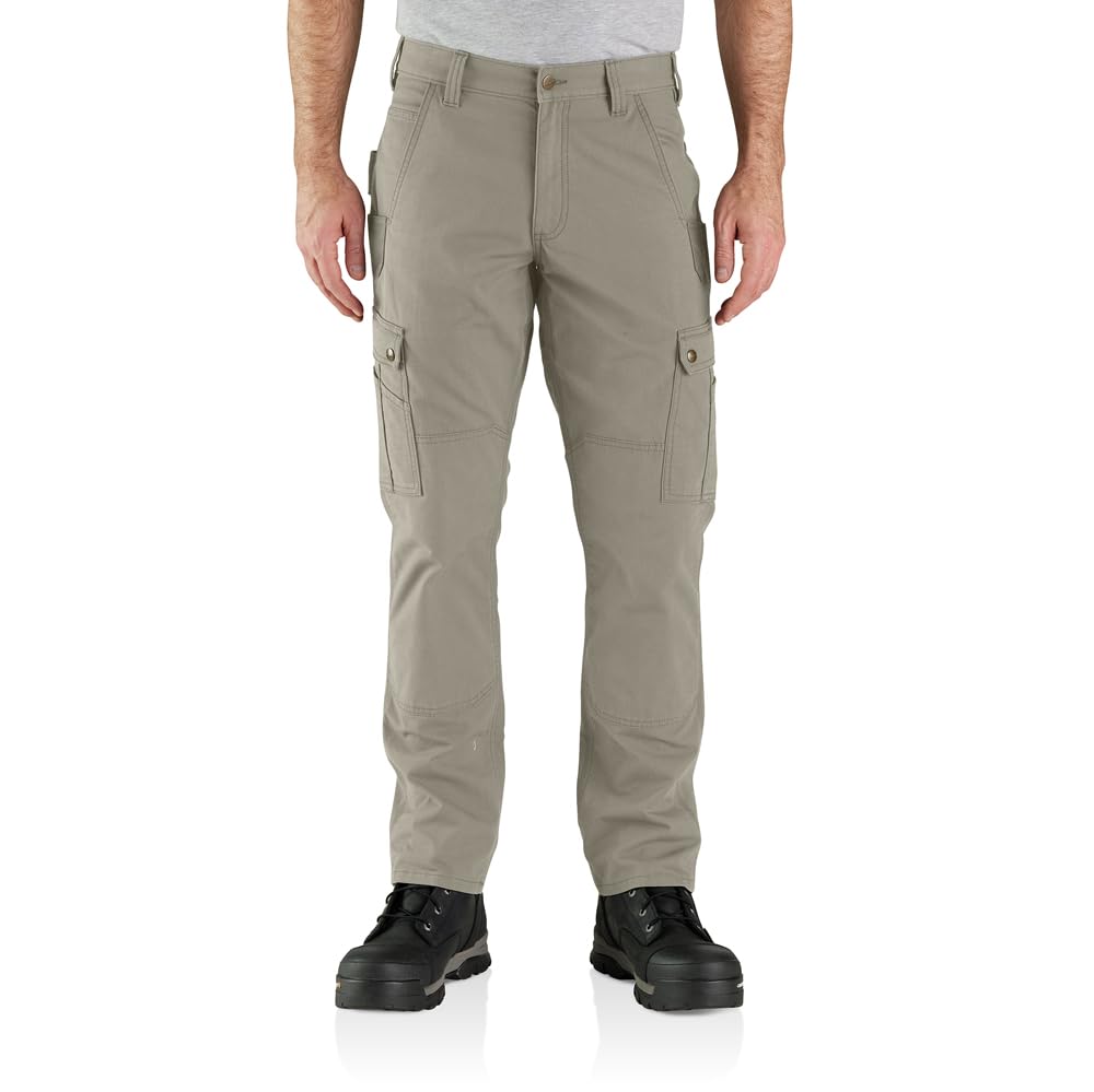 Description Built to move, these men's Carhartt cargo work pants offer job-site durability with stretch for easy mobility. Large thigh pockets plus utility pockets offer plenty of storage space. High-wear pocket areas are reinforced with Cordura®, and double-front legs accept knee pads. Their relaxed fit offers a little extra room through the seat and thigh with a straight leg opening.