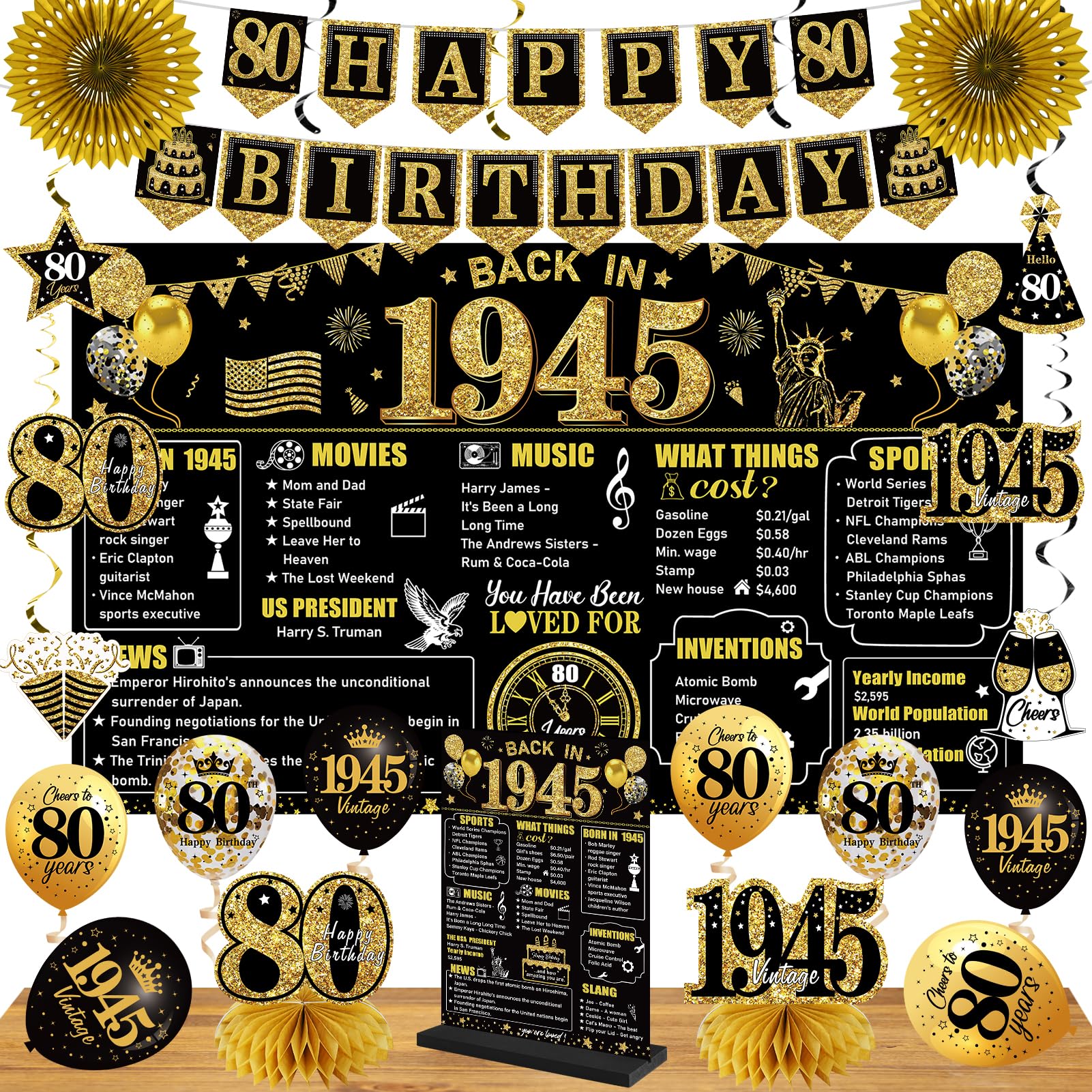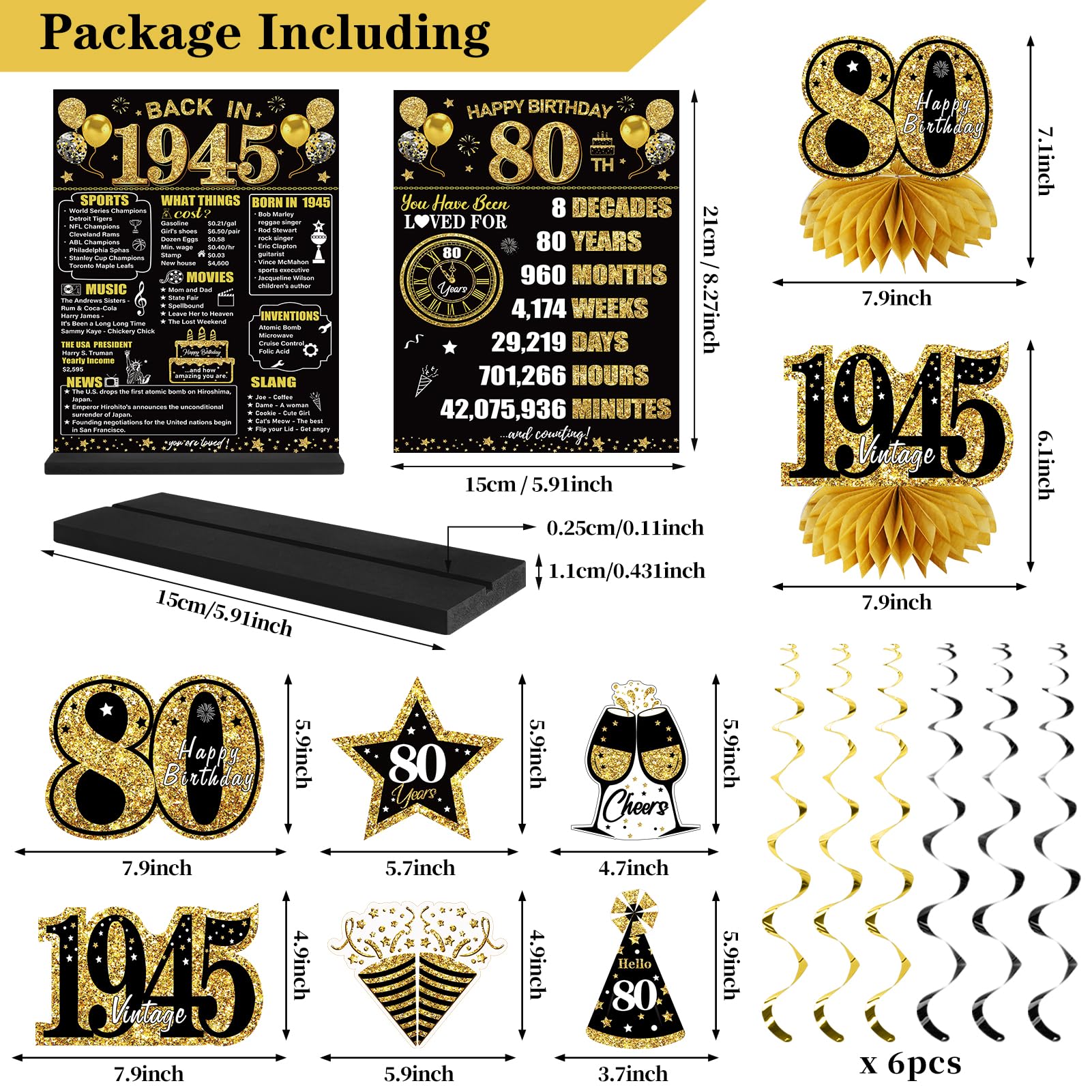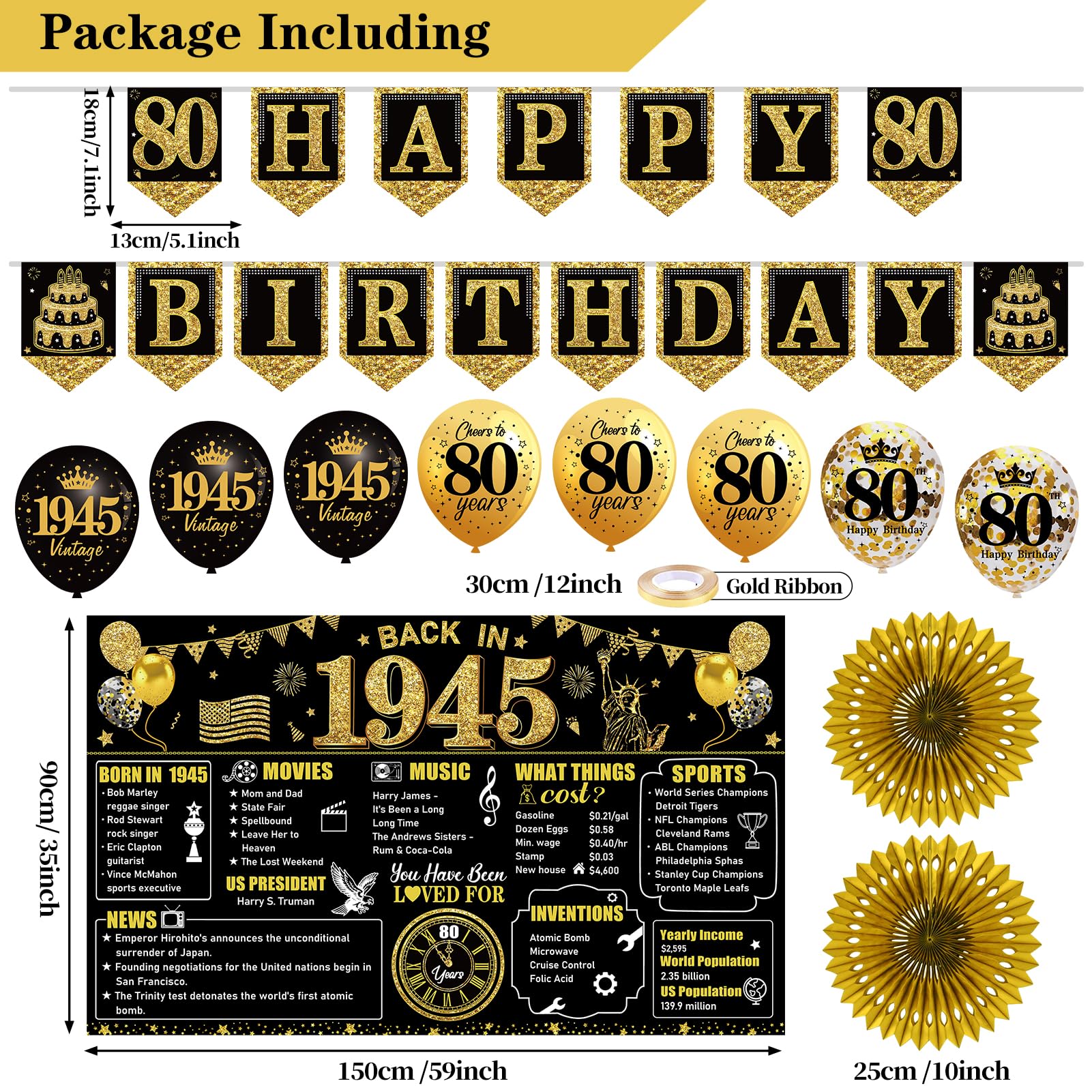 80th Birthday Decorations Kit: 1 Back in 1945 Banner Backdrop,1 Back in 1945 Table Poster Card,1 “80 Happy Birthday” banner, 6pcs Hanging Swirl, 8pcs 12inch balloons,2pcs Honeycomb Centerpiece, 2pcs 10 inch paper fan. The 80th theme birthday party decoration kit is enough to meet your decorating needs and easily create a strong birthday atmosphere in your home