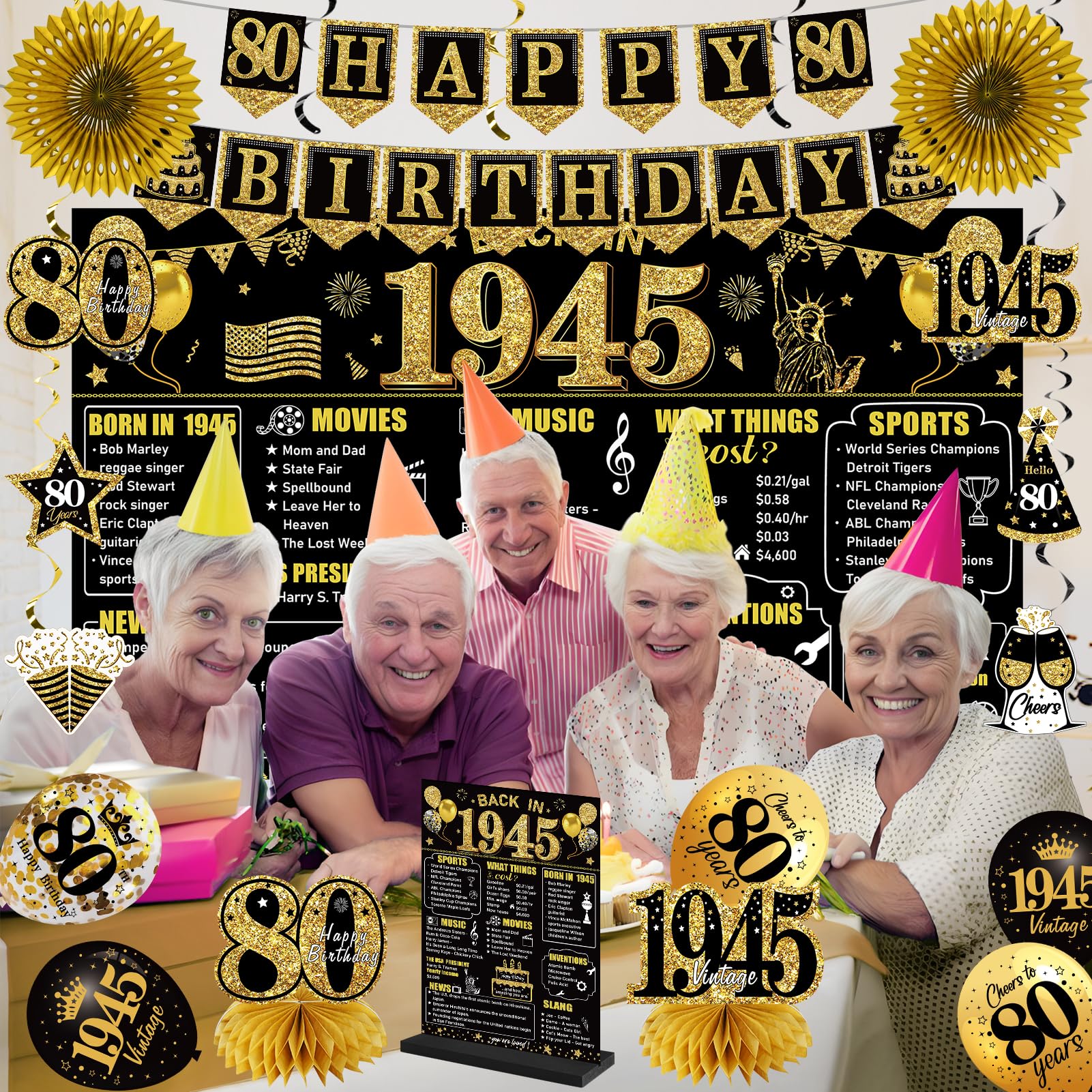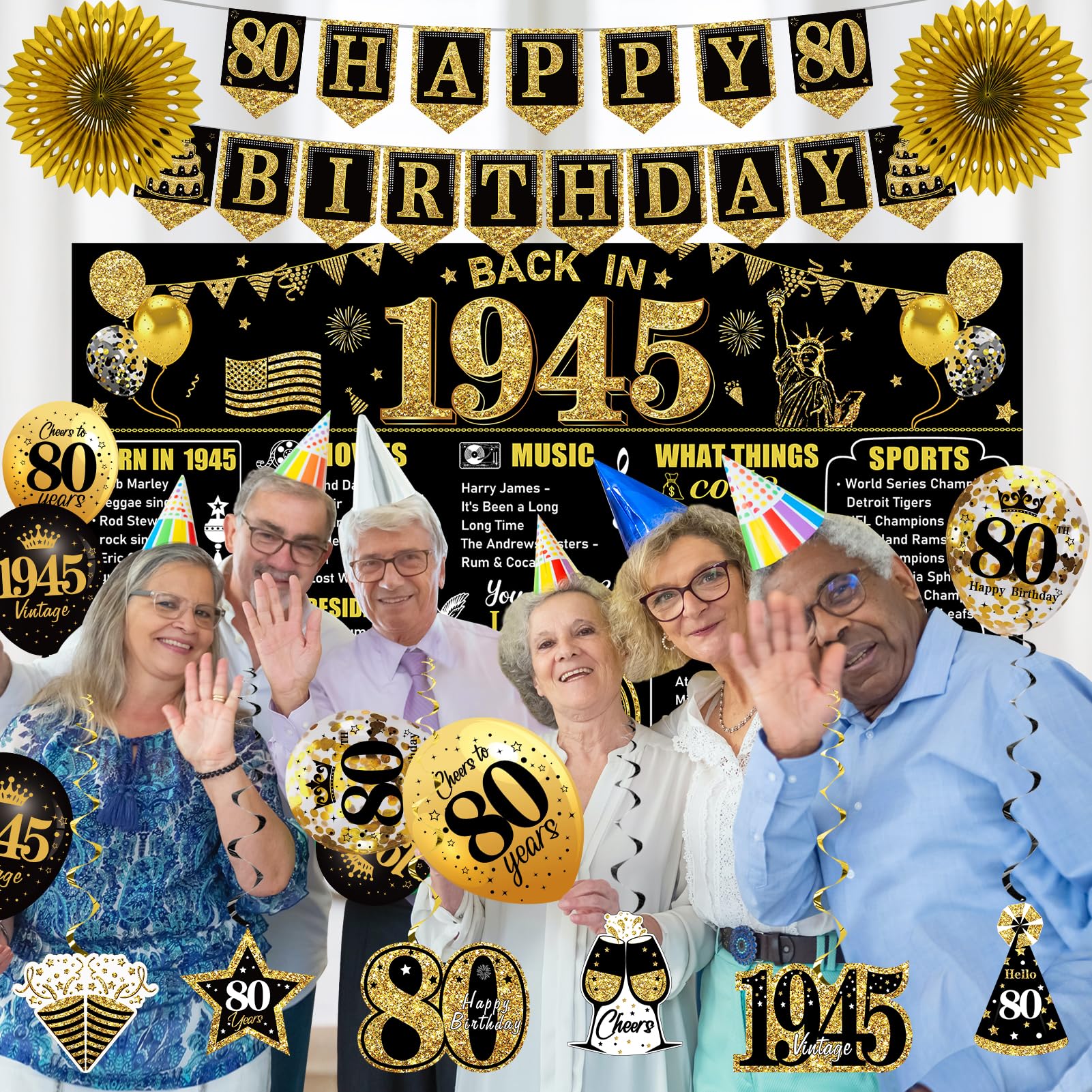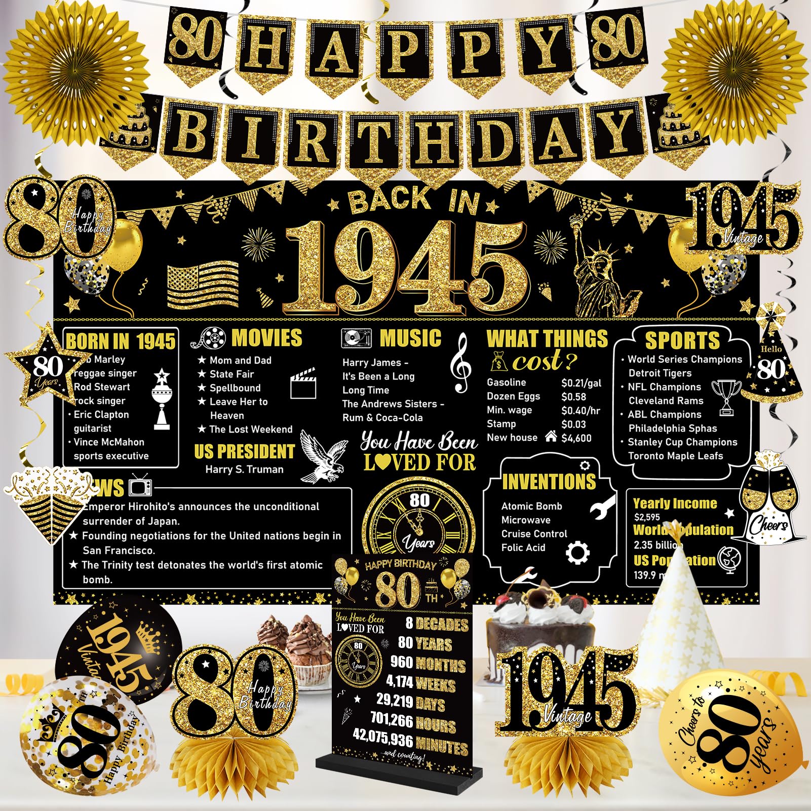 80th Birthday Decorations Kit: 1 Back in 1945 Banner Backdrop,1 Back in 1945 Table Poster Card,1 “80 Happy Birthday” banner, 6pcs Hanging Swirl, 8pcs 12inch balloons,2pcs Honeycomb Centerpiece, 2pcs 10 inch paper fan. The 80th theme birthday party decoration kit is enough to meet your decorating needs and easily create a strong birthday atmosphere in your home