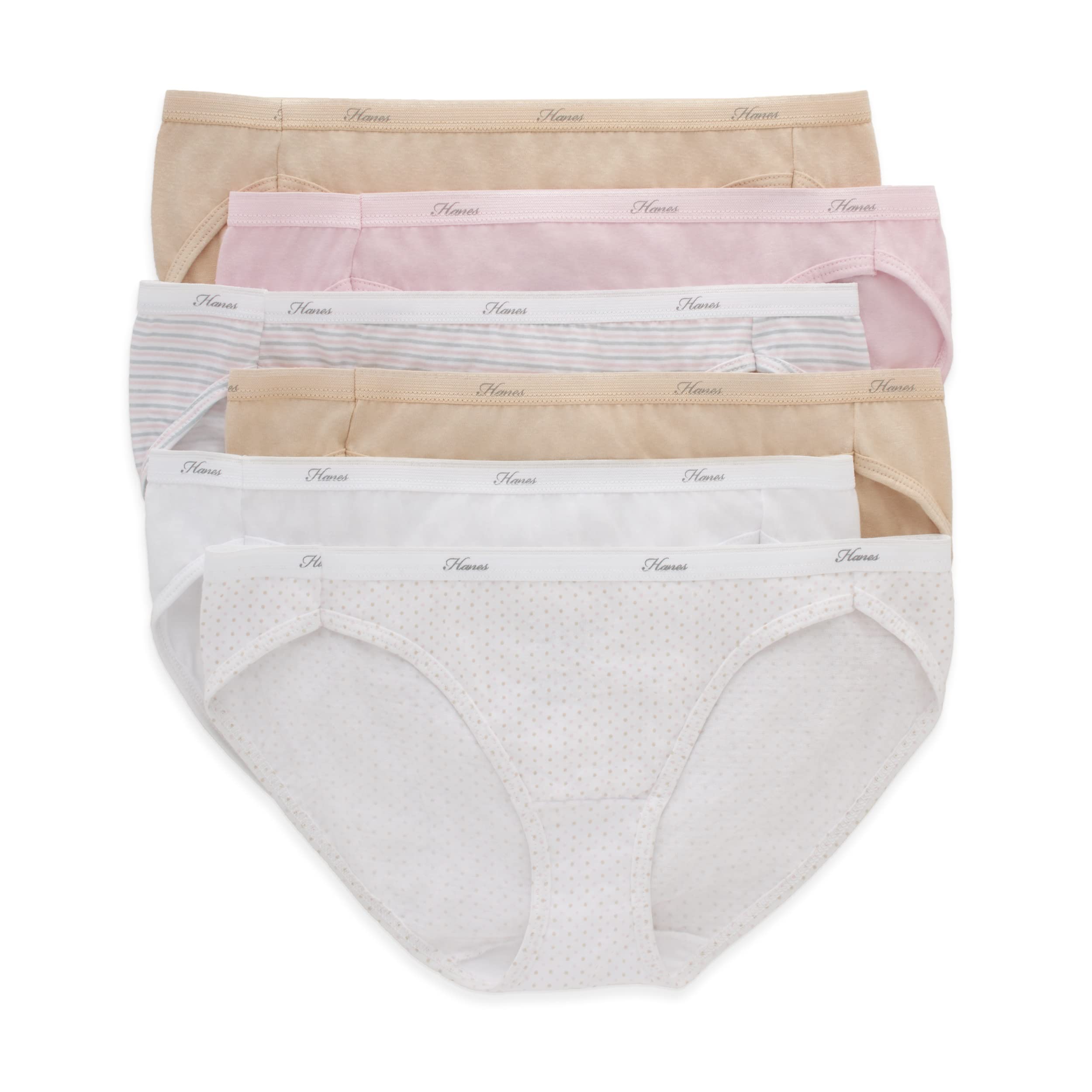 Description If you're a bikini wearer and need to refill your undie drawer, choose these bestselling cotton bikinis for women from Hanes® in a handy 6-pack of assorted colors. The experts at Hanes have taken a basic bikini and made it even better with Cool Comfort® cotton fabric that wicks away moisture from your skin to keep you cool and dry all day. You'll love the no-pinch waistband and the preshrunk cotton which means that these essential panties hold their shape and size, wash after wash. The silhouette of this classic bikini underwear offers a low-rise bikini waist and moderate back coverage, with no-ride-up leg bands for stay-in-place comfort. Stock up on one of Hanes® most popular cotton bikinis for lasting performance and comfort.