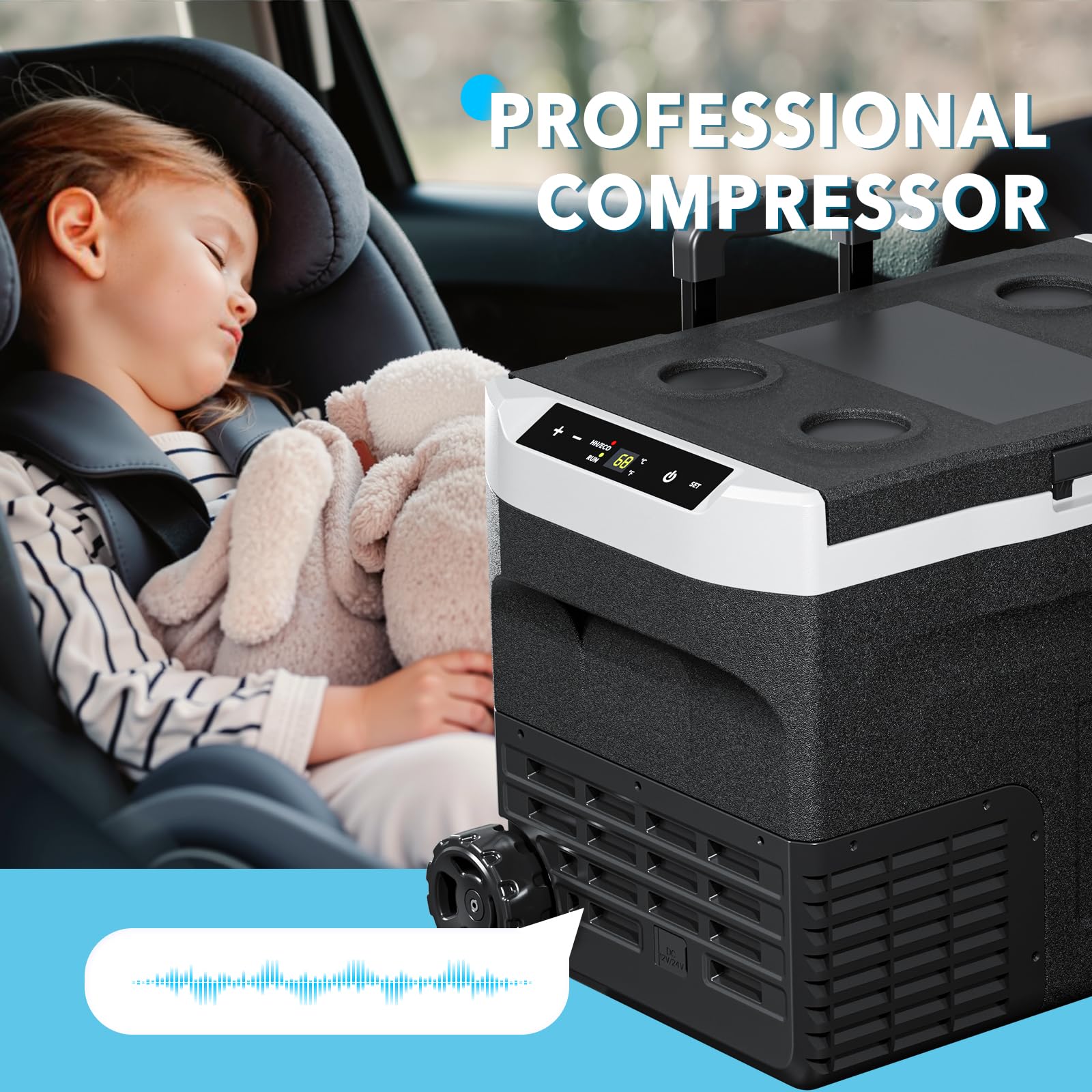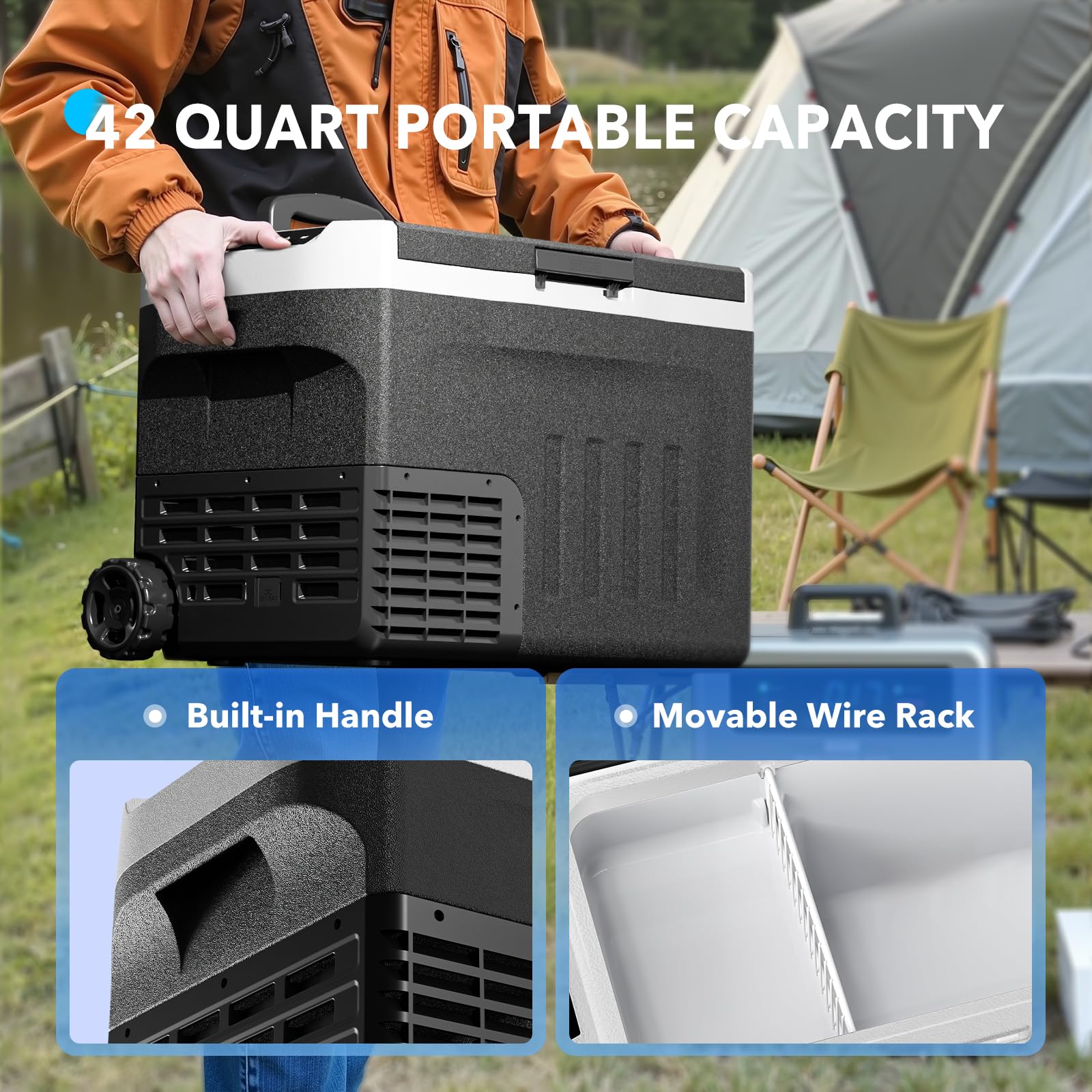 Two Zones & Portable Design: The portable fridge features two storage zones to effectively reduce odors. With a 42 Quart large capacity and a removable divider, the portable refrigerator is convenient to store and access all your food. The 12 volt refrigerator comes with built-in handles and off-road wheels, making it portable and easy to move, lightening your load on the journey.