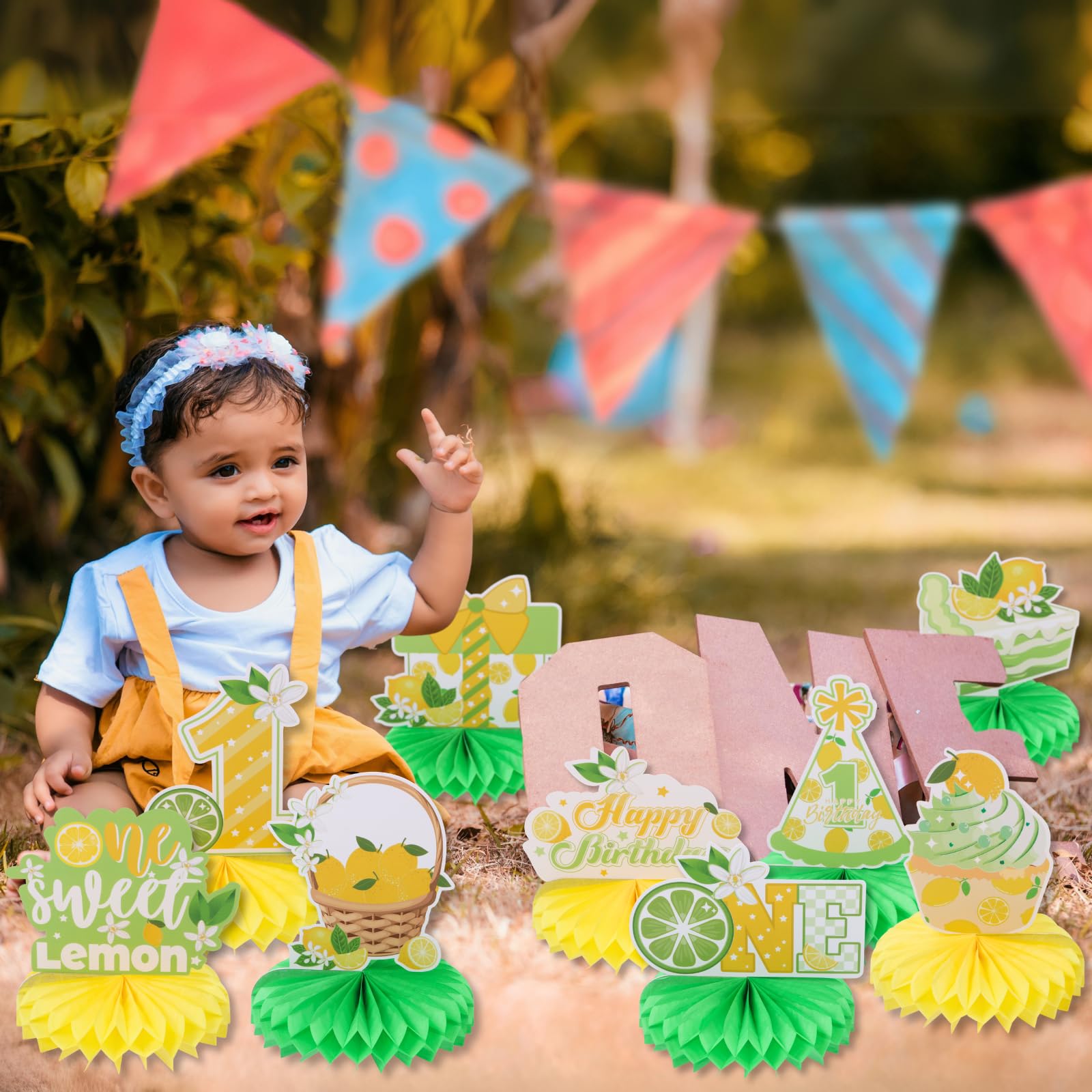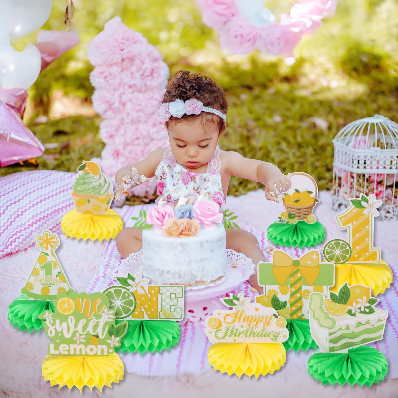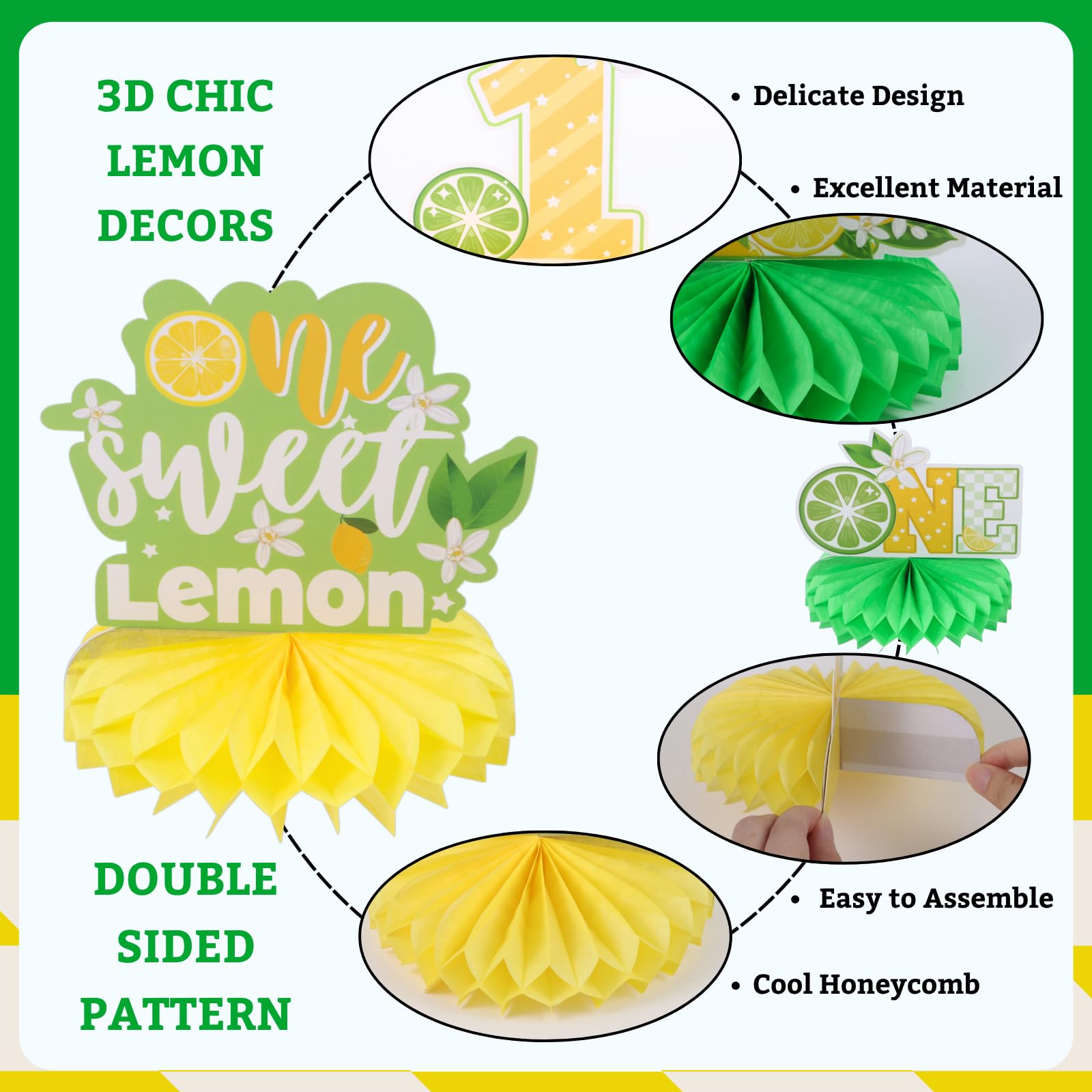 First Birthday Party Decorations: Celebrate your child's one birthday with our honeycomb centerpieces. Adorable double sided lemon elements and sweet desserts patterns are in a beautiful combination of yellow and green, which will add much touch of charm to first birthday party decoration and feel like sweet times