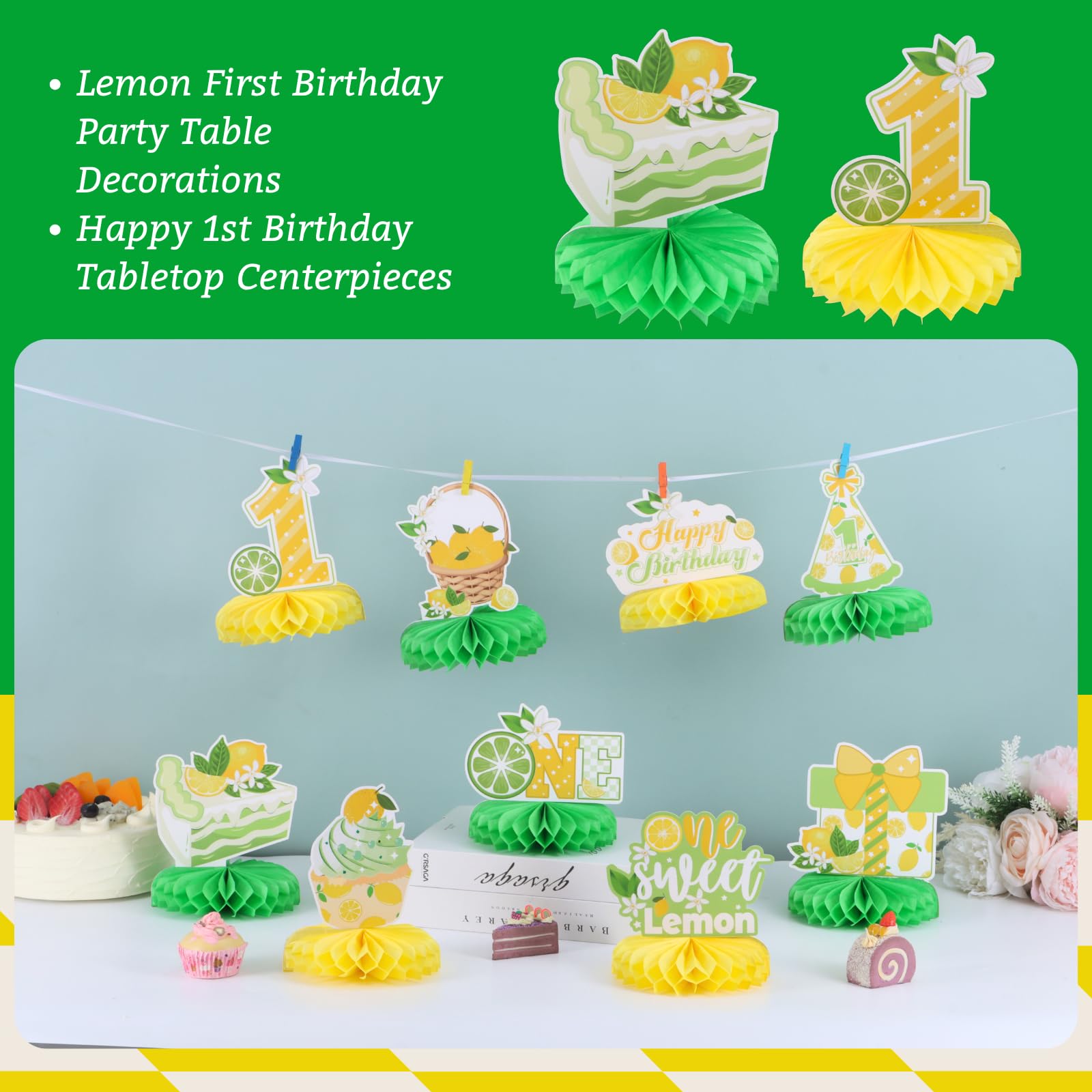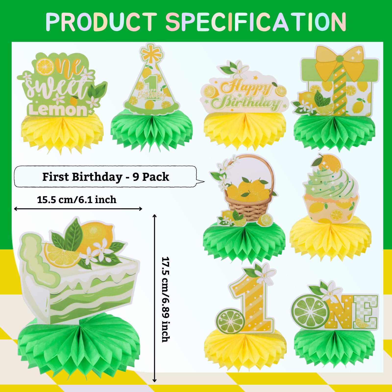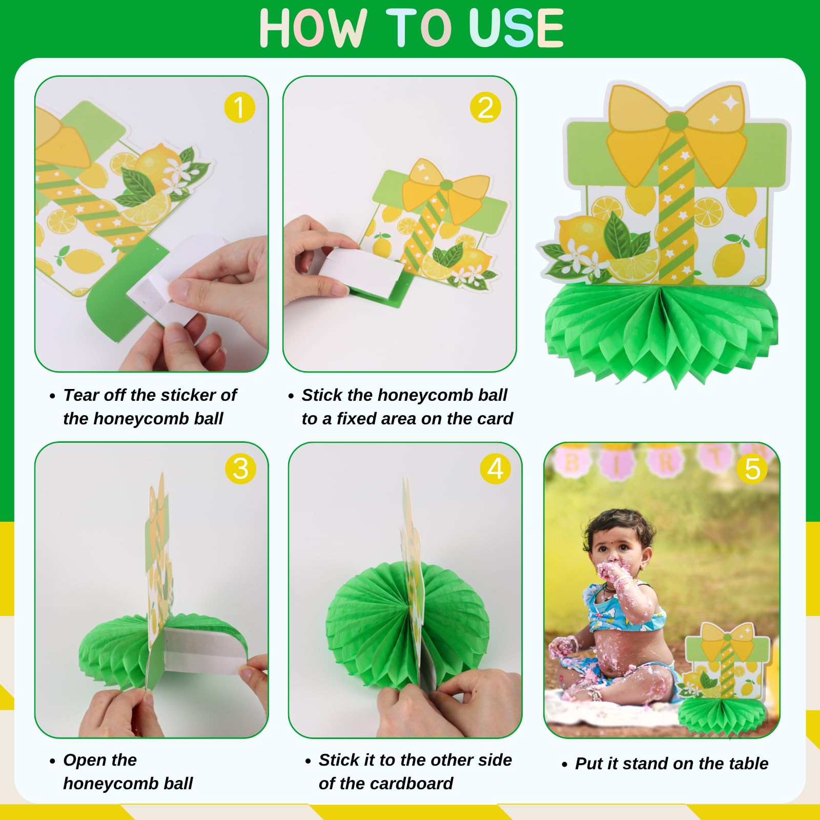 First Birthday Party Decorations: Celebrate your child's one birthday with our honeycomb centerpieces. Adorable double sided lemon elements and sweet desserts patterns are in a beautiful combination of yellow and green, which will add much touch of charm to first birthday party decoration and feel like sweet times