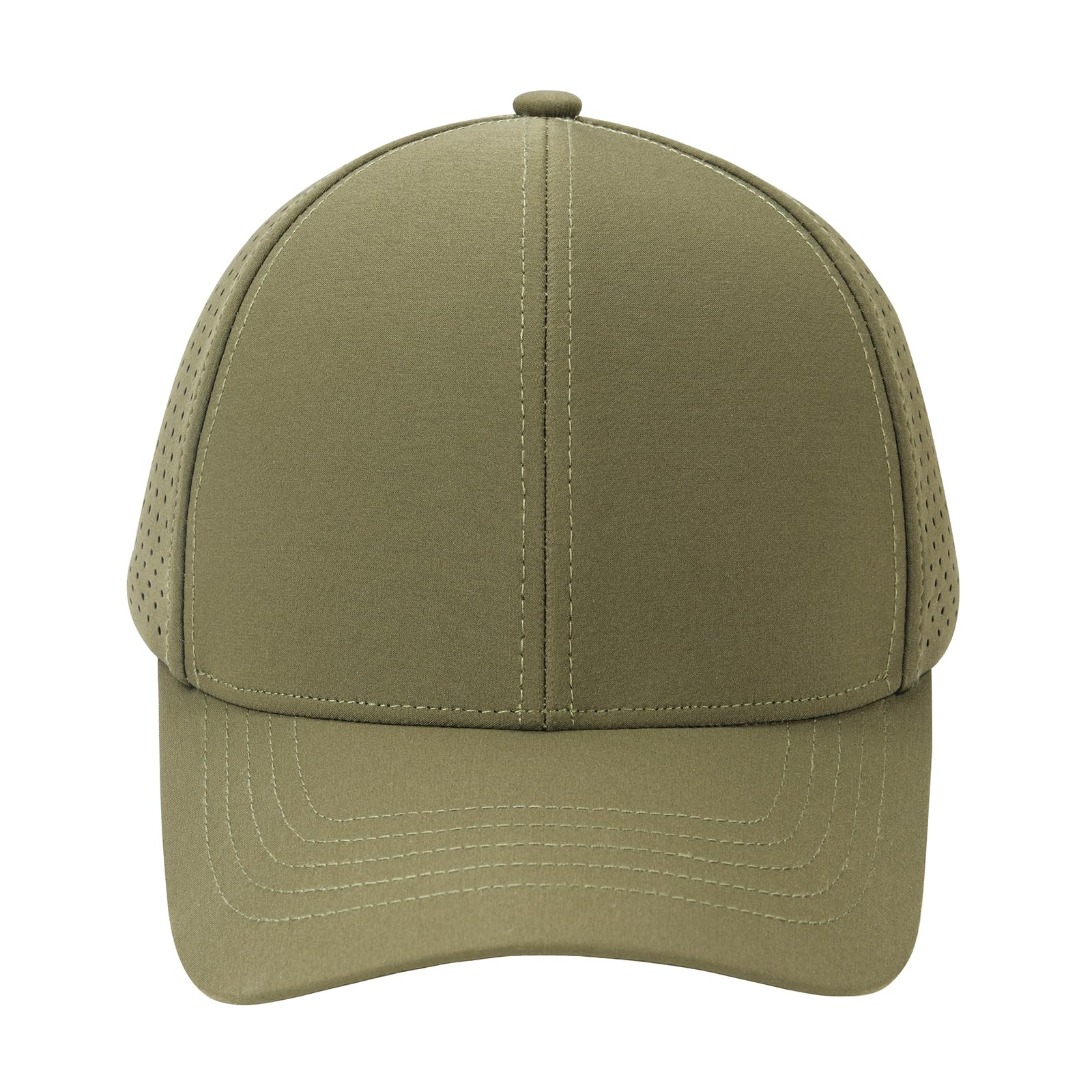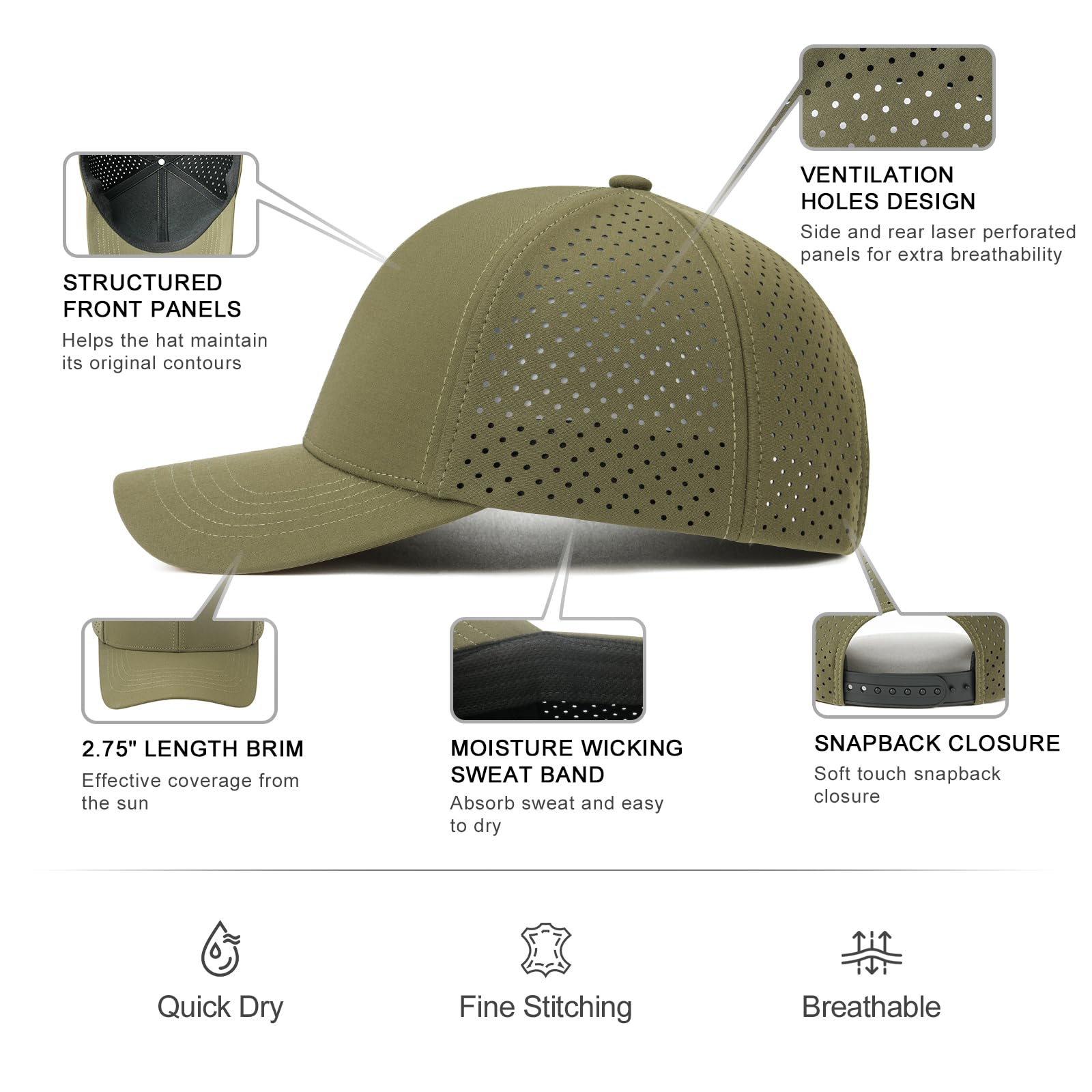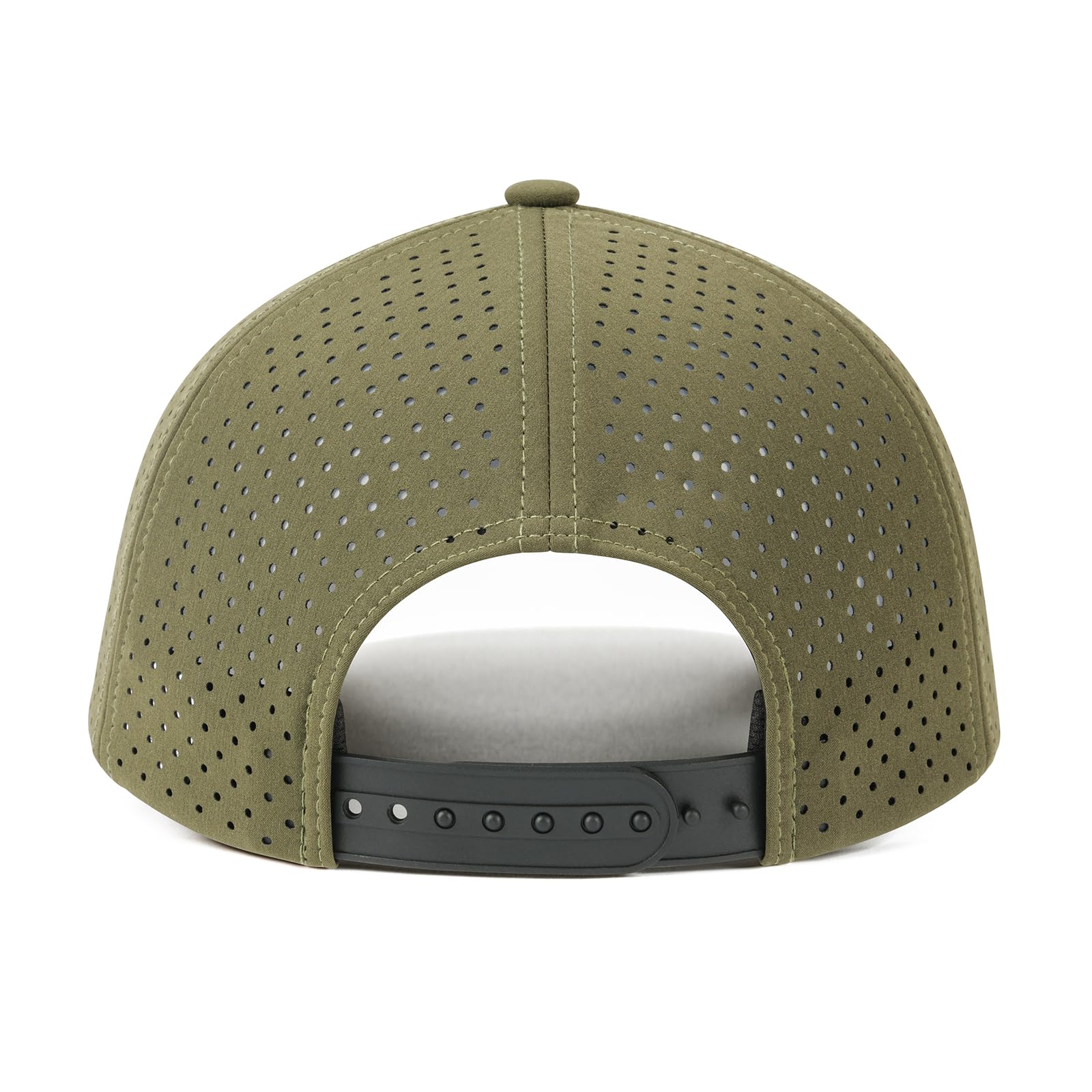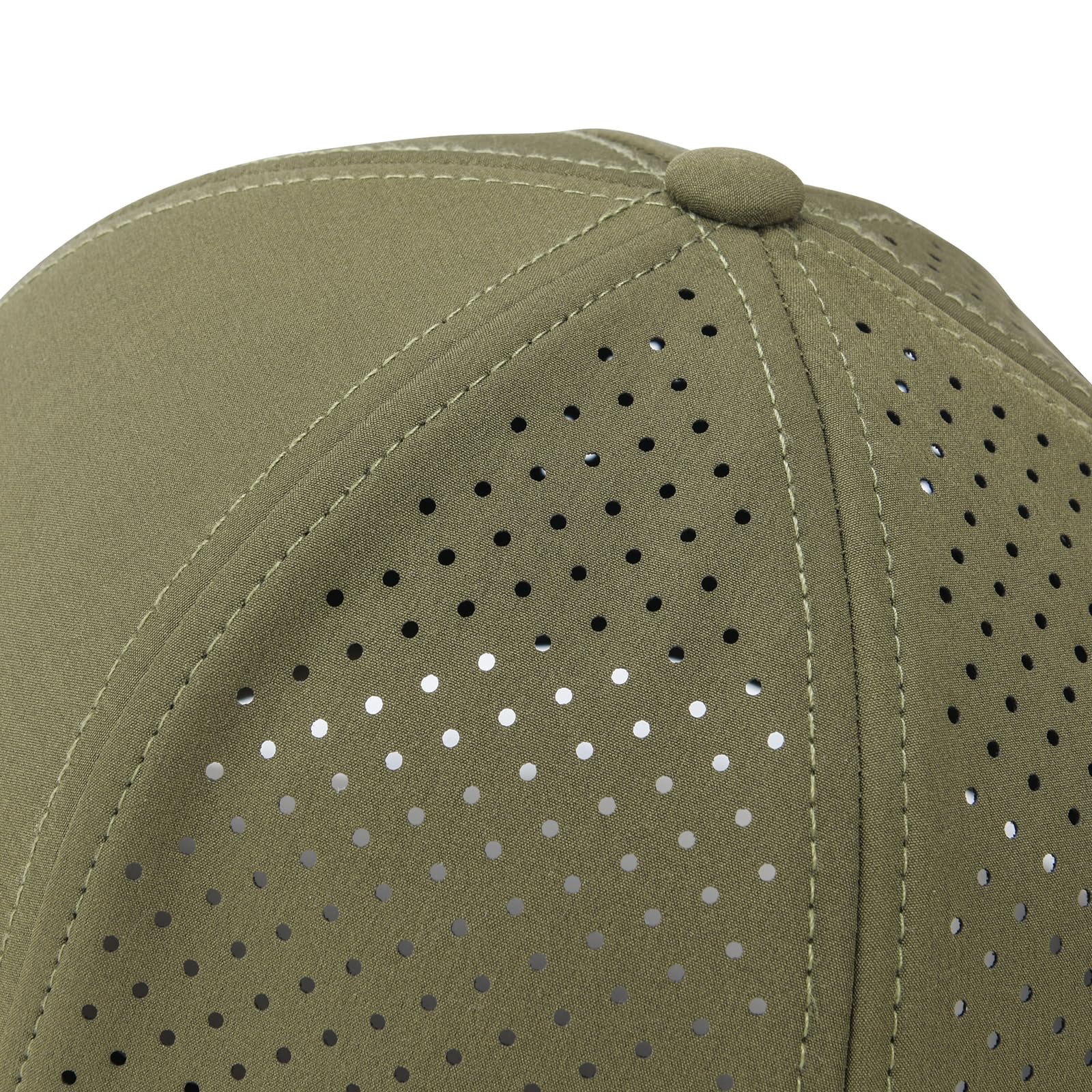 Design: structured front panels, 6-panel cap, curved brim, laser-perforated side & rear panels for breathability, and soft touch snapback closure