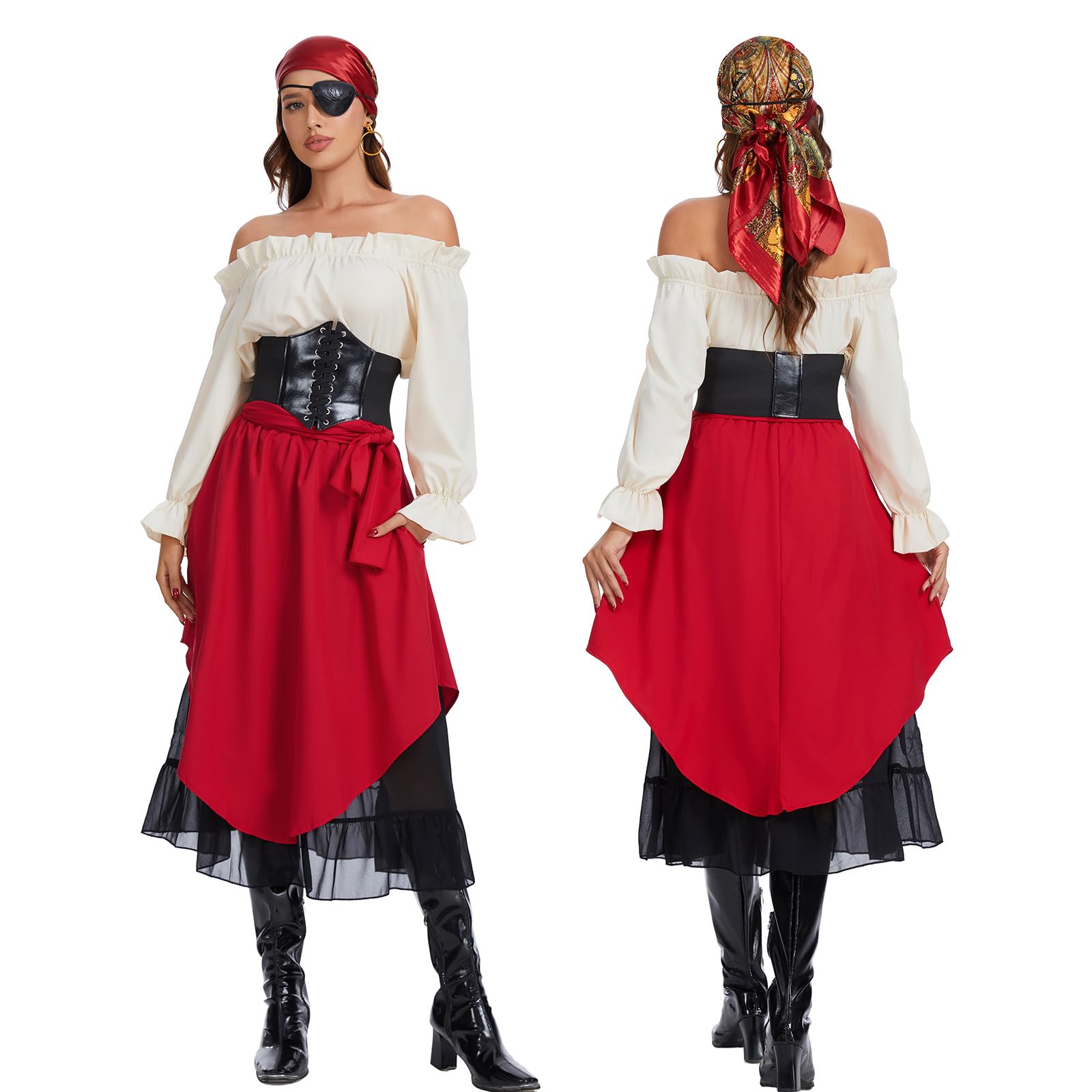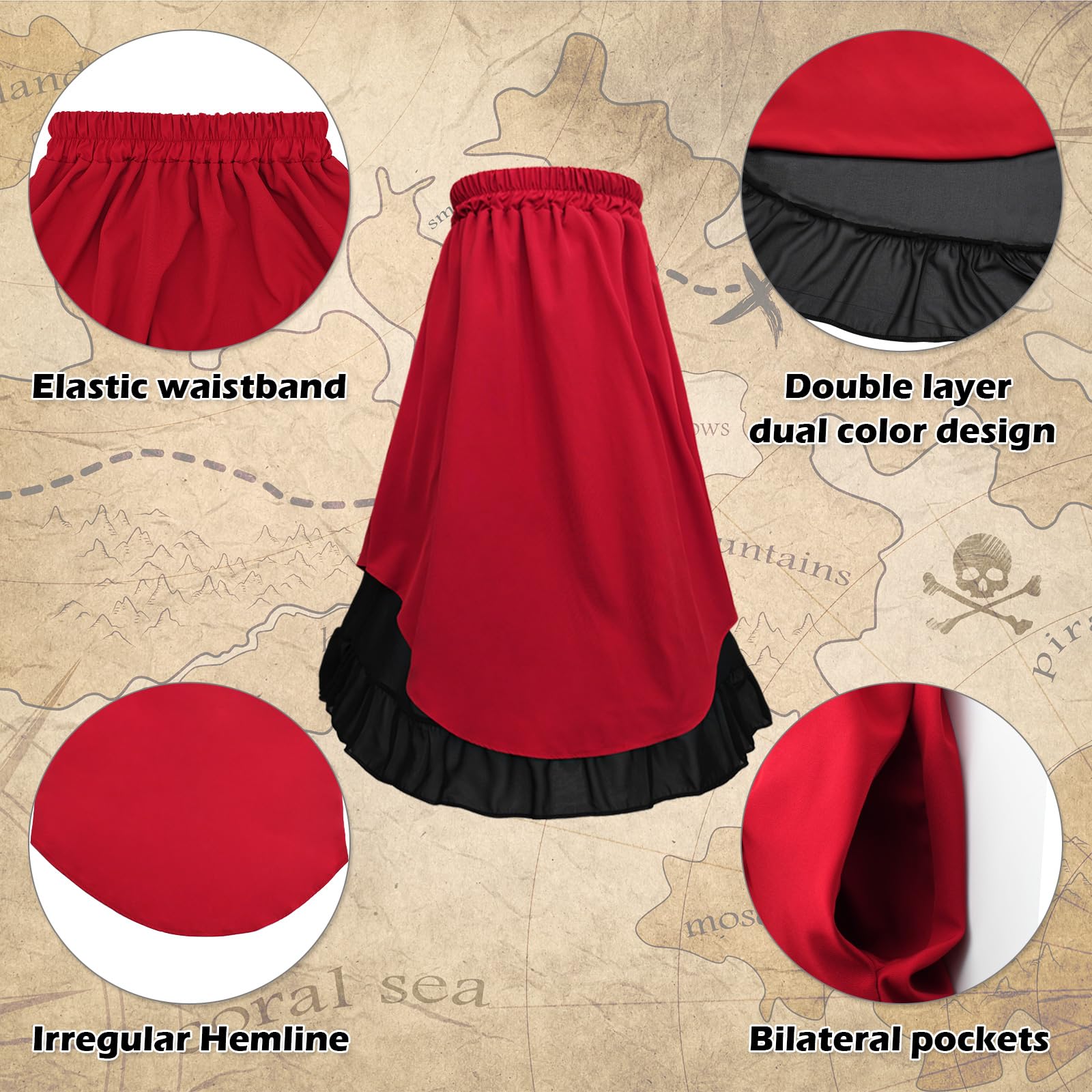 Women's Pirate Costume Set:1 x Renaissance Top, 1 x Pirate Skirt, 1 x Corset Belt, 1 x Pirate Bandana, 1 x Pirate Sash, 1 x Eyepatch, 1 x Earring for your party or cosplay needs.