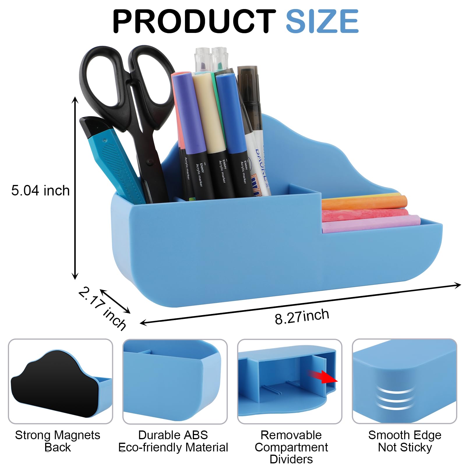 Upgraded Magnetic Pen Holder:Magnetic marker holder adopts adjustable divider design,there are a movable divider and 2 slots inside. There is also an extended small compartment that can hold small clips, chalk, or sticky notes.Magnetic dry erase marker holder's dimensions is 8.27L x 2.17W x 5.04H inches,you can choose your storage Organizer of different sizes as you like.