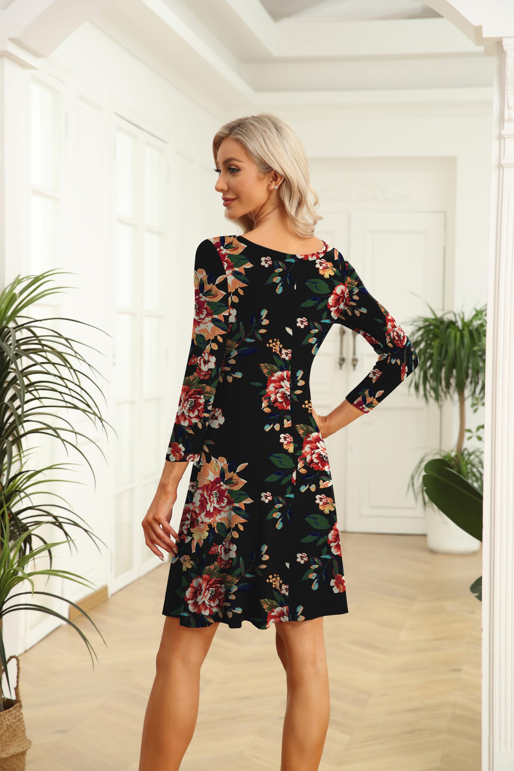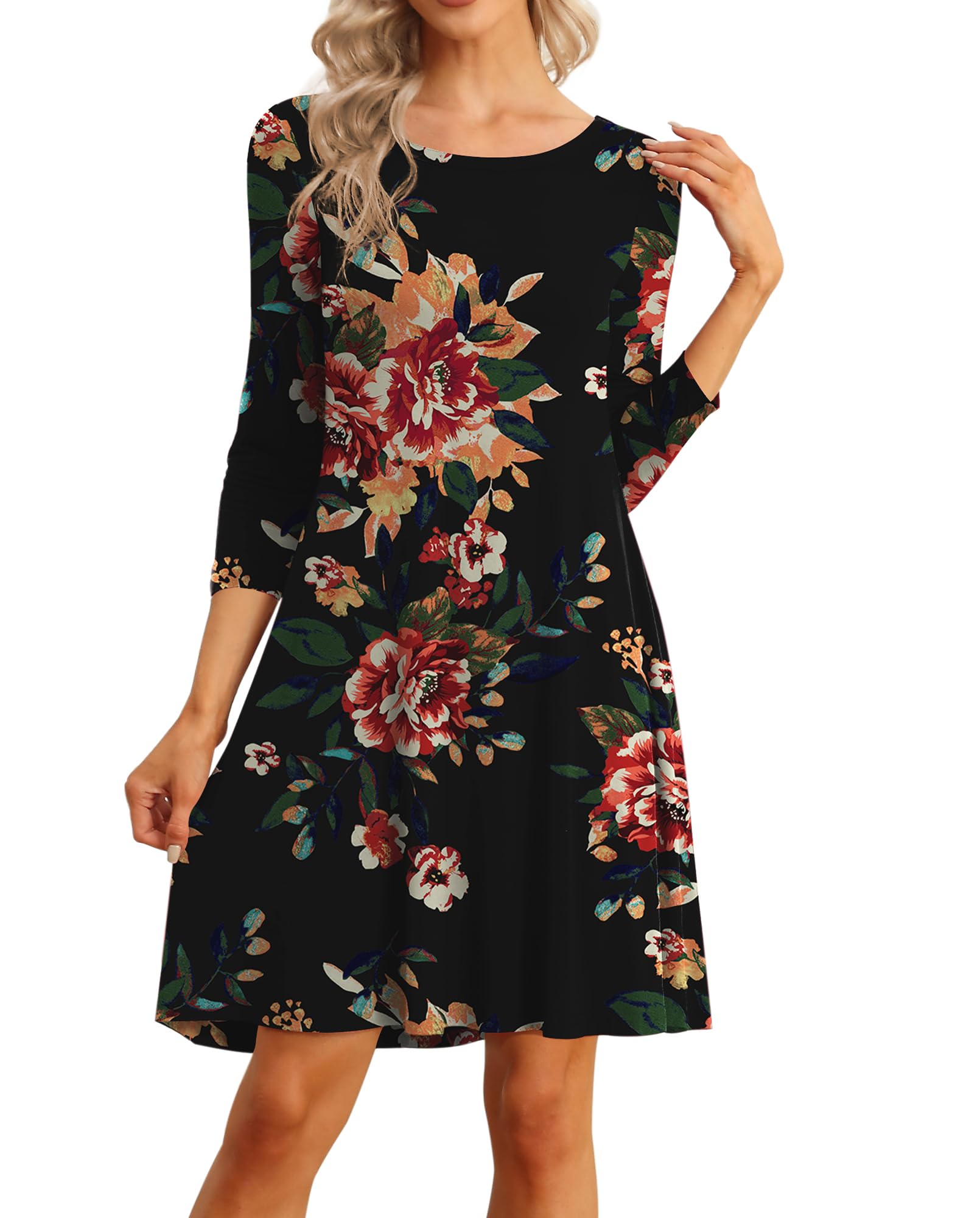 Features: casual basic style, A-line silhouette, 3/4 sleeves/sleeveless ,round neck, super soft.the casual dresses is above the knees and long enough that you wouldn't need to wear leggings with it if you didn't want too.It's a swing style so it would fit comofrtably over large hips.the pockets are such a nice addition,it's loose enough but not baggy.