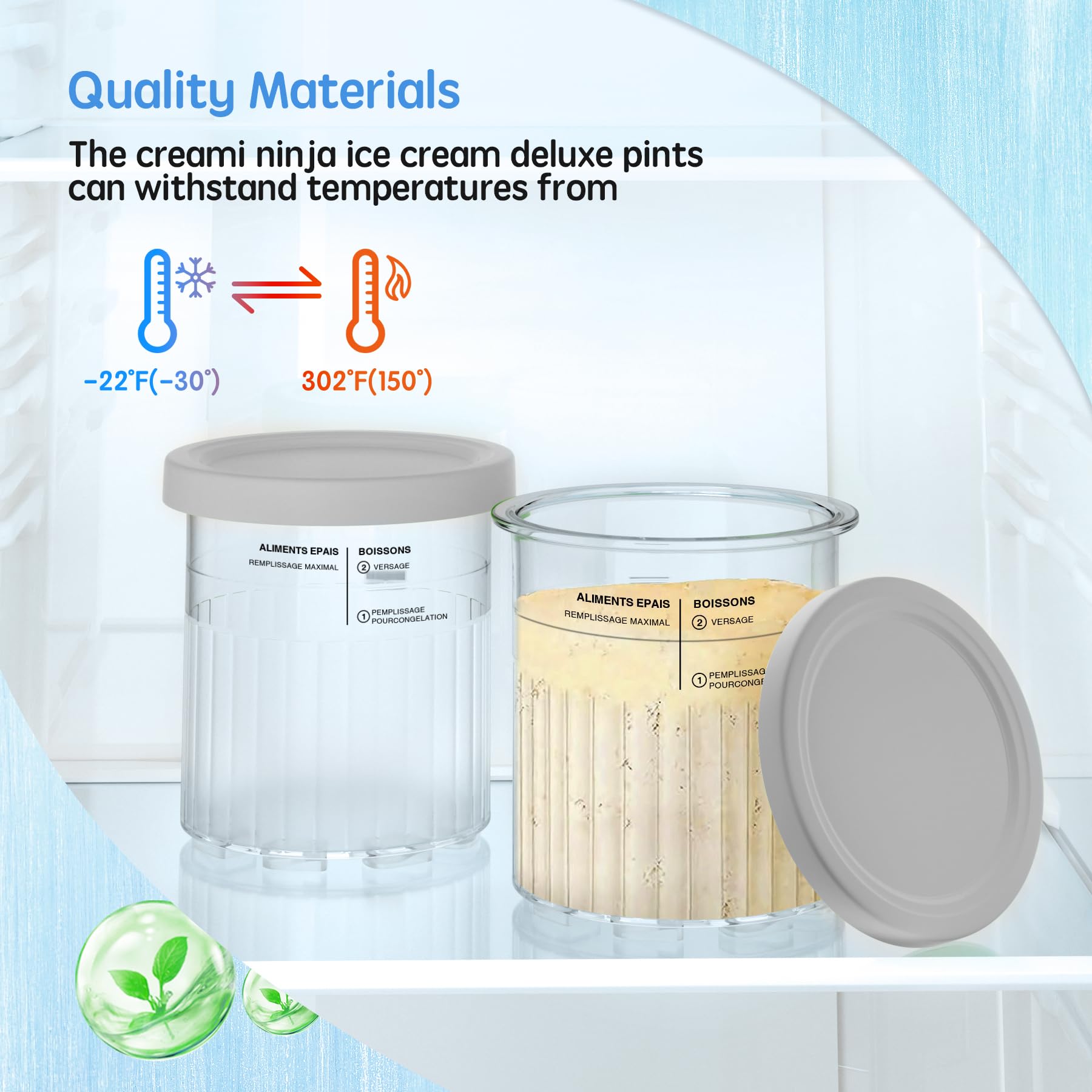 PERFECT FIT MODEL: Compatible with Ninja NC500/NC501 Creami Deluxe 11-in-1 XL Ice Cream Makers. 24 OZ transparent pints with 4 grey lids - perfect for creating multiple ice cream varieties simultaneously, while making different flavors of ice cream for family & friends.
