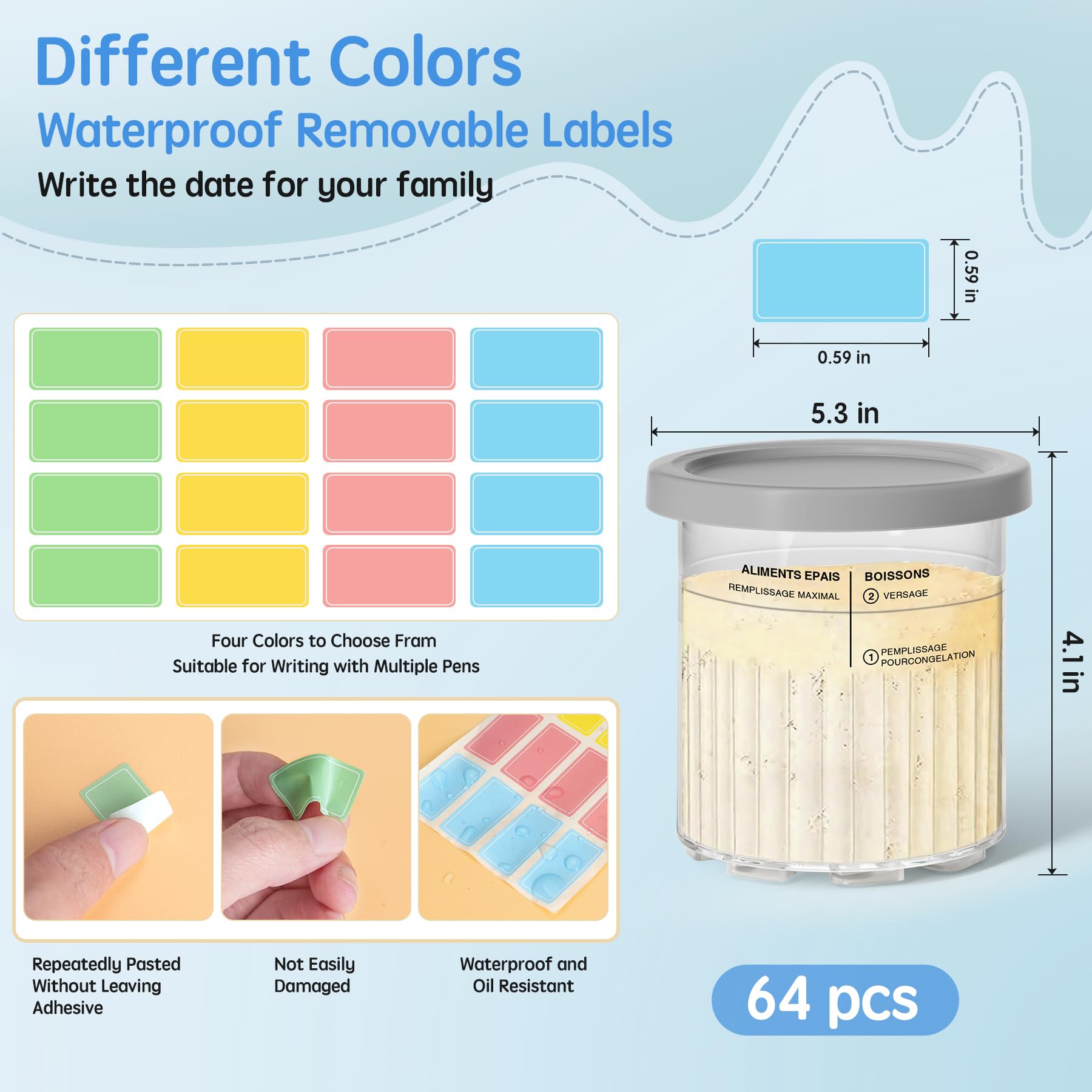COMPLETE MATCHING SET: This set comes with 4 pints, 4 lids, 4 spoons, and 1 metal scoop, 64pcs assorted colors waterproof removable labels can be writen flavor names/dates with pen and remove residue-free - ideal for allergy warnings or recipe experiments. Labels withstand freezer condensation without smudging.