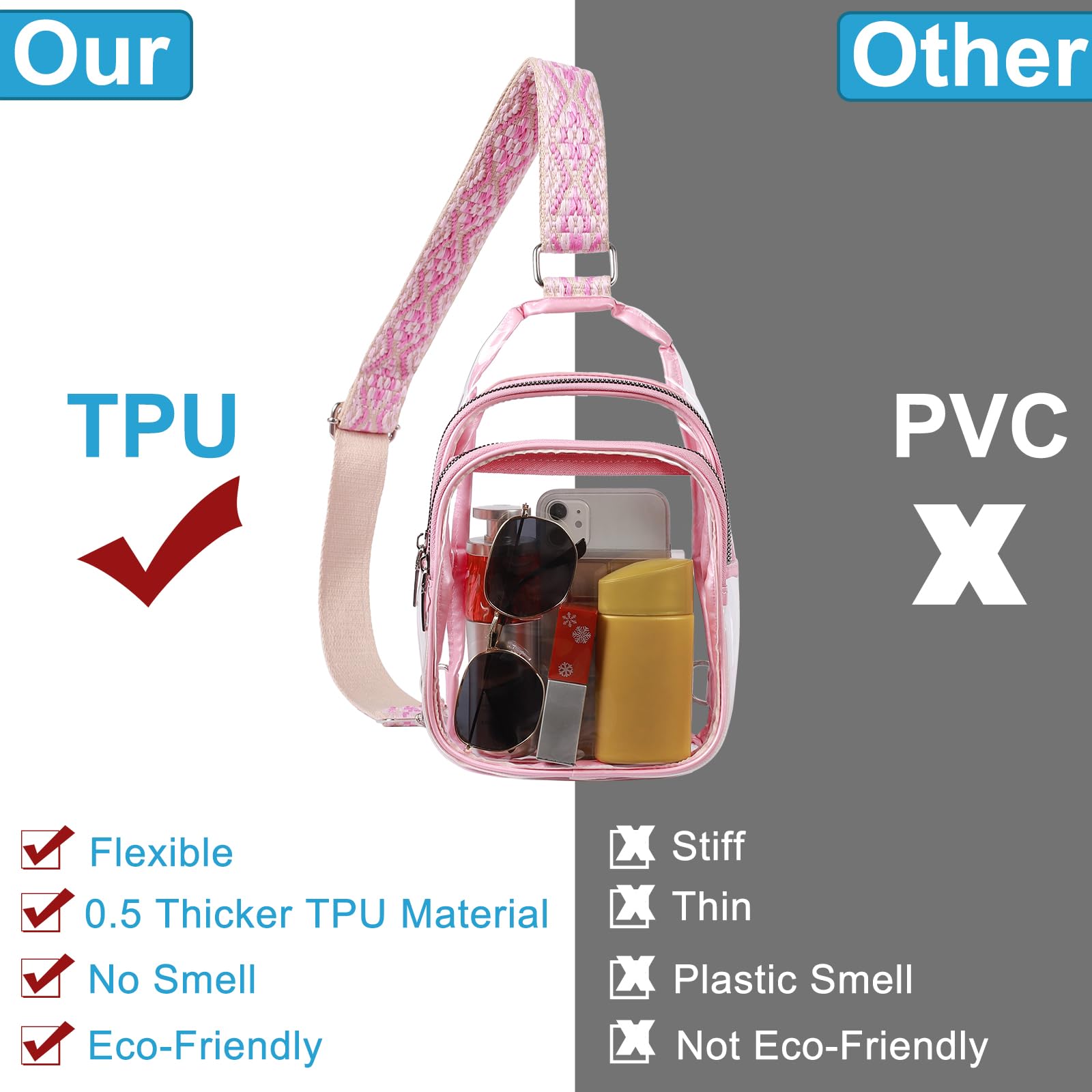 Clear Bag Stadium Approved: CLUCI clear sling bag stadium approved is made of soft and non-toxic transparent TPU which can get through security easily. It’s an ideal choice for country concerts outfits, stadium, airport security check, workplace, daily life or other outdoor activities.