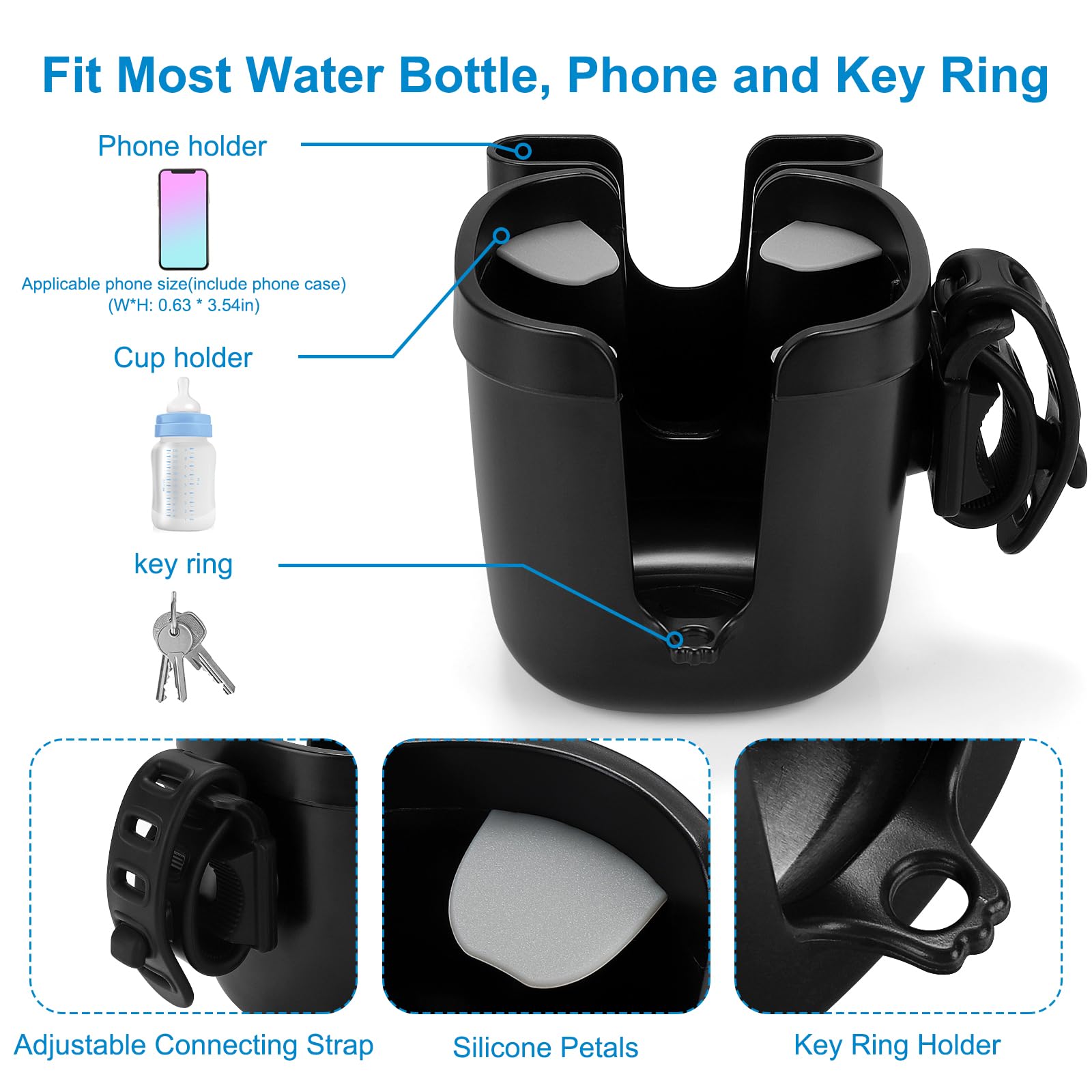 This 3-in-1 stroller cup holder with a phone holder and keys holder, it can load drink bottles, cell phone and your keys at the same time. Compatible with phones up to 6.8 inches in the market.