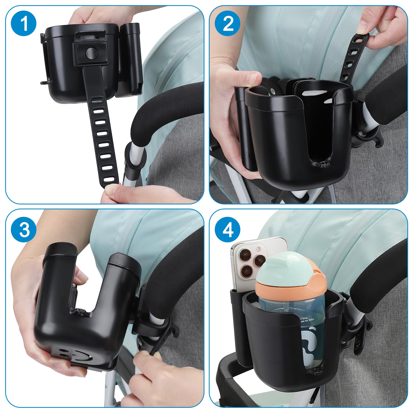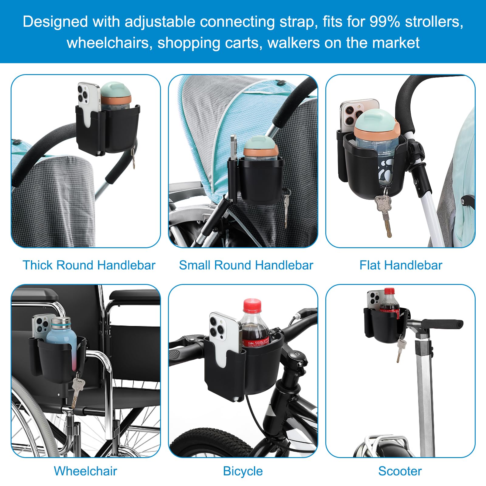 Wide Application: This cup holder is compatible with most baby stroller brands on the market. It fits Uppababy, Nuna, Doona, Baby Jogger strollers, etc. This universal cup holder can also be installed on walkers, wheelchairs, rollators, scooters, bikes, or other devices with a handle or pole.