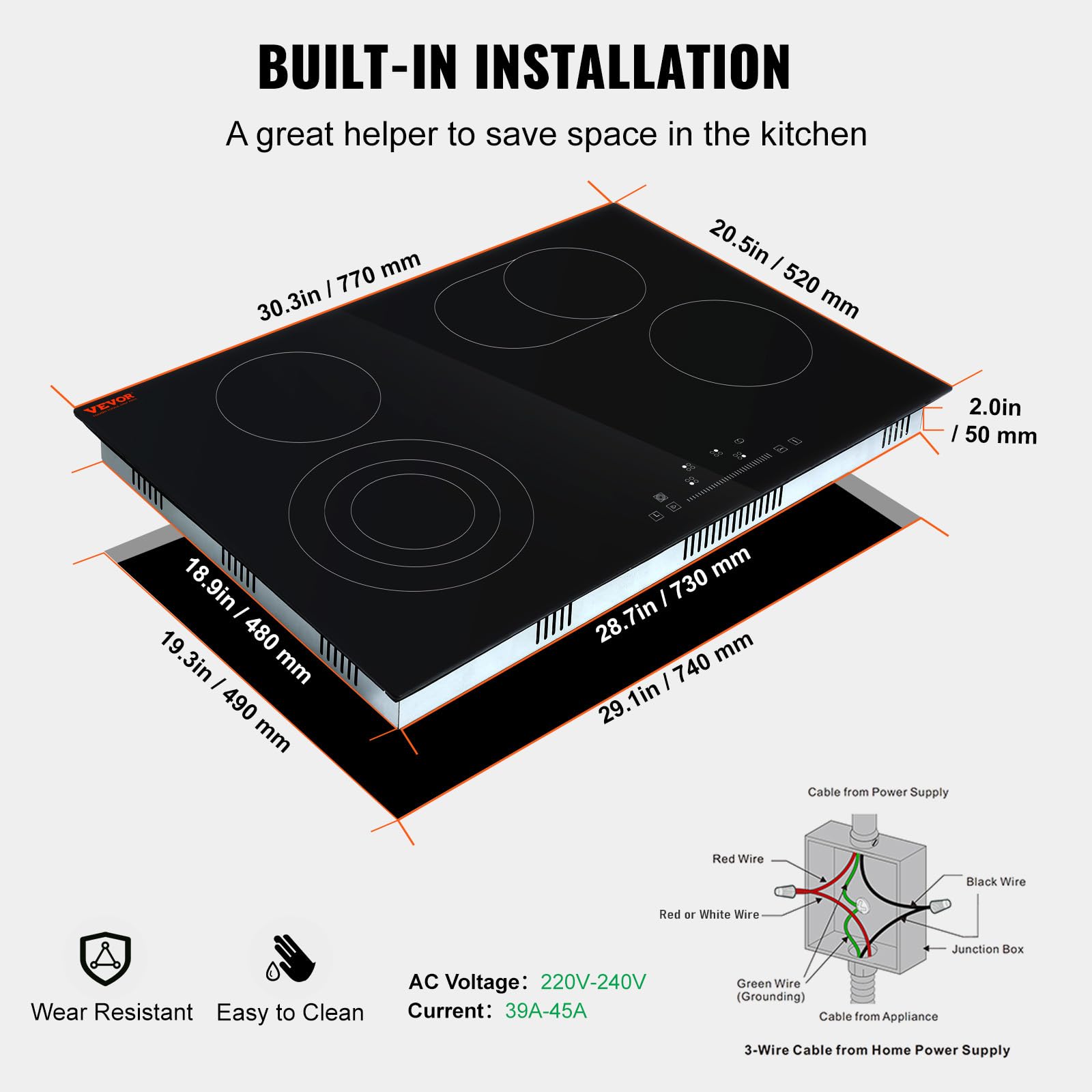 Separate Cooking Zones: Our ceramic cooktop is suitable for 240V, featuring 4 independent cooking zones with a total power of 7200W. With the 29.9 x 19.7-inch cutout size, this cooktop adopts a built-in design, convenient for you to install and saves your kitchen space.