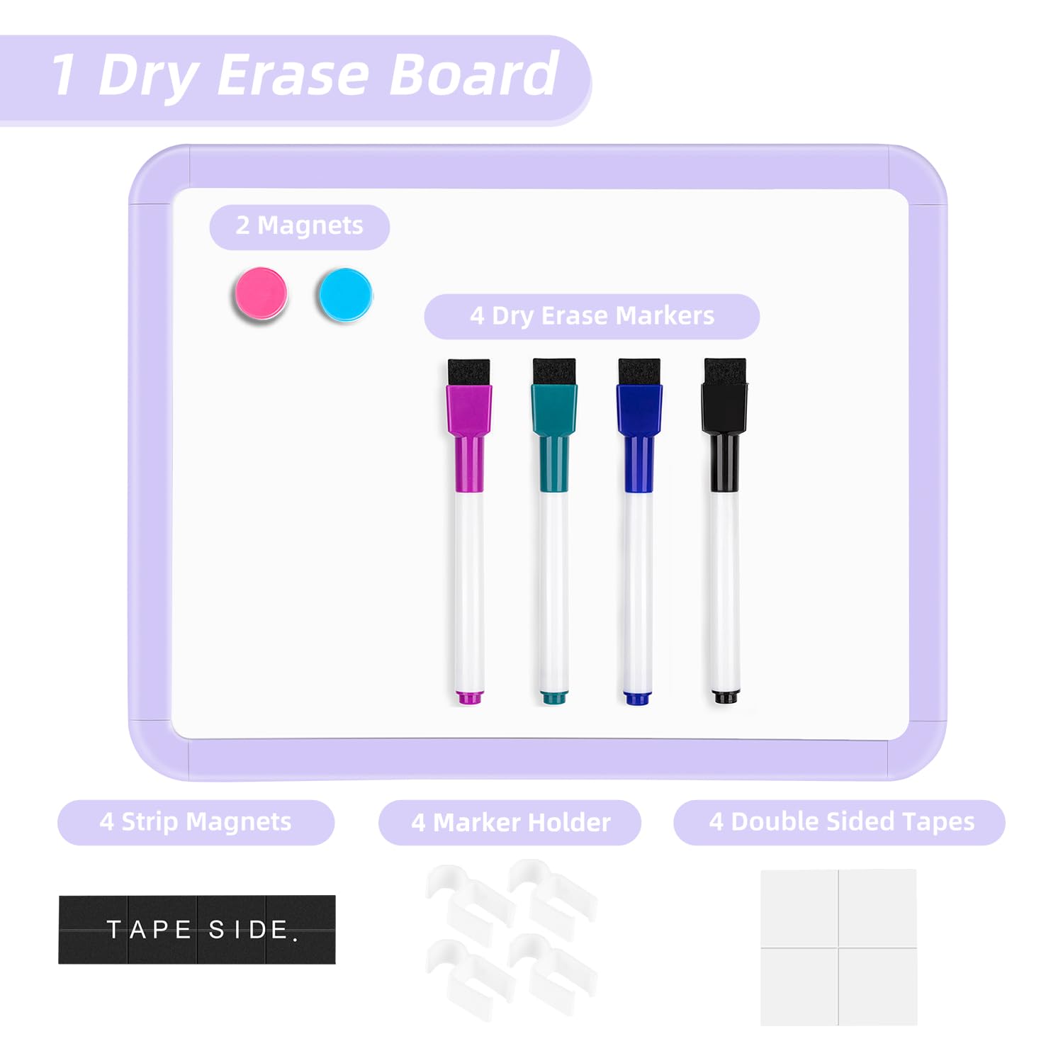 Small white board set comes with 4 dry erase markers and 2 colored magnets.