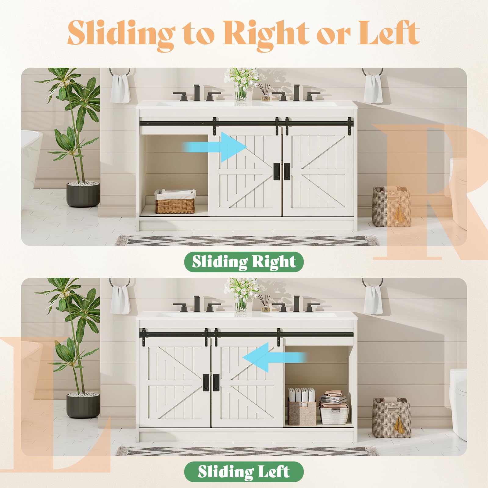 Partitioned Storage Space Design: Large space behind the 2 sliding barn doors can store higher height items, 2 sliding drawers can store normal height items, satisfying your daily wash supplies storage needs