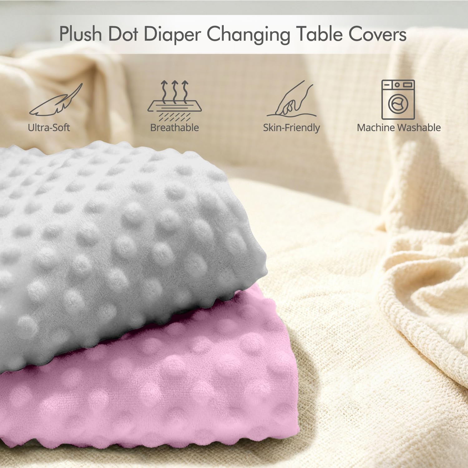 ULTRA SOFT AND SKIN FRIENDLY FABRIC: Our baby diaper changing cover is made of ultra soft plush polka dot fabric and 100% breathable polyester fiber, providing a cloud like comfort for the baby's delicate skin and a soft, comfortable, and warm environment for baby diaper changing