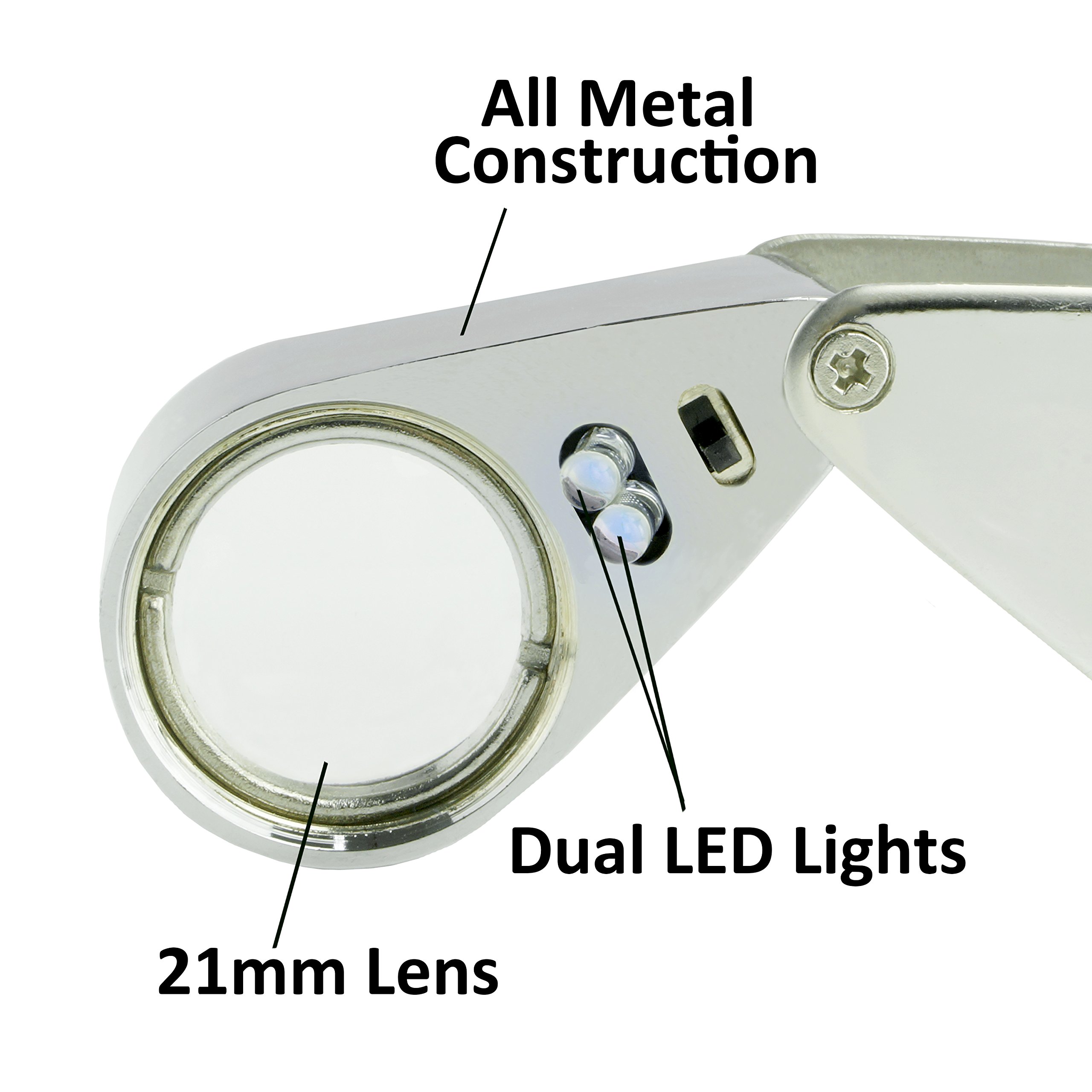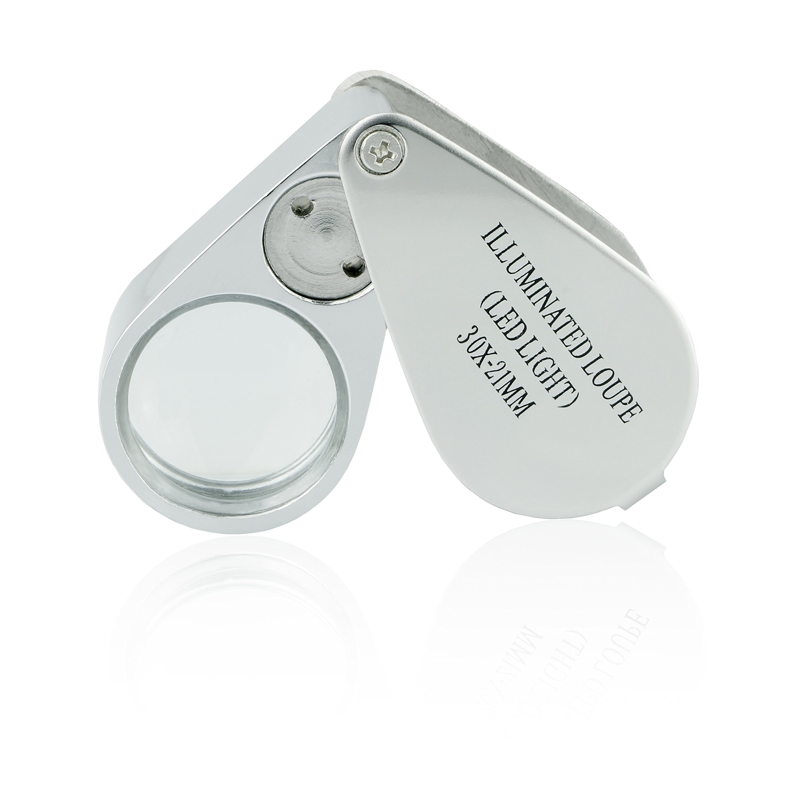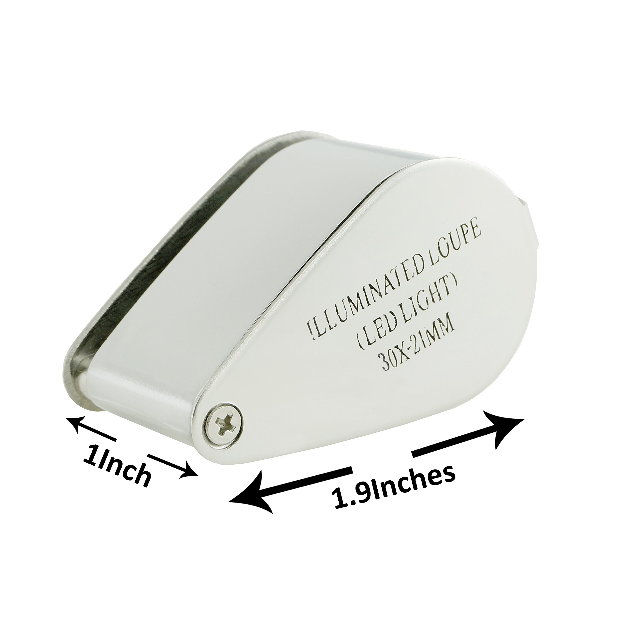 This 30X magnification Illuminated Jeweler Loupe is built from durable metal with an optical glass that is 21 mm in length and has a dual bright LED light.