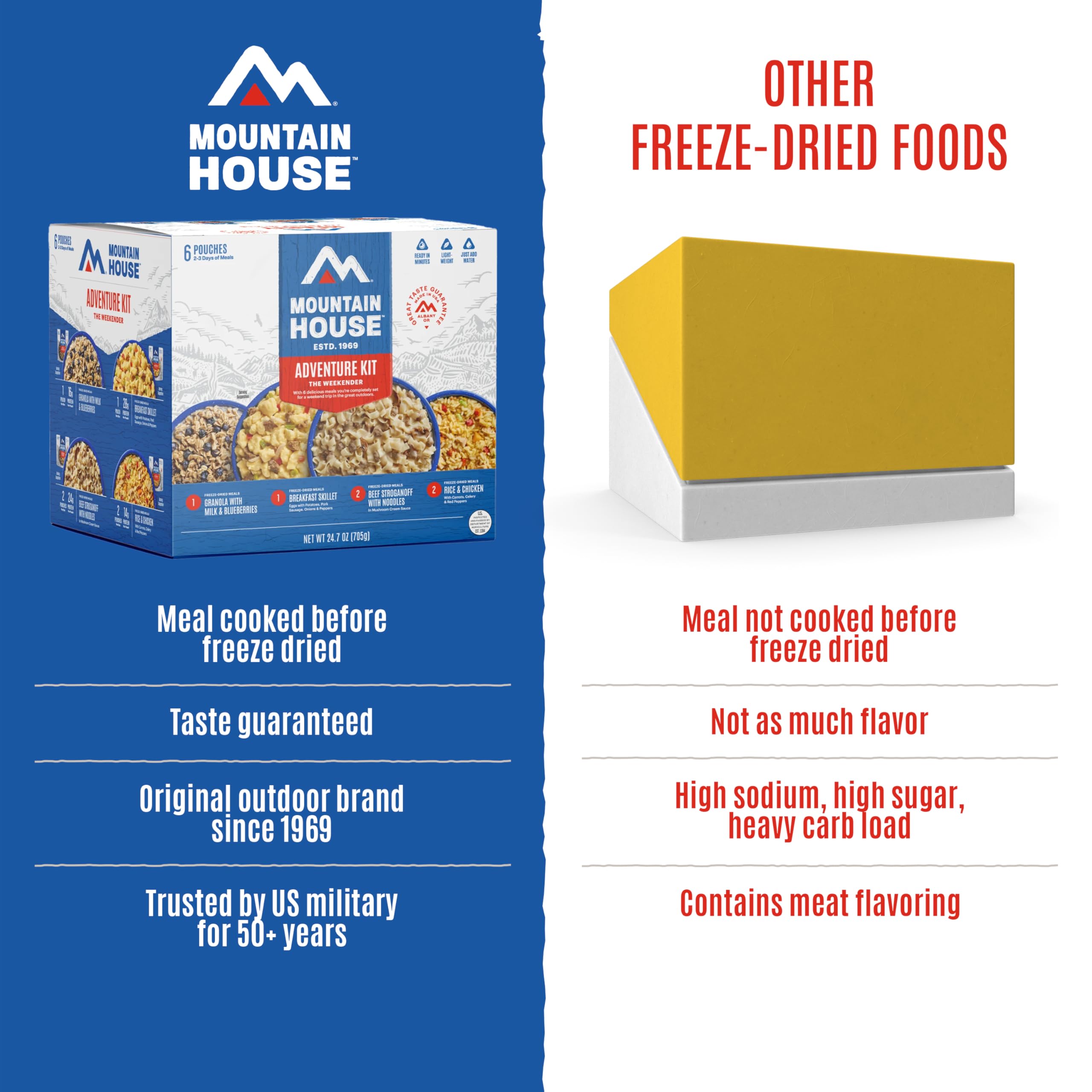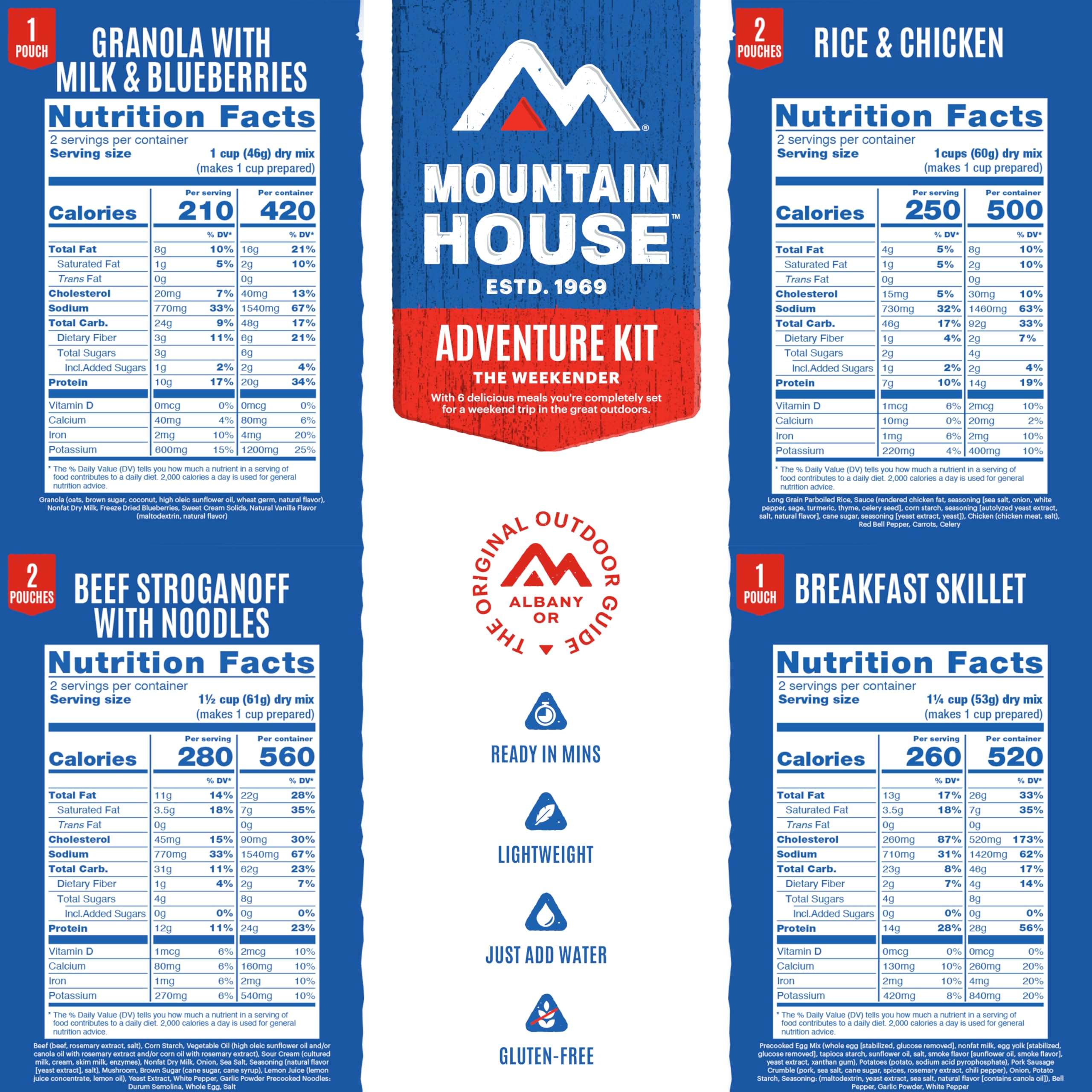 HIGH-QUALITY INGREDIENTS – Mountain House meals are made with high-quality ingredients, never any fillers. Kit provides approx. 1,645 calories per day and contains six total pouches (12 total servings) featuring breakfast, lunch, and dinner: (1) Granola with Milk & Blueberries, (1) Breakfast Skillet, (2) Rice & Chicken, and (2) Beef Stroganoff with Noodles.
