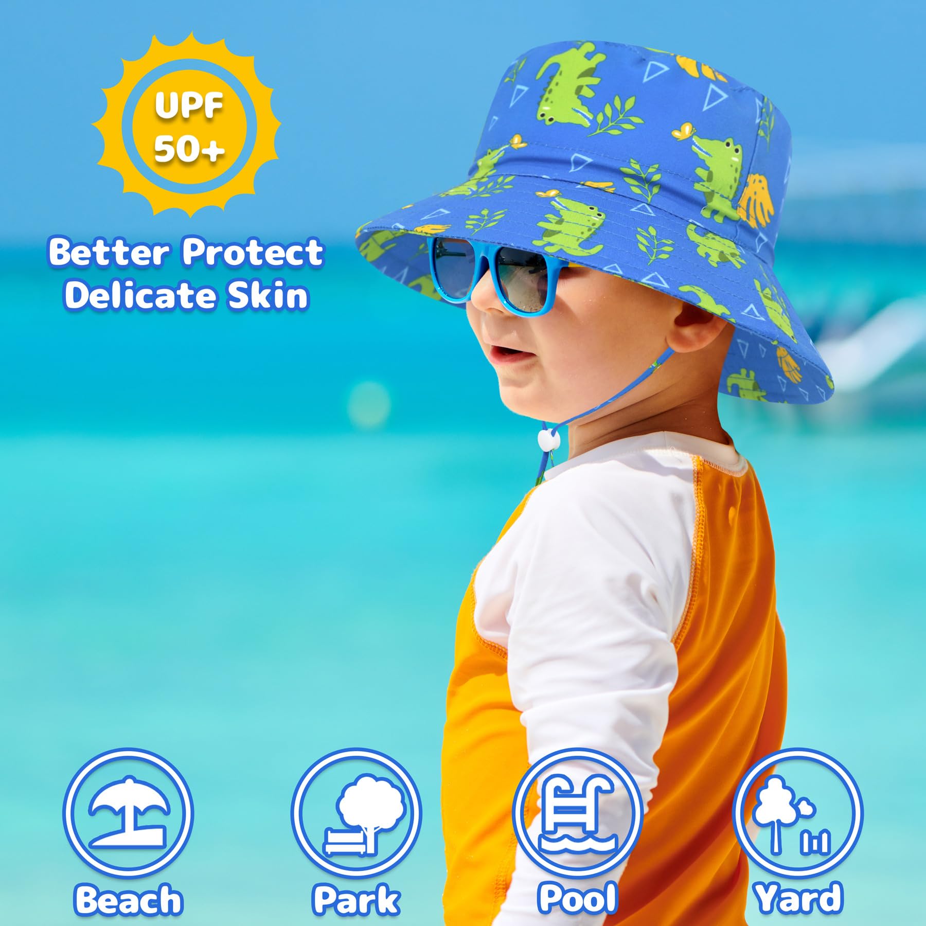 UPF50+ SUN PROTECTION: Our baby sun hats are made of 100% premium polyester, which is super soft, comfortable and skin-friendly. And the floopy wide brim of the baby beach hat can effectively block most of the harmful UVA and UVB rays and provide excellent sun protection when outdoors. Besides, the breathable mesh lining inside of this toddler sun hat can keep baby's head cool and dry even in hot summer. With this toddler beach hat, our baby will play more freely without the sunburn.