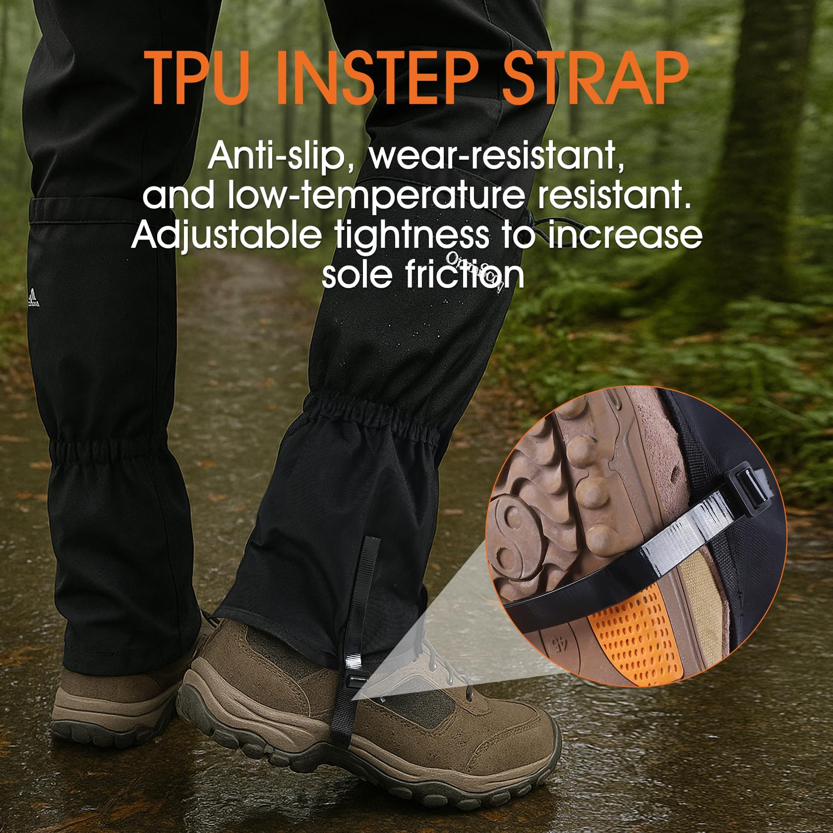 HIGH-PERFORMANCE LEG GAITERS :Equipped with professional-grade TPU straps, our hunting gaiters resist both low and high temperatures. Reinforced stitching enhances durability, no need to worry about wear and tear and breakage.with Durable Metal Buckle, Stay grip to your boots, won't add any hassle for your walking