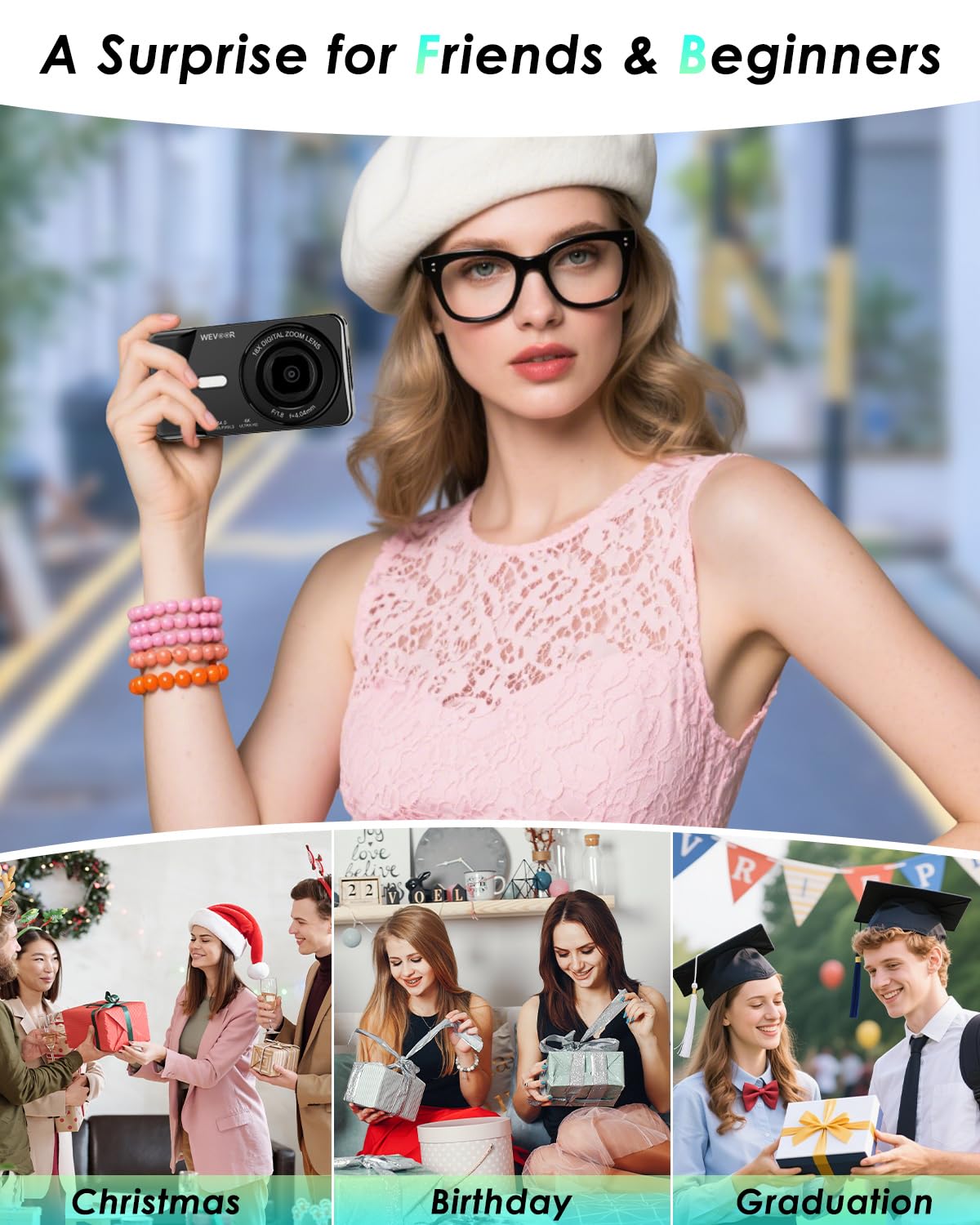 Ultra-Portable & Easy to Use: At just 0.3 lbs (140g), this pocket-sized camera goes anywhere—lightweight and hassle-free. The 2.8" LCD screen with simple one-touch buttons makes it ideal for teens, adult and beginners (no complicated menus!). An ergonomic grip ensures steady one-handed shots while keeping your fingers clear of the lens