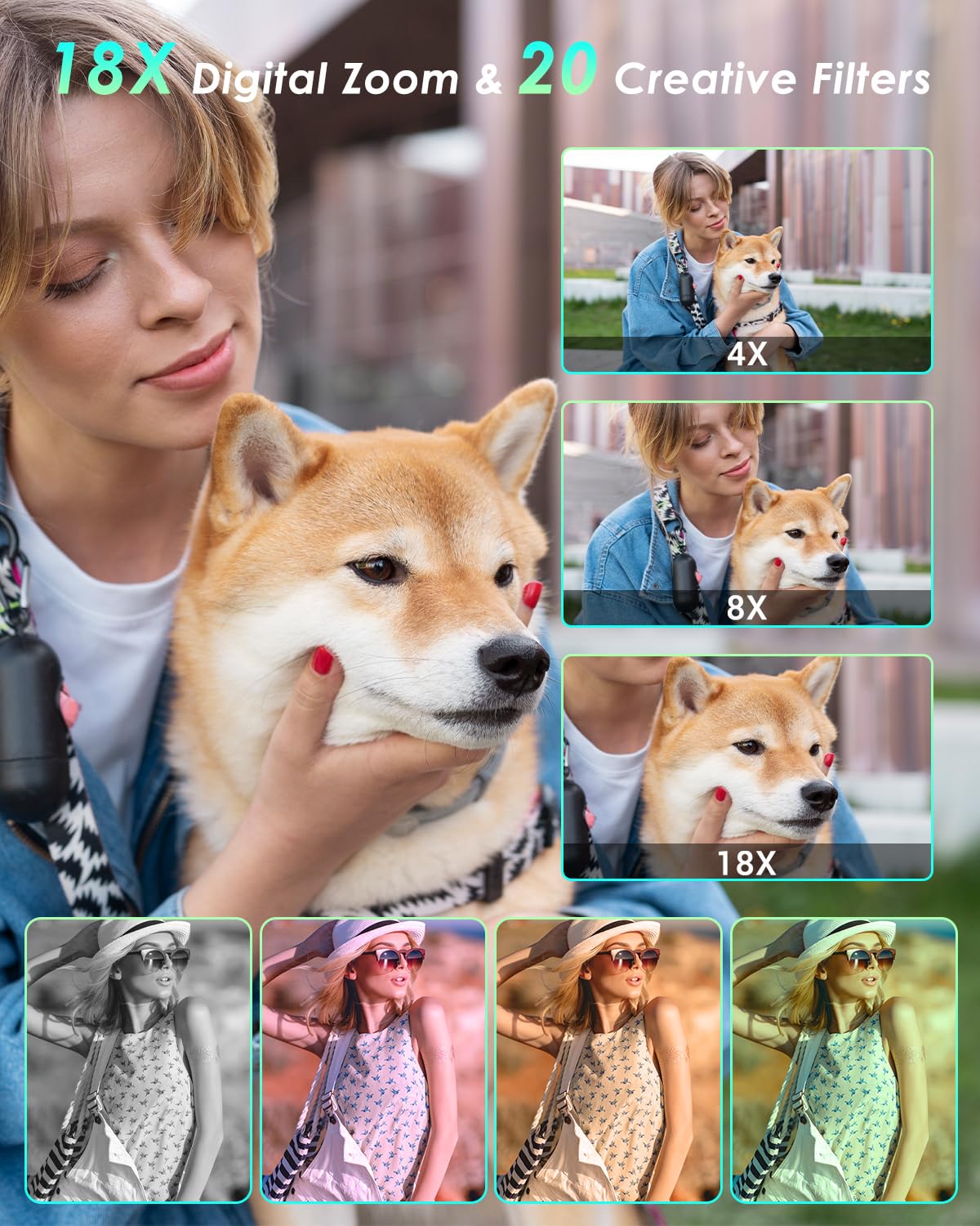 18x Zoom, Flash & 20 Creative Filters: Bring distant subjects closer in stunning clarity with the 18x digital zoom. This point and shoot digital camera also lets you unleash your creativity with 20 fun filters and a beauty mode, enhancing your shots instantly—no editing required. Plus, its powerful built-in flash cuts through the darkness, ensuring your photos are bright and clear, day or night