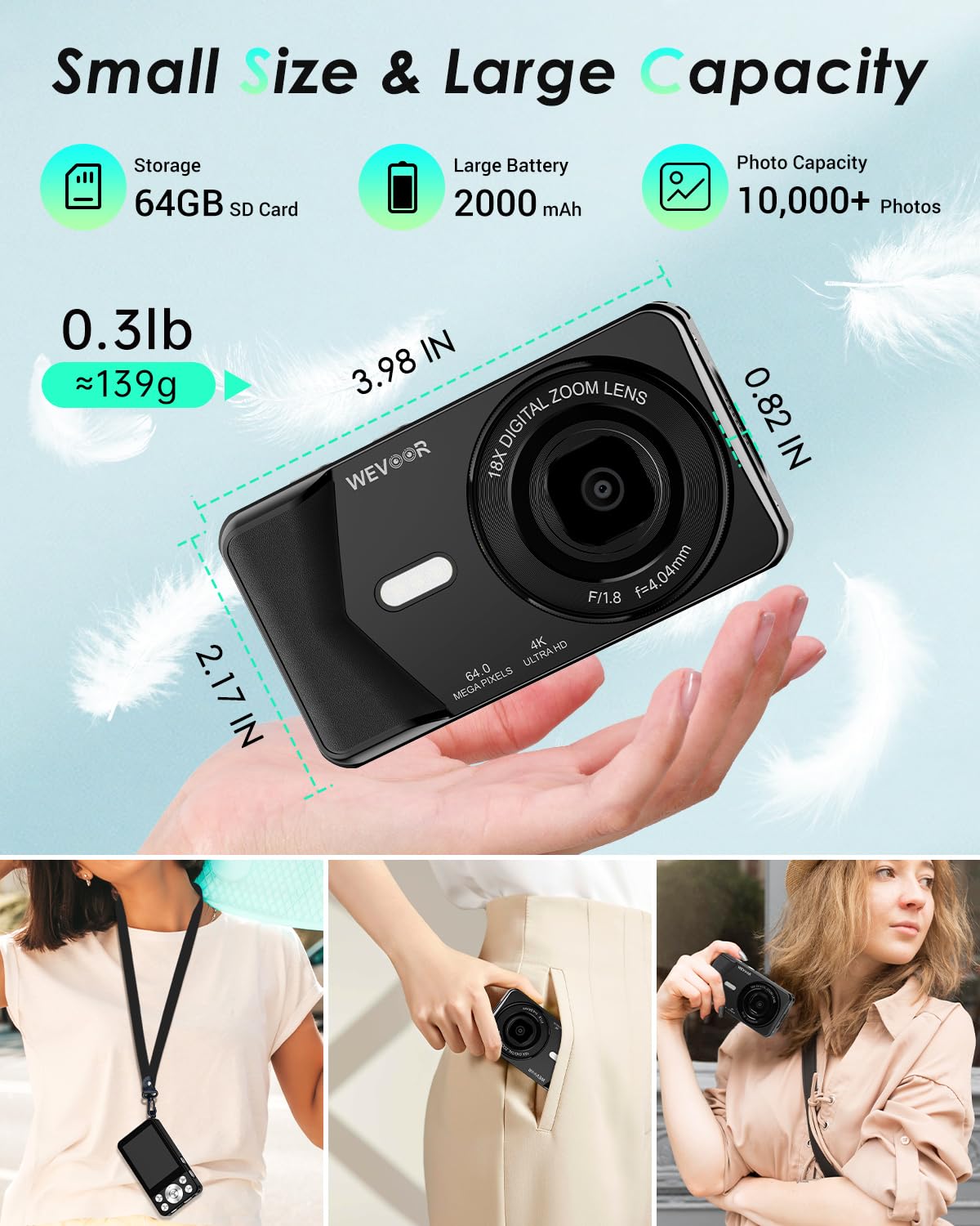 64GB Storage & Extended-Life Travel Companion: Forget battery anxiety and "Storage Full" warnings. Boasting a massive 64GB of built-in storage, the portable camera gives you space for over 10,000 photos or 4+ hours of 4K footage. The high-capacity 2000mAh (well above the industry standard) rechargeable battery keeps you shooting for up to 3 hours straight, so you'll never miss a moment