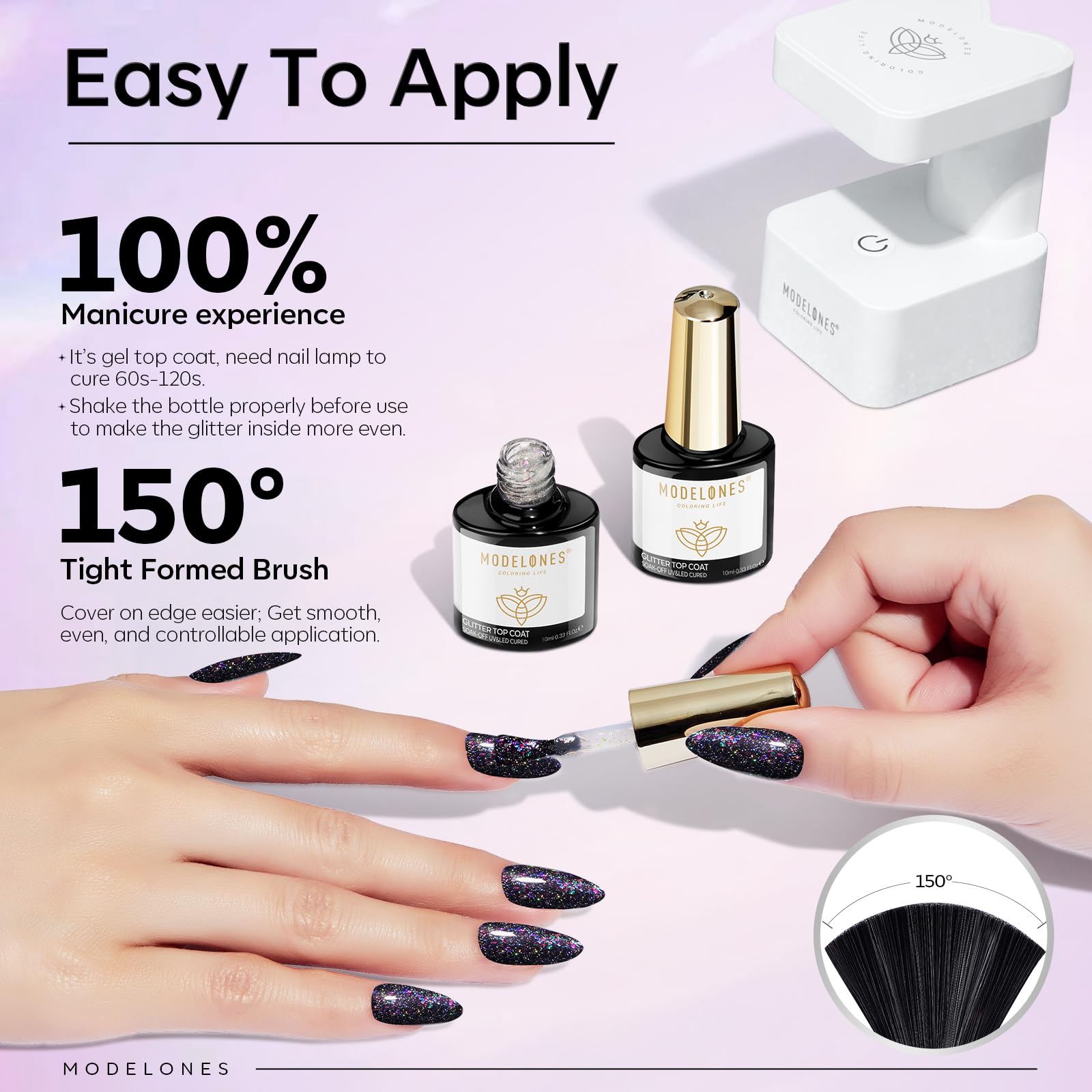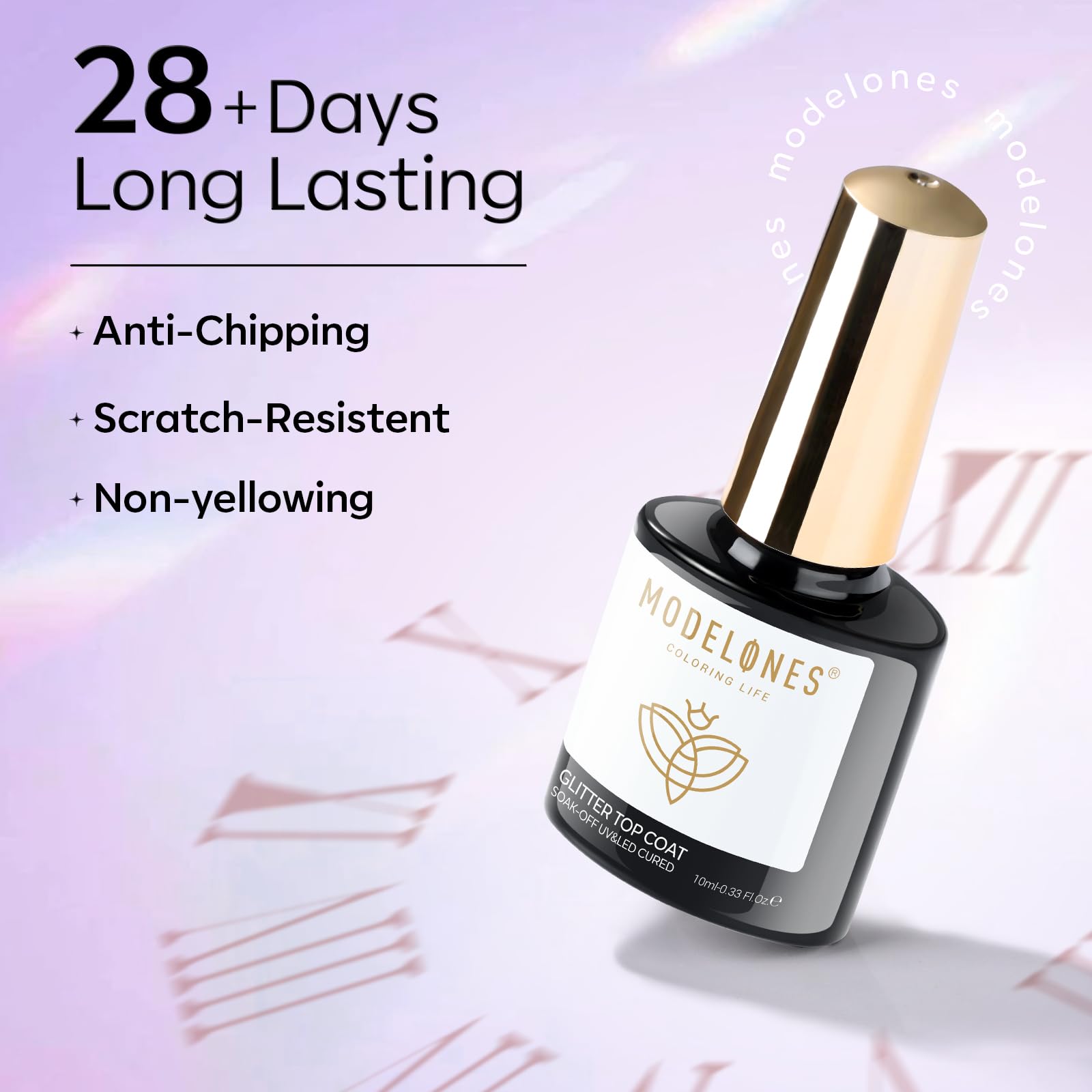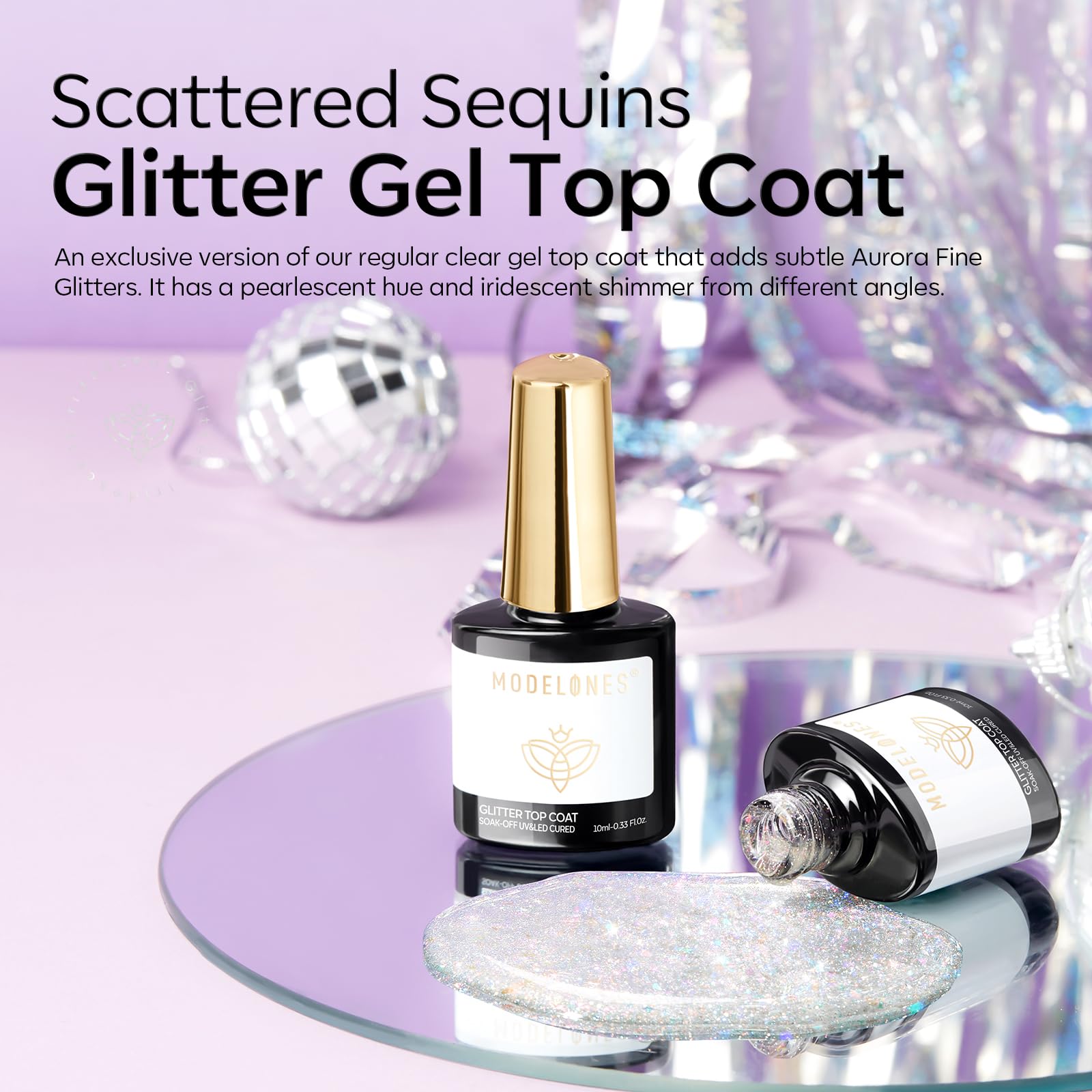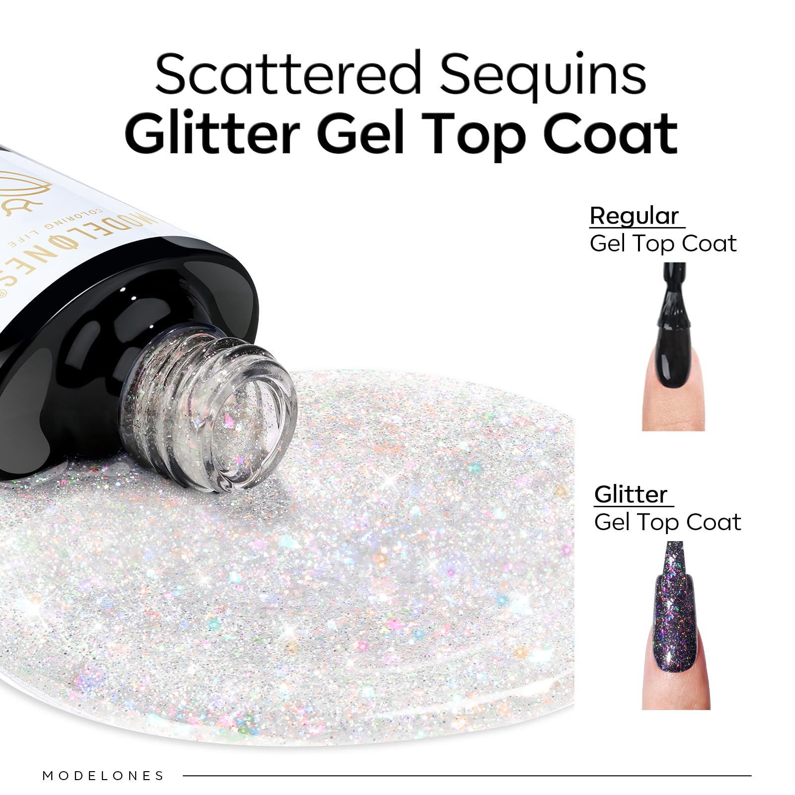 Playful Glitter Top Coat: Modelones 2024 upgrade translucent top coat gel with sprinkled sequins glitter; Adds a vibrant mix of confetti-like glitter to your nails to achieve a festive and fun look, perfect for celebrations or adding a pop of color