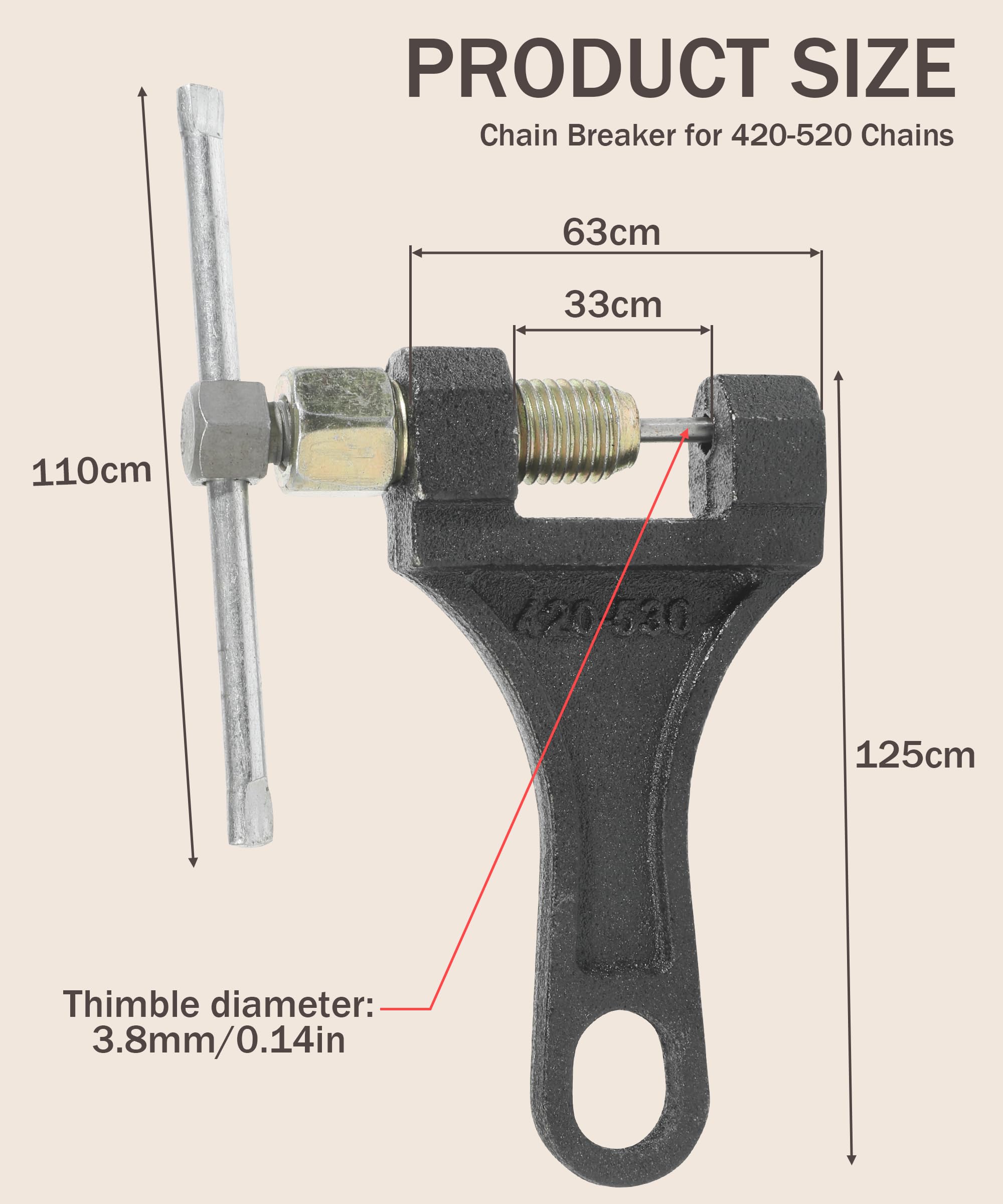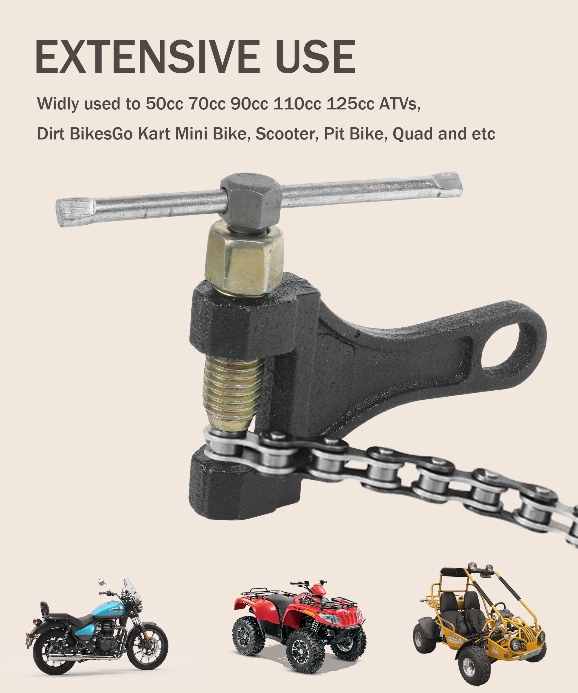[Applicable] This chain breaker is suitable for 420 428 520 525 528 530 roller chains. It is widely used to adjust the roller chain length of 50cc, 70cc, 90cc, 110cc, 125cc ATVs, as well as off-road bicycles, go karts, mini bicycles, scooters, Pit bikes, Quads, etc.