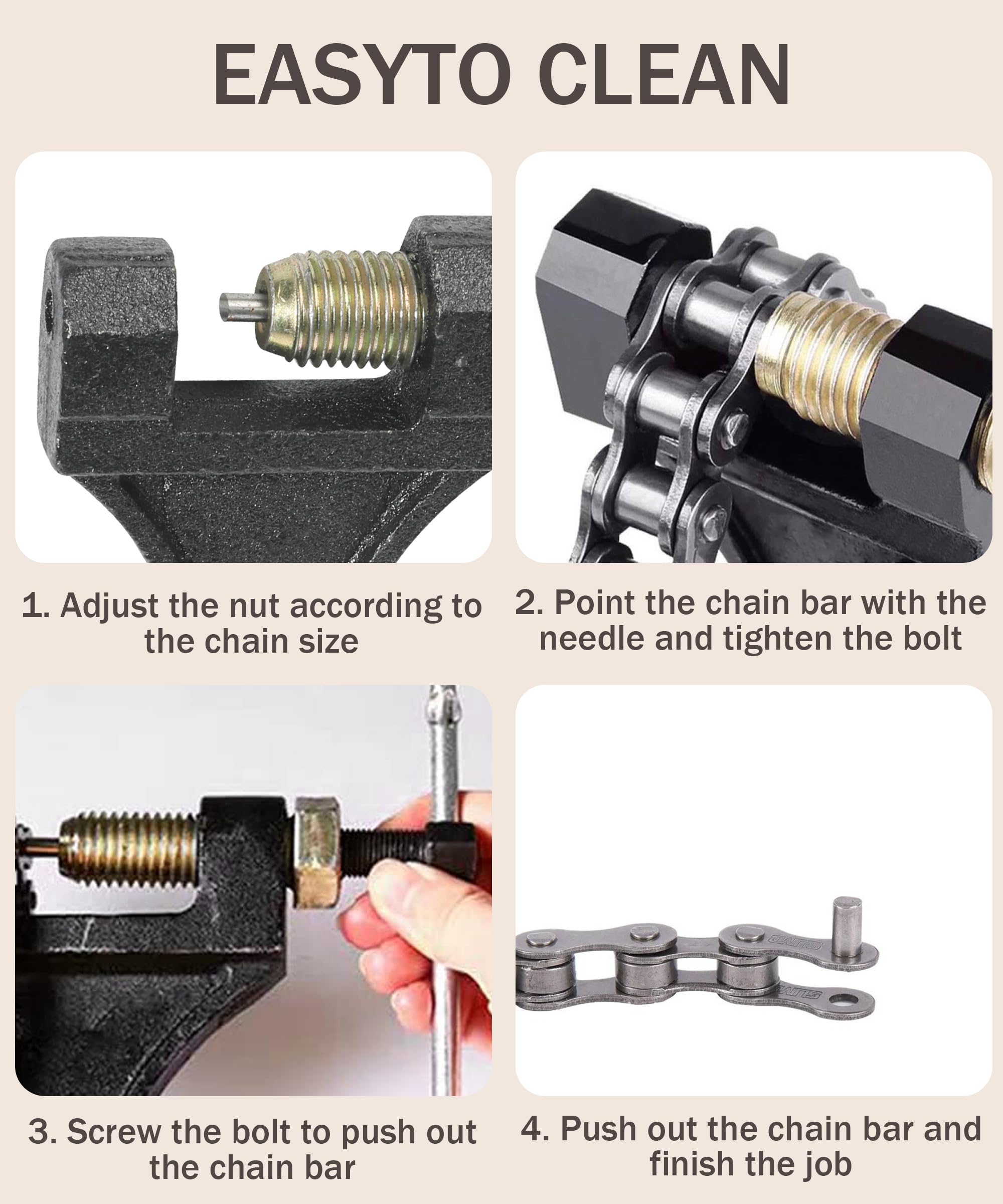 [Suggestion] It is strongly recommended to grind off the chain pin head before using this tool. This will significantly reduce the load on the tool and help prevent premature wear or damage to the fracture tip.