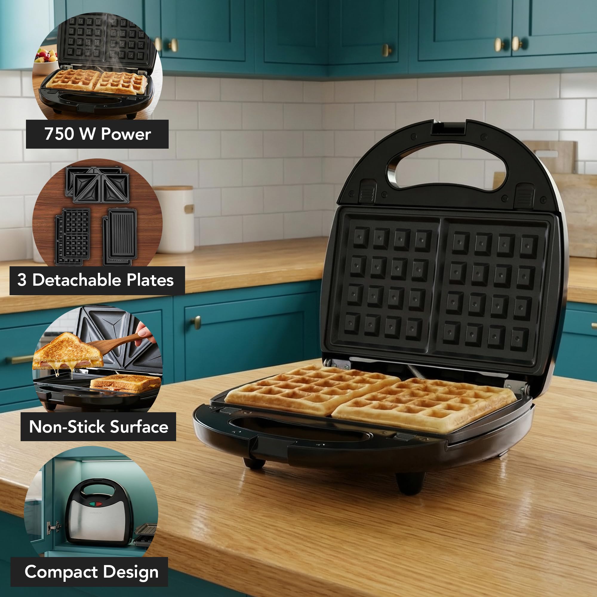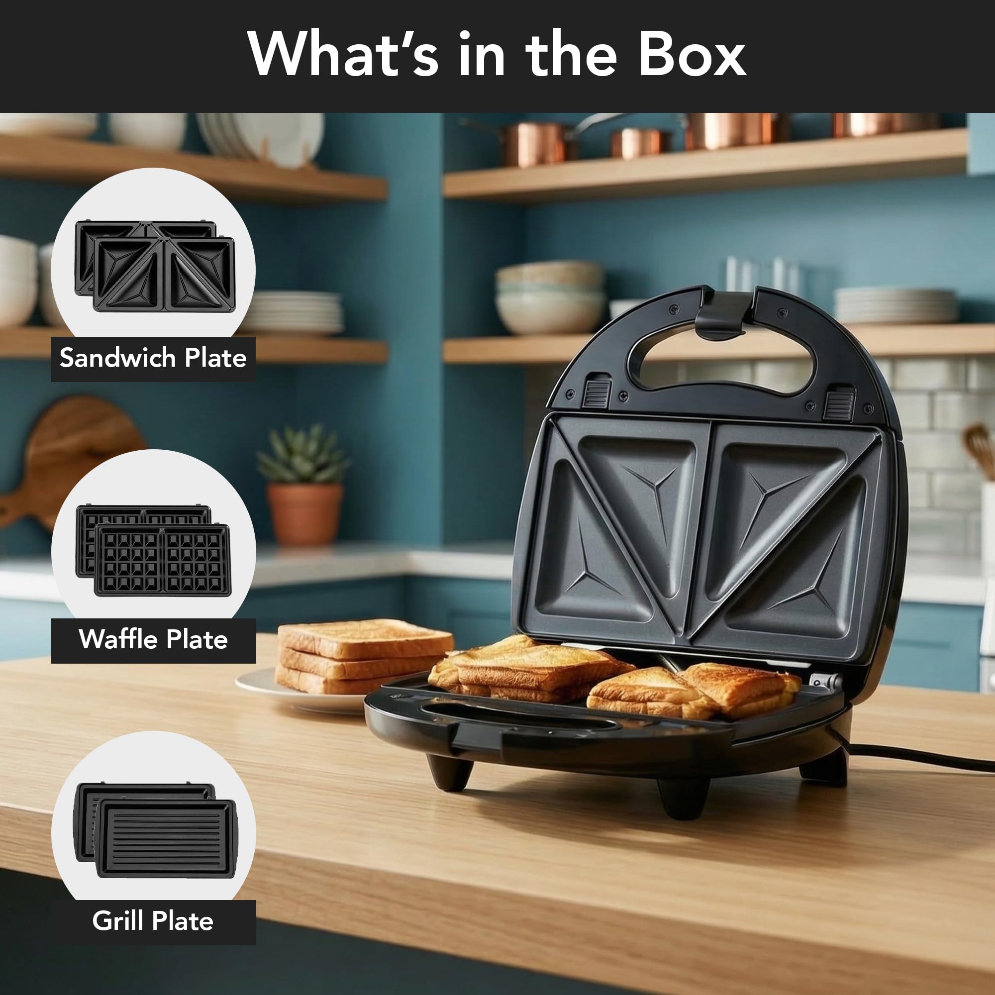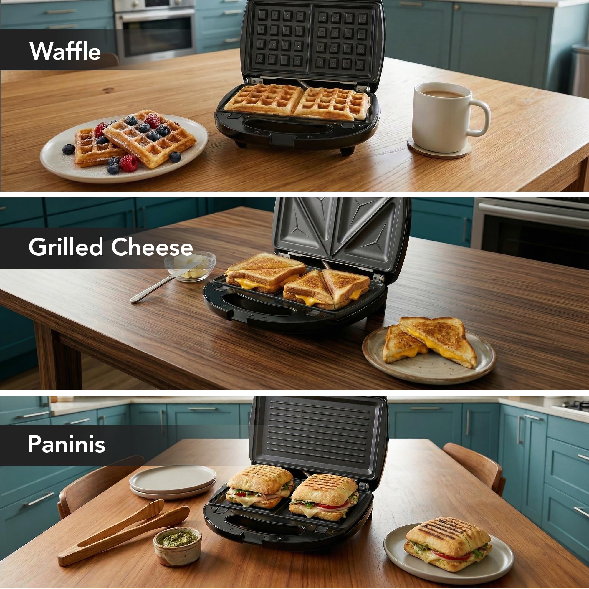 MULTI-FUNCTION PURPOSE – Comes with 3 interchangeable plates (sandwich, waffle, and grill plates). An essential for breakfast sandwich, waffle, grilled cheese, bacon and steak. This kitchen appliance lets you DIY different delicious meals any time of the day.