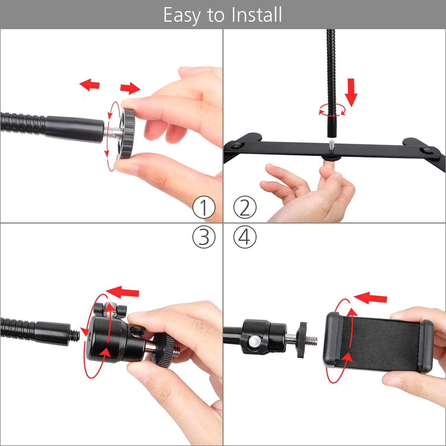 【Height Adjustable】- Mini Tripod is adjustable and gooseneck rod can be adjusted into multiple shapes to achieve better stability,total height can up to 16.5in; You will get:1*gooseneck rod, 1*photo copy stand base, 1*ball head, 1*phone clip (Note:Cell phone not included).