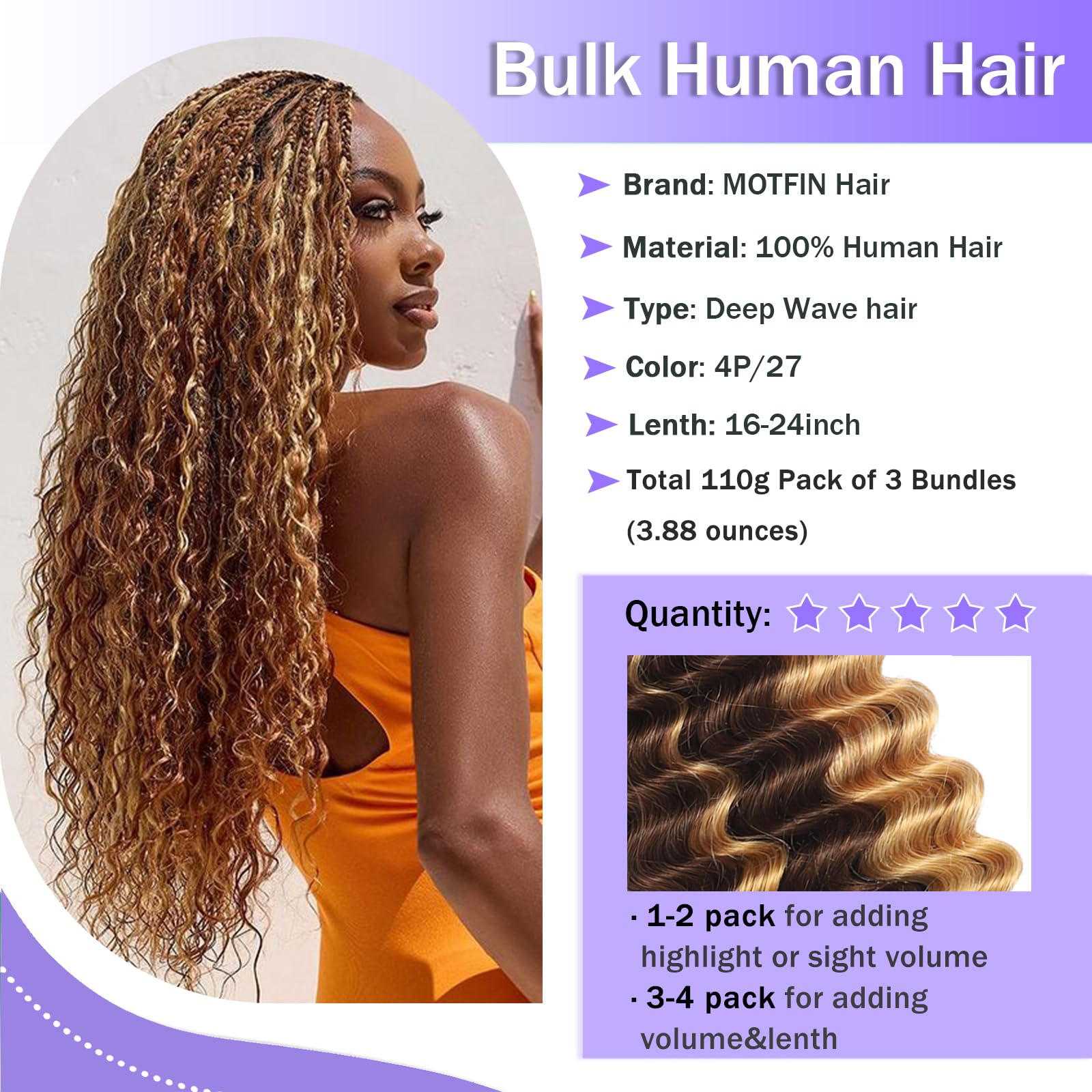 More Thoughtful Design: We've designed our water wave braiding hair with you in mind! Each pack contains 3 bundles, which is more convenient than 2 bundles. Our wet and wavy braiding hair is 110G per pack. We recommend using 2 packs to achieve perfect braids. This thoughtful design makes it easier for you to create your desired look.