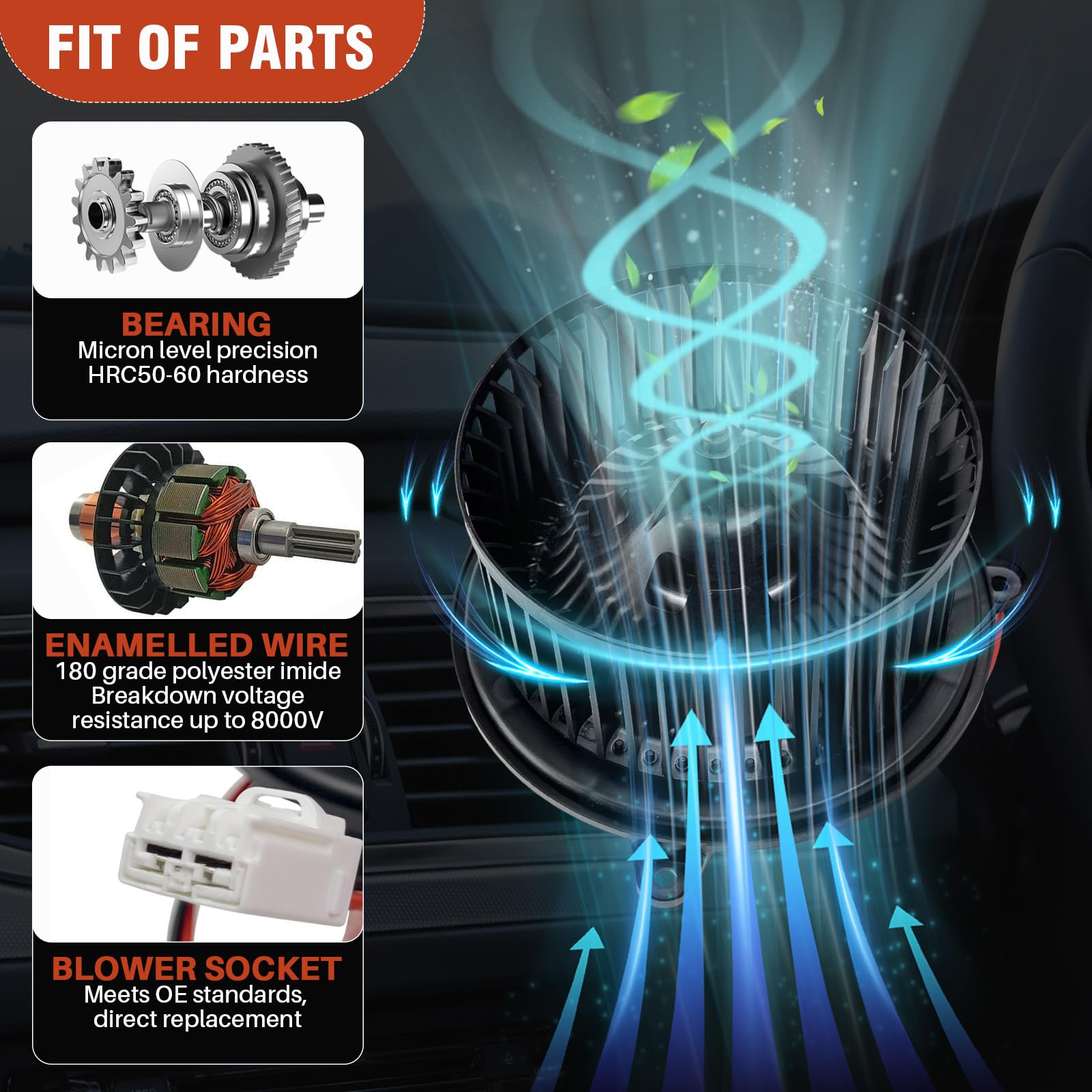 【Function & Maintenance】Blower fan circulates hot/cold air from HVAC system in the vehicle, maintaining thermostat-set temperature. Replace blower motor if vents deliver weak/no airflow or motor runs at low speed
