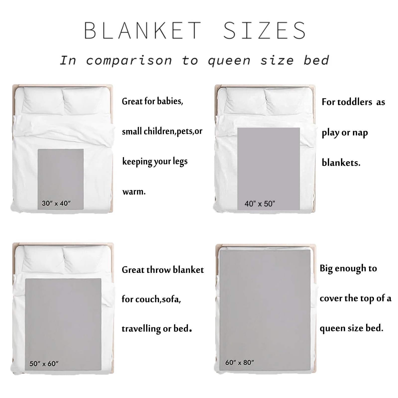 [Size guide]-30x40 inches=75x100 cm -40x50 inches=100x130 cm -50x60 inches=130x150 cm -60x80 inches=150x20 cm [Quality]-Made from flannel fabric that has a velvety soft that is sure to offer a luxurious feel. -The construction of the blanket is evident in every detail, from the carefully selected materials to the craftsmanship that goes into its production. [Design]-Crafted with a range of styles and designs to ensure that your little one stays cozy and stylish in their nursery. From classic prints to modern patterns, there is something to suit every decor preference. -Our blankets offer a perfect blend of style and function. Upgrade your baby's nursery with our stylish and fashionable blankets today [Functional]-This versatile blanket serves multiple purposes, making it an essential item for any new parent. Not only does it offer comfort and warmth as a swaddle for your baby, but it can also be used as a mat for tummy time.The soft fabric a cozy place for your little one to relax and explore their surroundings. -Apart from its practical uses, this blanket can also double as a nursing cover for privacy and convenience. The various size and lightweight material make it easy to drape over your shoulder while feeding your baby, allowing you to maintain privacy in any setting. [Easy Care]-It is best to machine wash them with either cold or warm water. Avoid hot water as it can cause the fabric to shrink and lose its softness. -Before using, we recommend washing them once to remove any excess dye and ensure all loose threads are secure. -After washing be sure to dry them on a low heat setting in the dryer or air dry them flat. [Customer Service]-We take pride in the quality of our products and want to ensure that you and your little one have a positive and memorable experience with us. -If you have any questions, concerns, or feedback, please do not hesitate to contact us.
