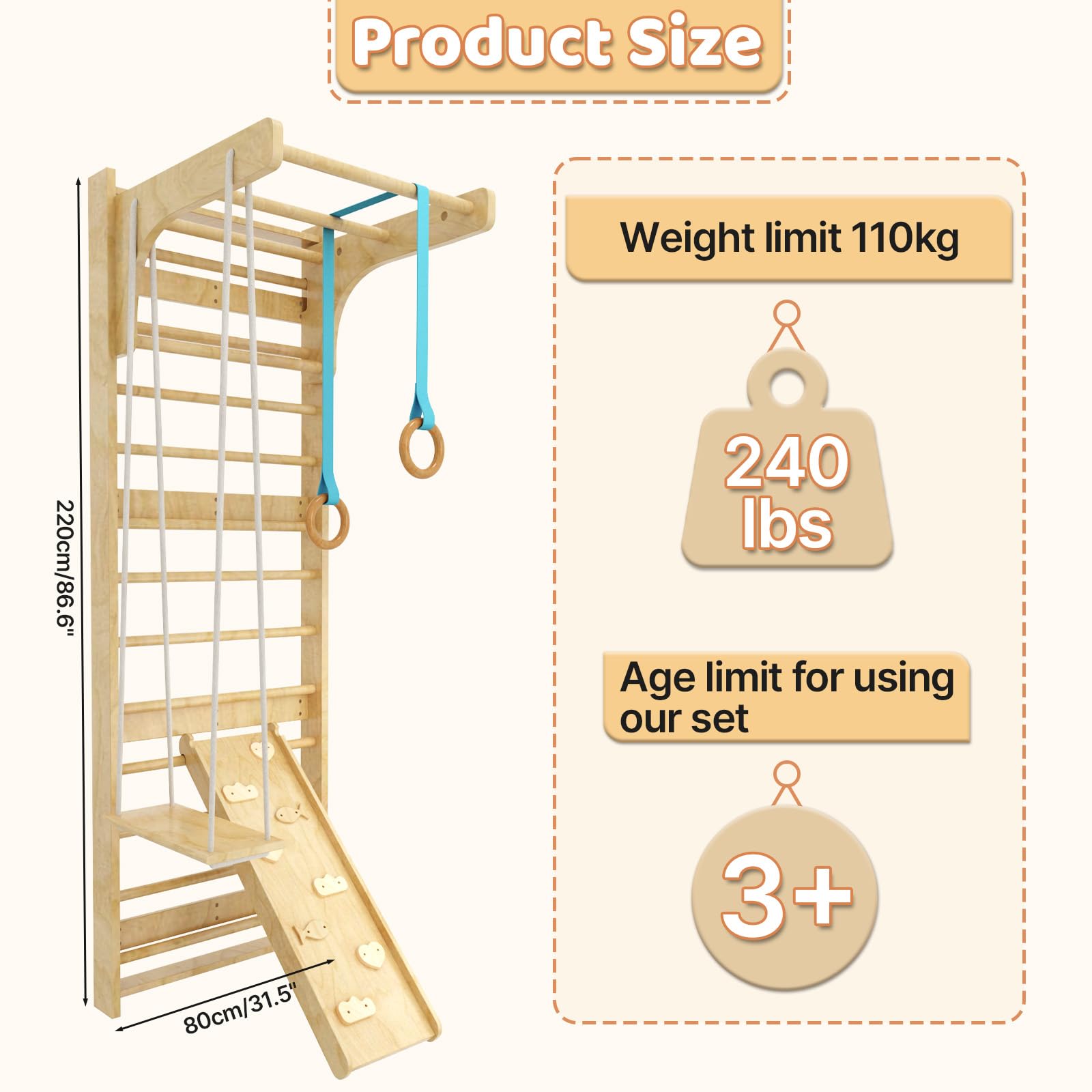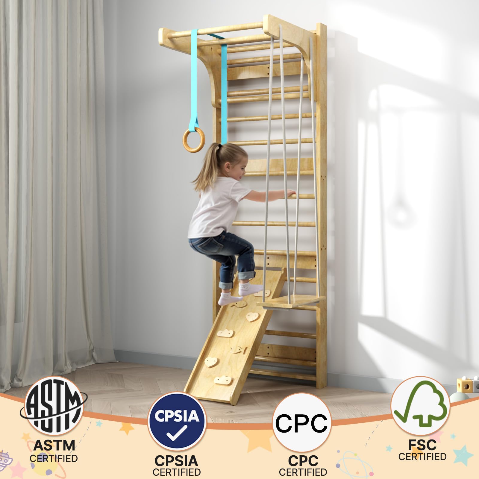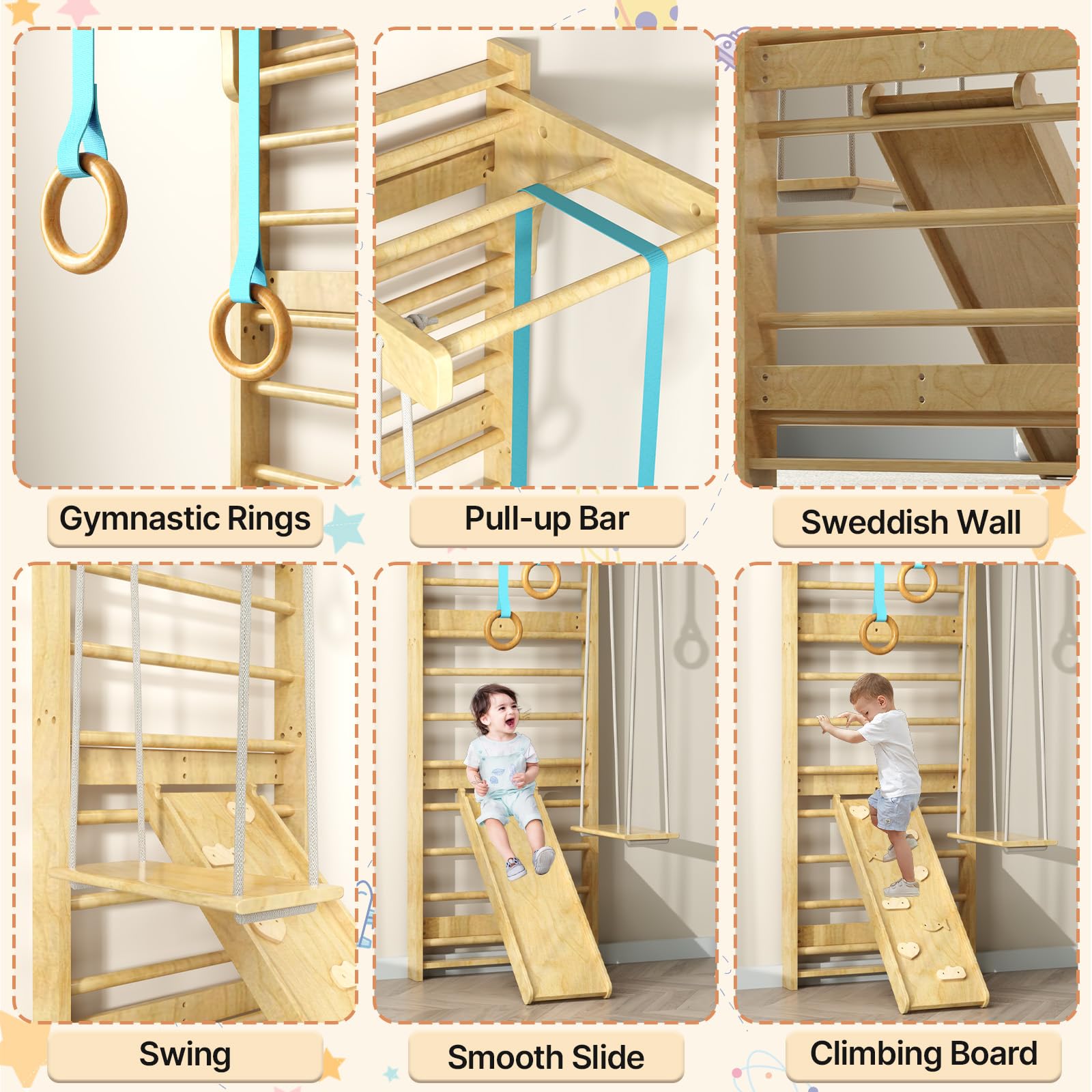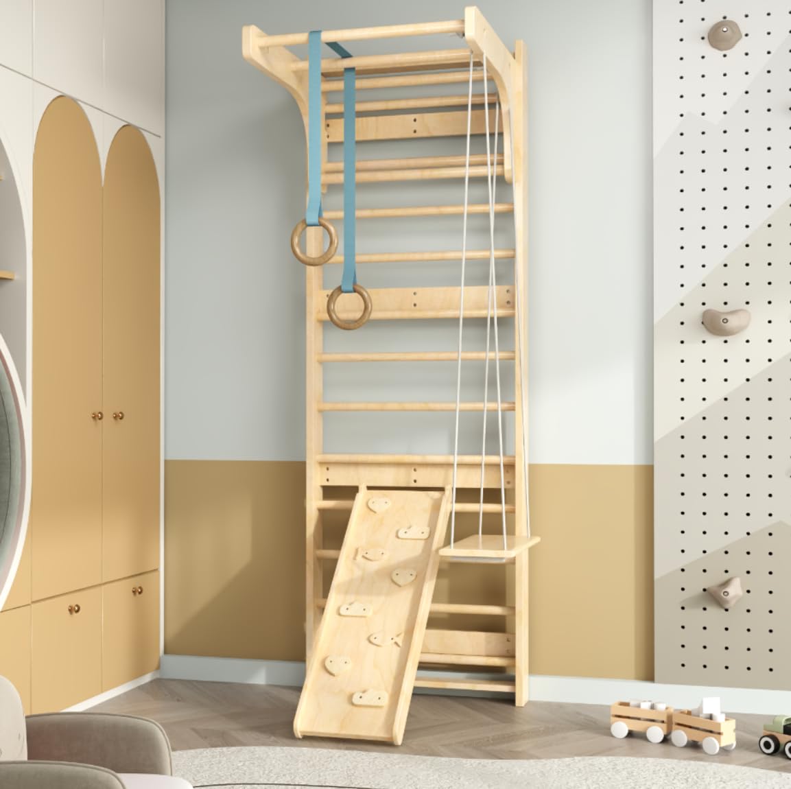Compact Design and Easy Installation: Wall-mounted for space-saving, this compact indoor playground fits any home. The 6-in-1 swedish ladder, a climbing wall for kids and adults, installs easily