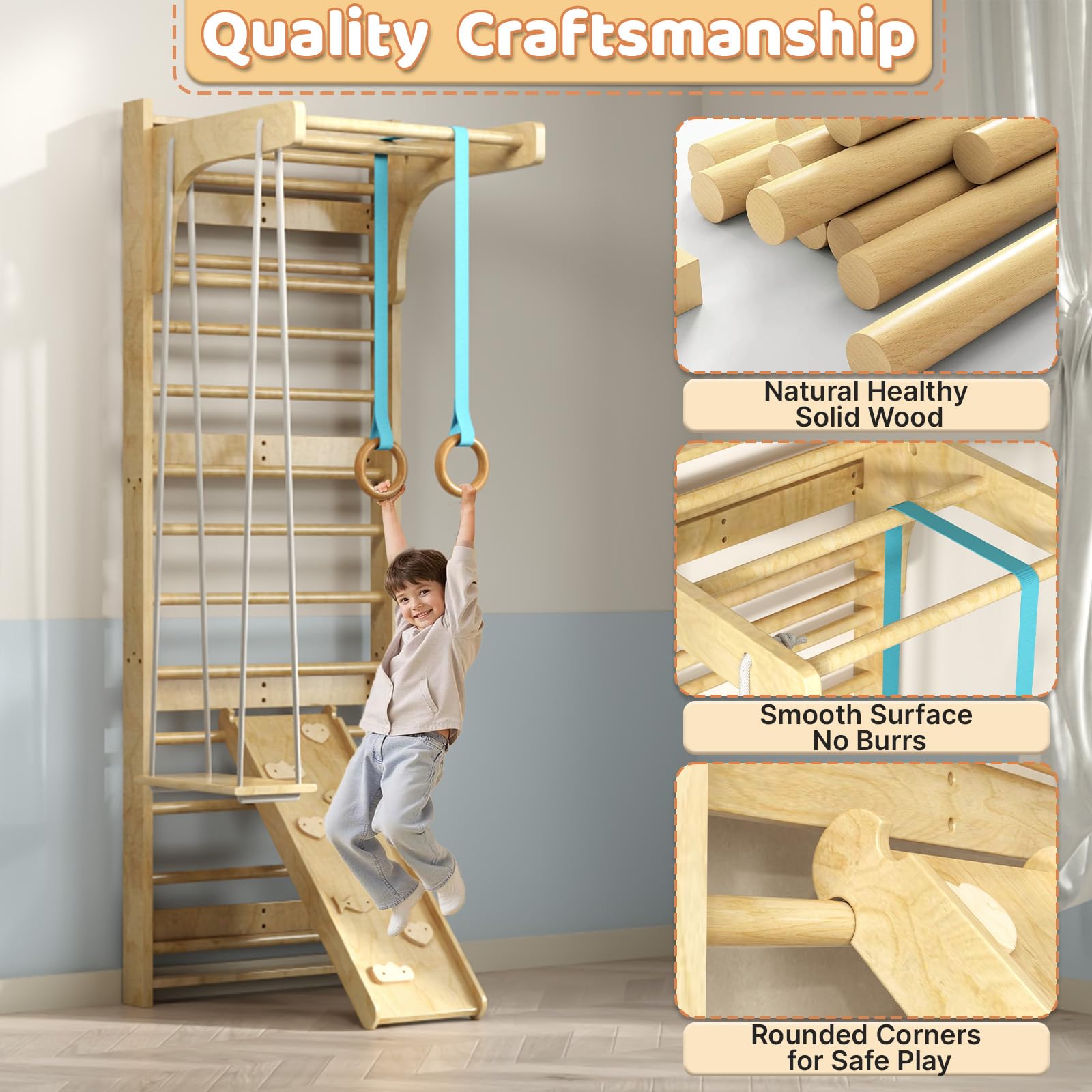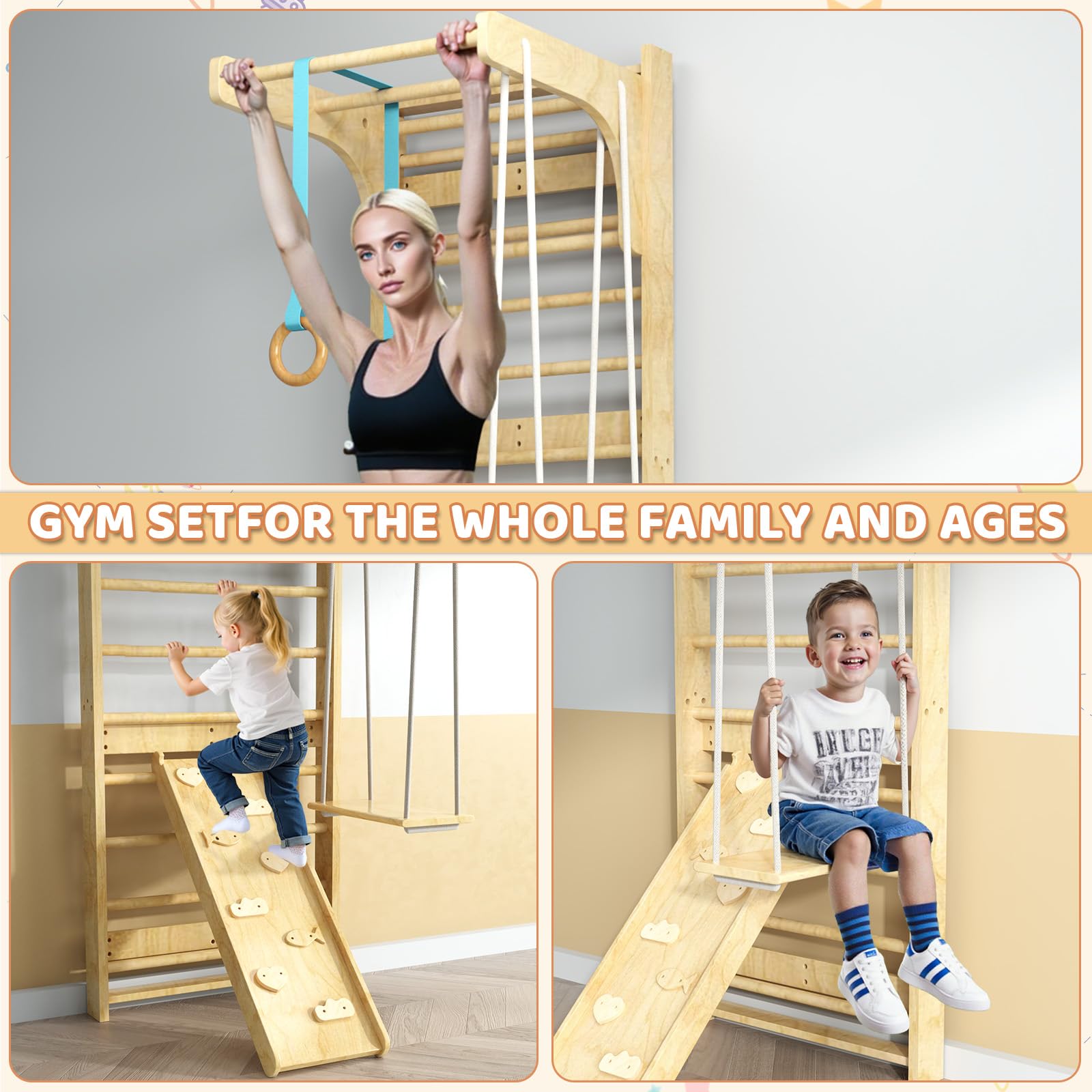 Multiple Play Functions: Our 6-in-1 swedish ladder, a wooden indoor gym for kids and adults, includes pull-up bar, gymnastic rings, wall ladder, climbing ladder, swing, slide board—endless family play in this indoor playground