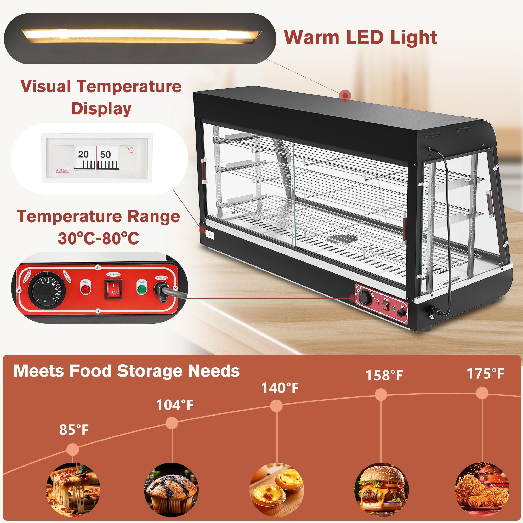 【Adjustable Temperature】The adjustable temperature range is 86-176℉(30°C-80°C), and you can set the temperature you want. There is a temperature display at the back end of the display cabinet to facilitate real-time temperature monitoring. Knob controlling makes it easy to operate