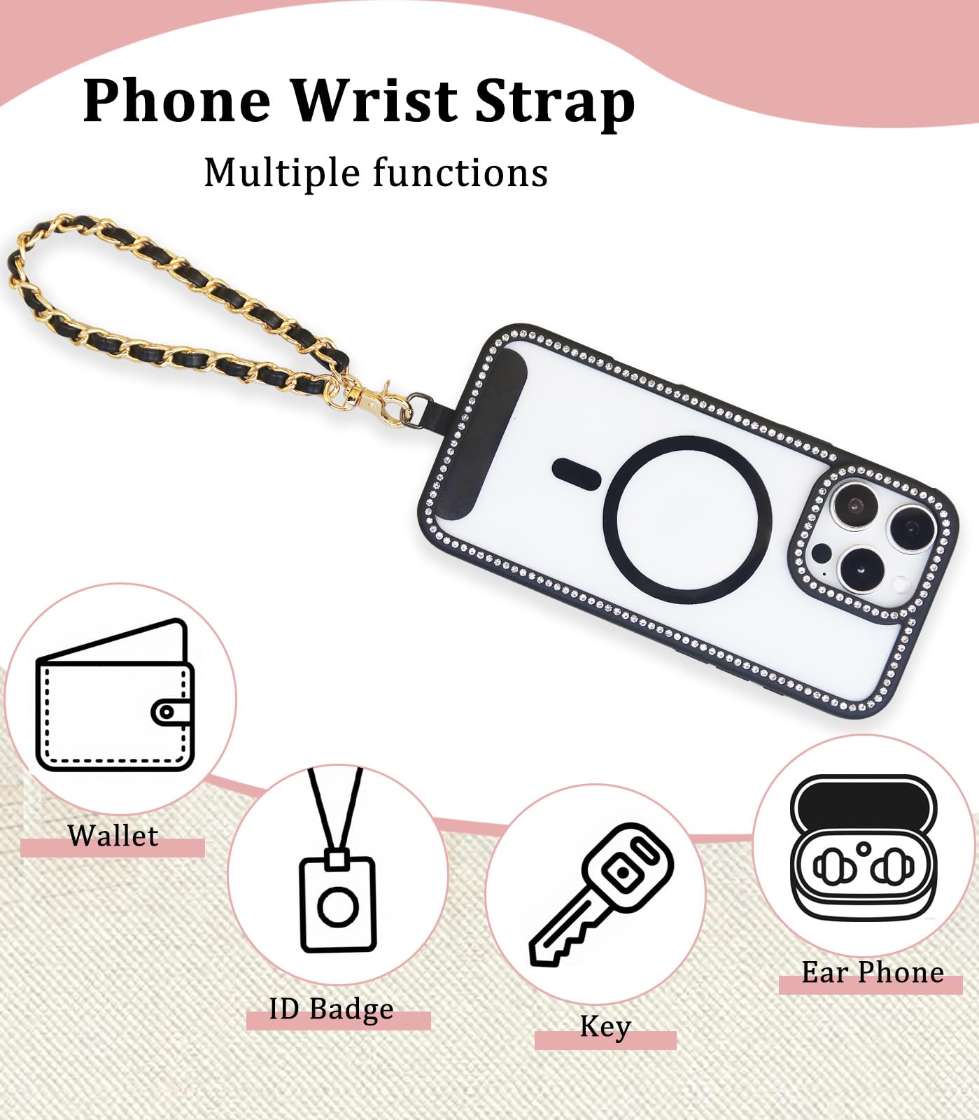 【2 Pads + Extra Straps Included】– Comes with 2 adhesive pads (for a stronger grip), a wrist strap, and 2 key rings