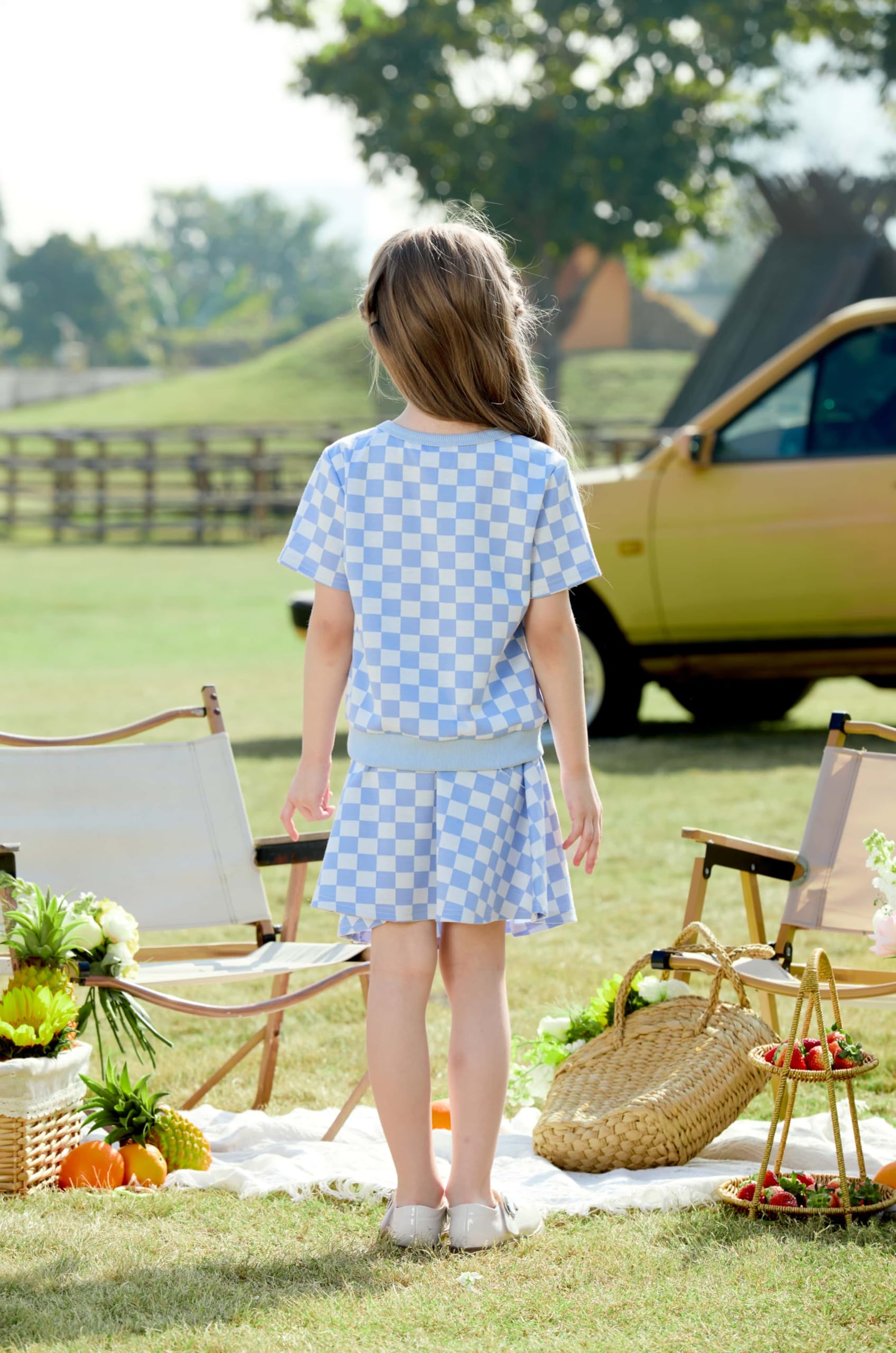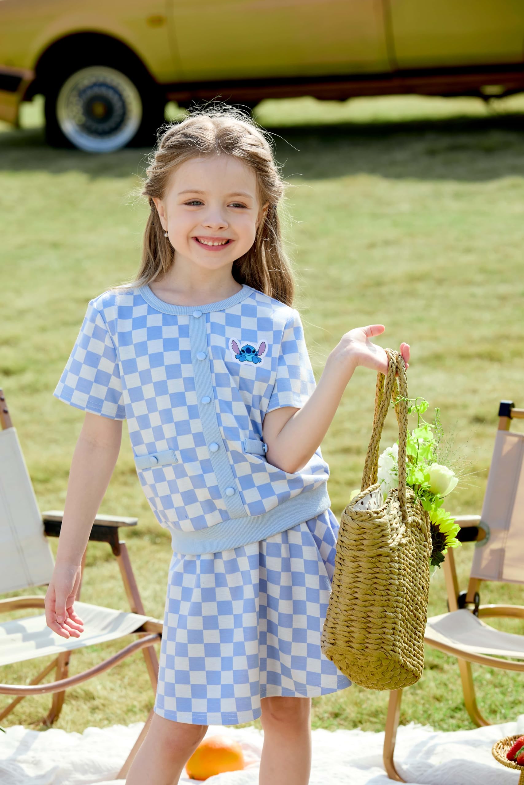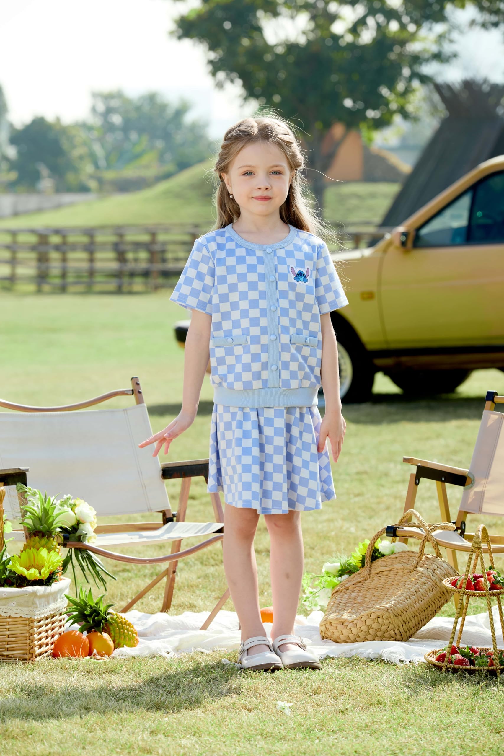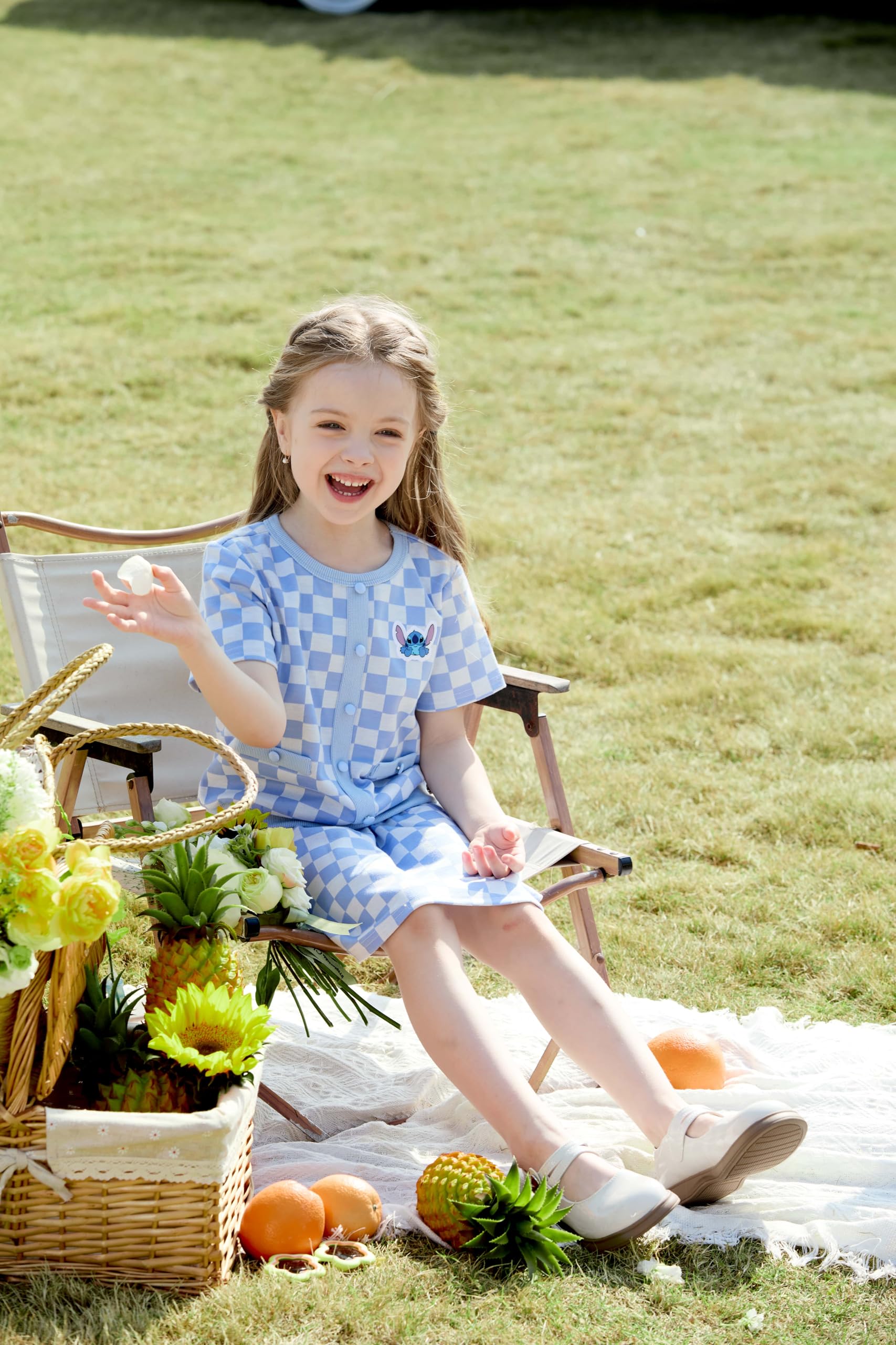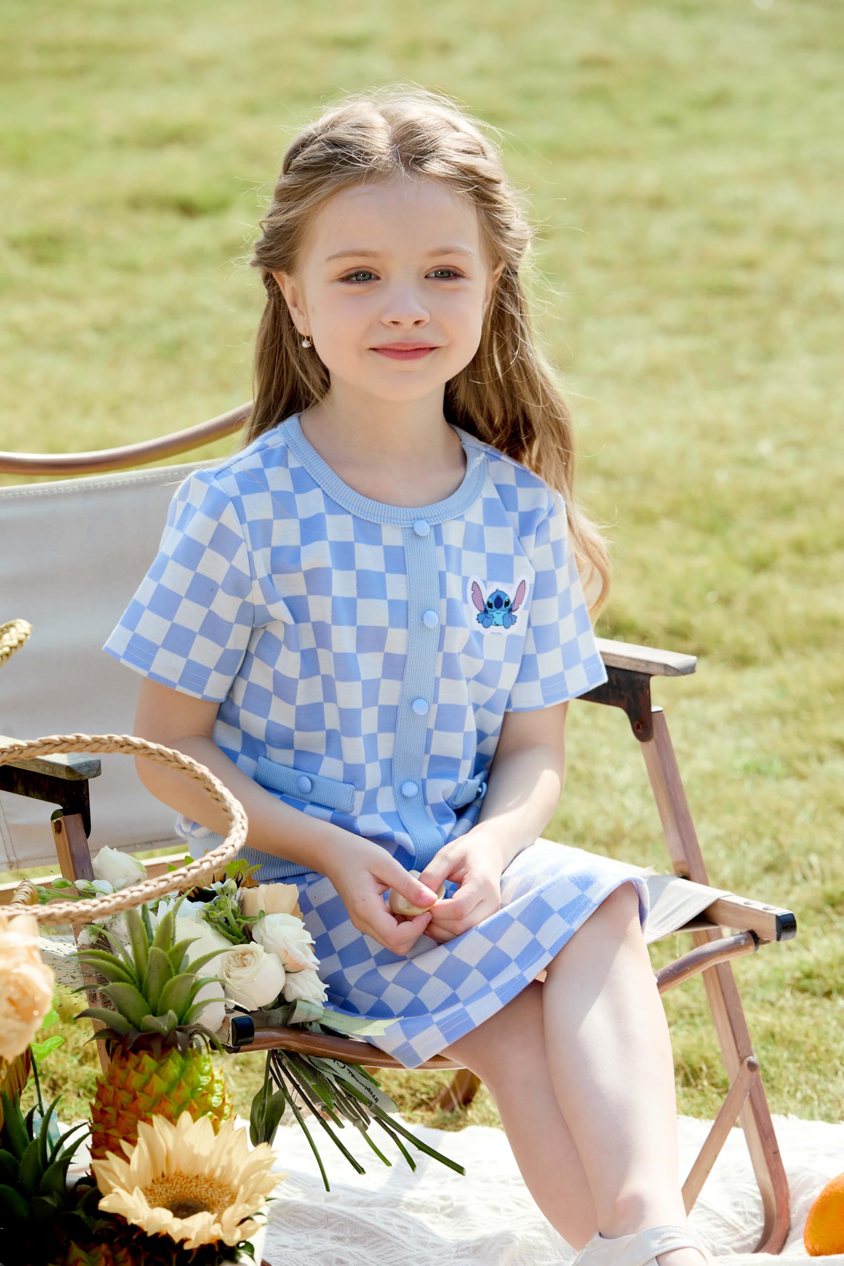 Charming 2-Piece Design: This delightful Disney dress for girls features a soft, stretchy knit top in light blue with an adorable Stitch graphic, paired with a flared, pleated skirt in a fun checkered pattern. The skirt’s checkered design adds a playful touch, while the soft knit fabric offers flexibility and comfort
