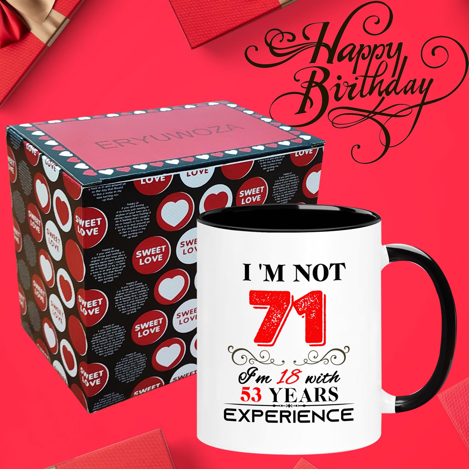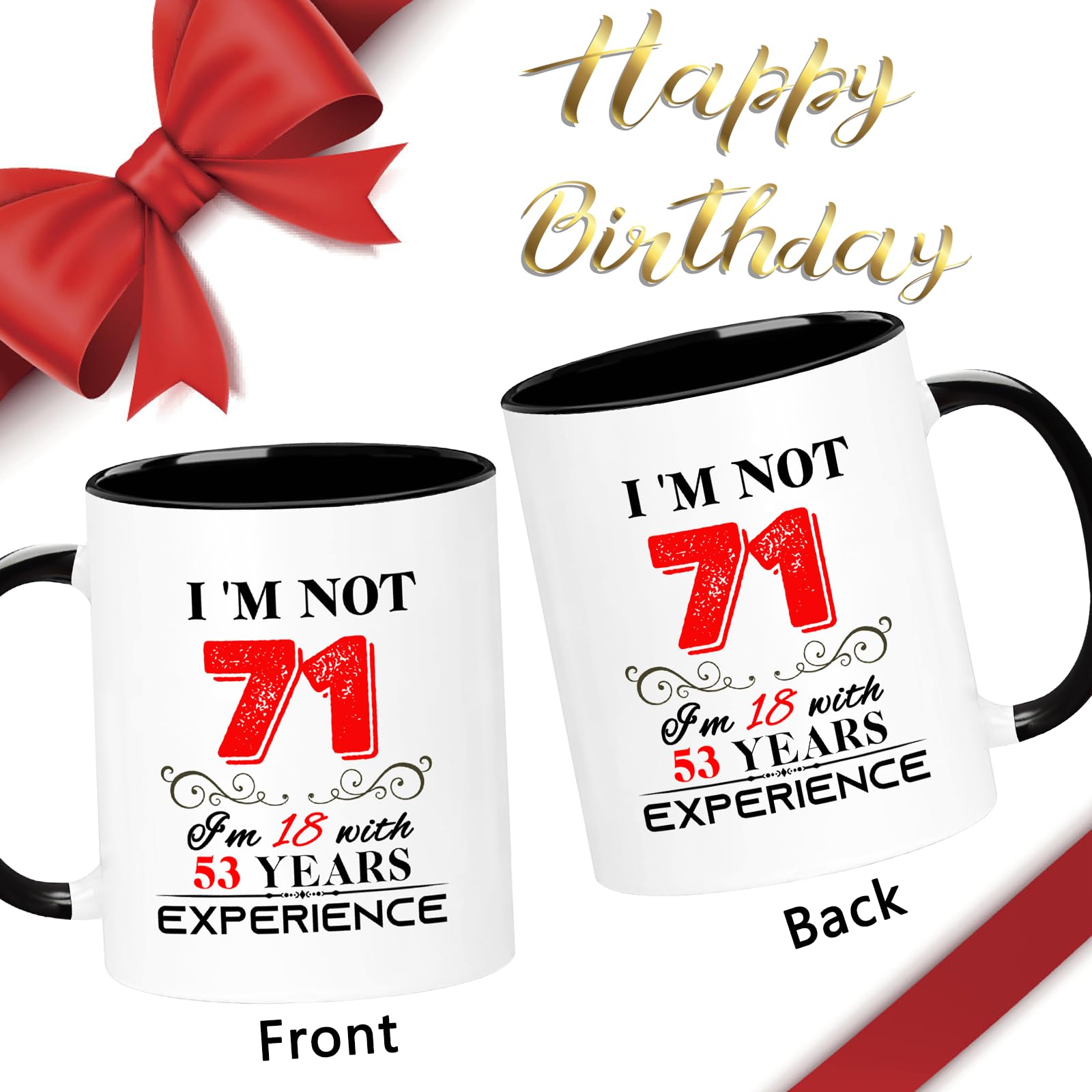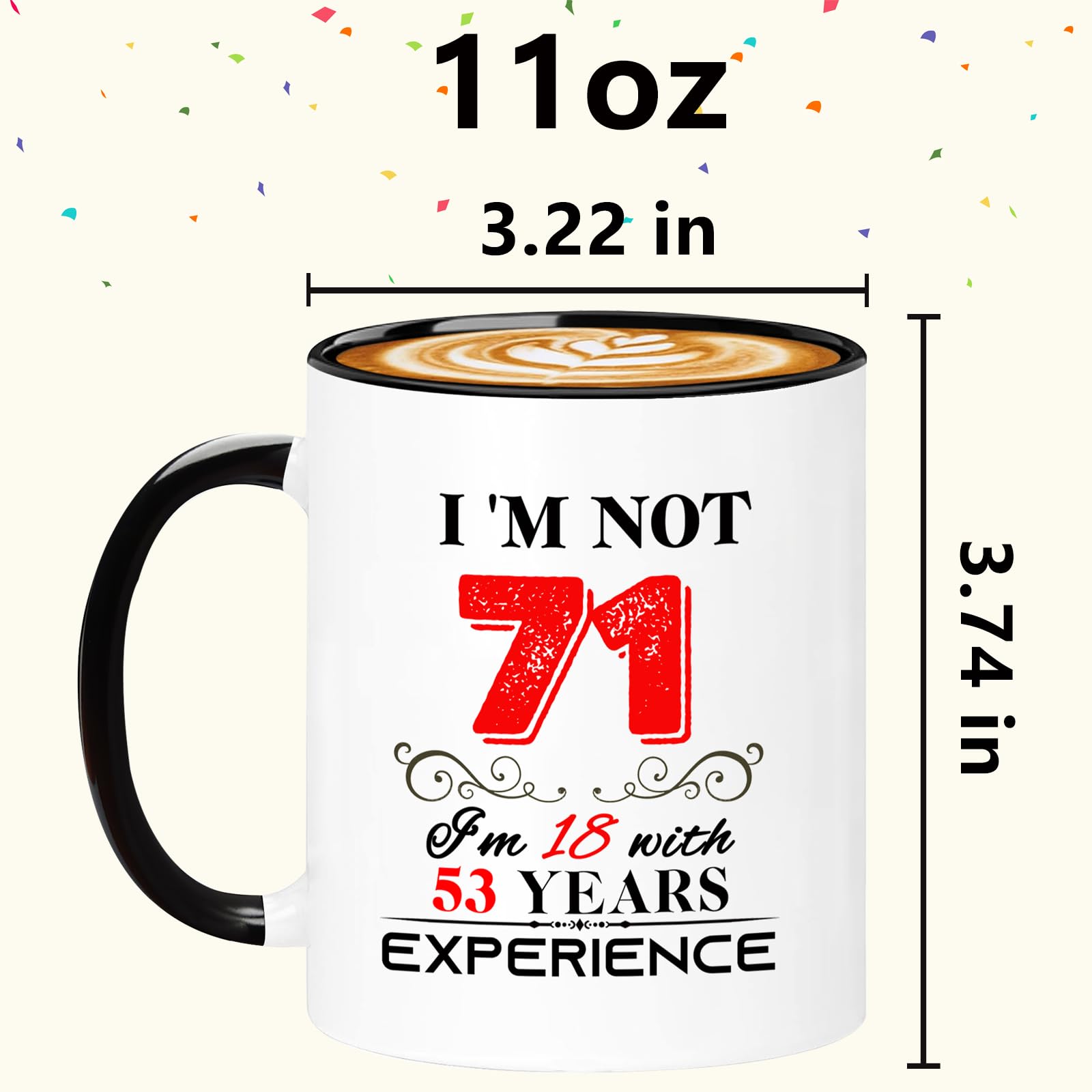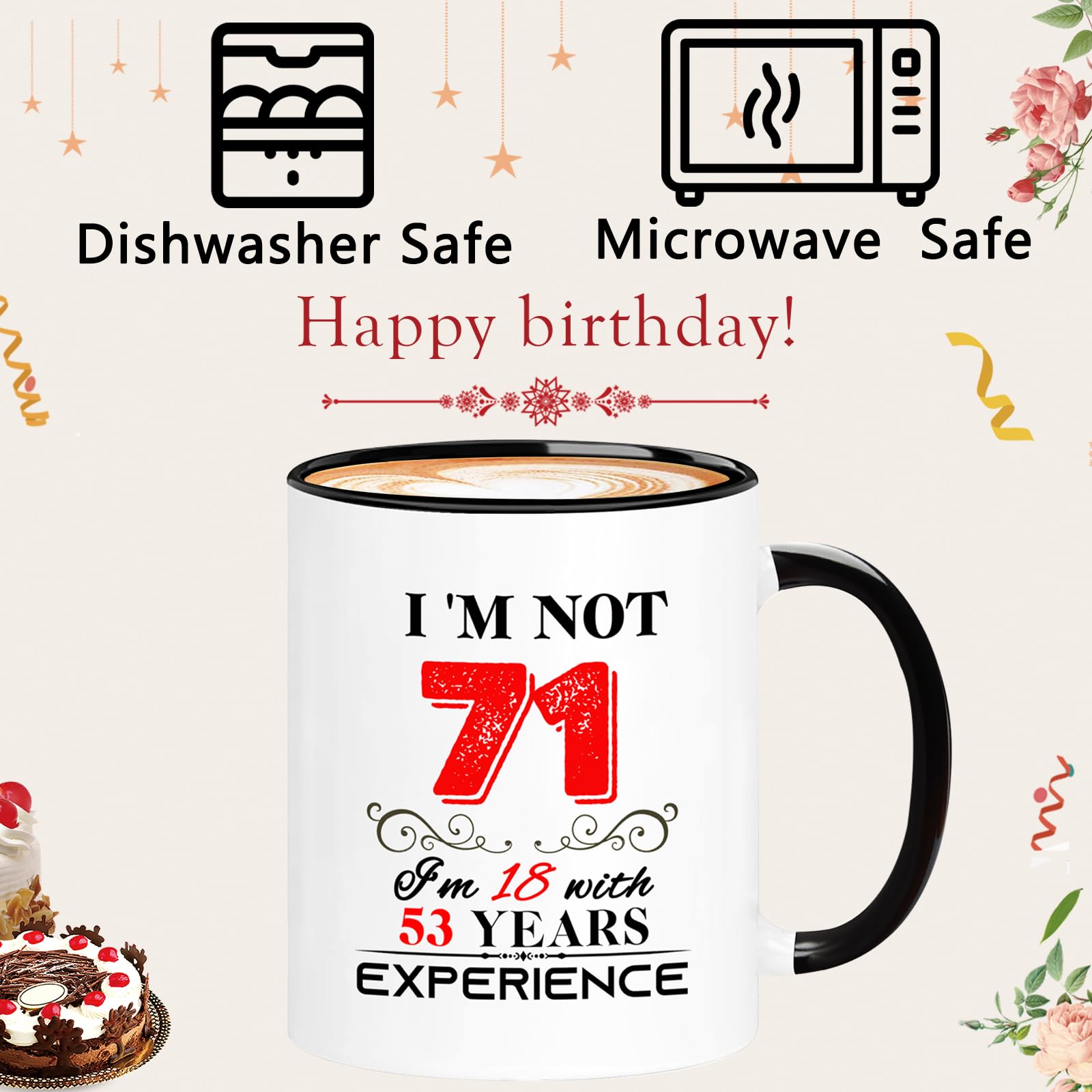 【Birthday Gift】: This funny "I'm not 71, I'm 18 with 53 years experience" Mug is the perfect birthday gift for a 71 year women men! Give it to your mom, dad, papa, mama, brother, sister, husband, wife, aunt, uncle, cousin, son, daughter, boyfriend, girlfriend, boss, coworkers, bestie, granddaughter, or your best friend for her he birthday.