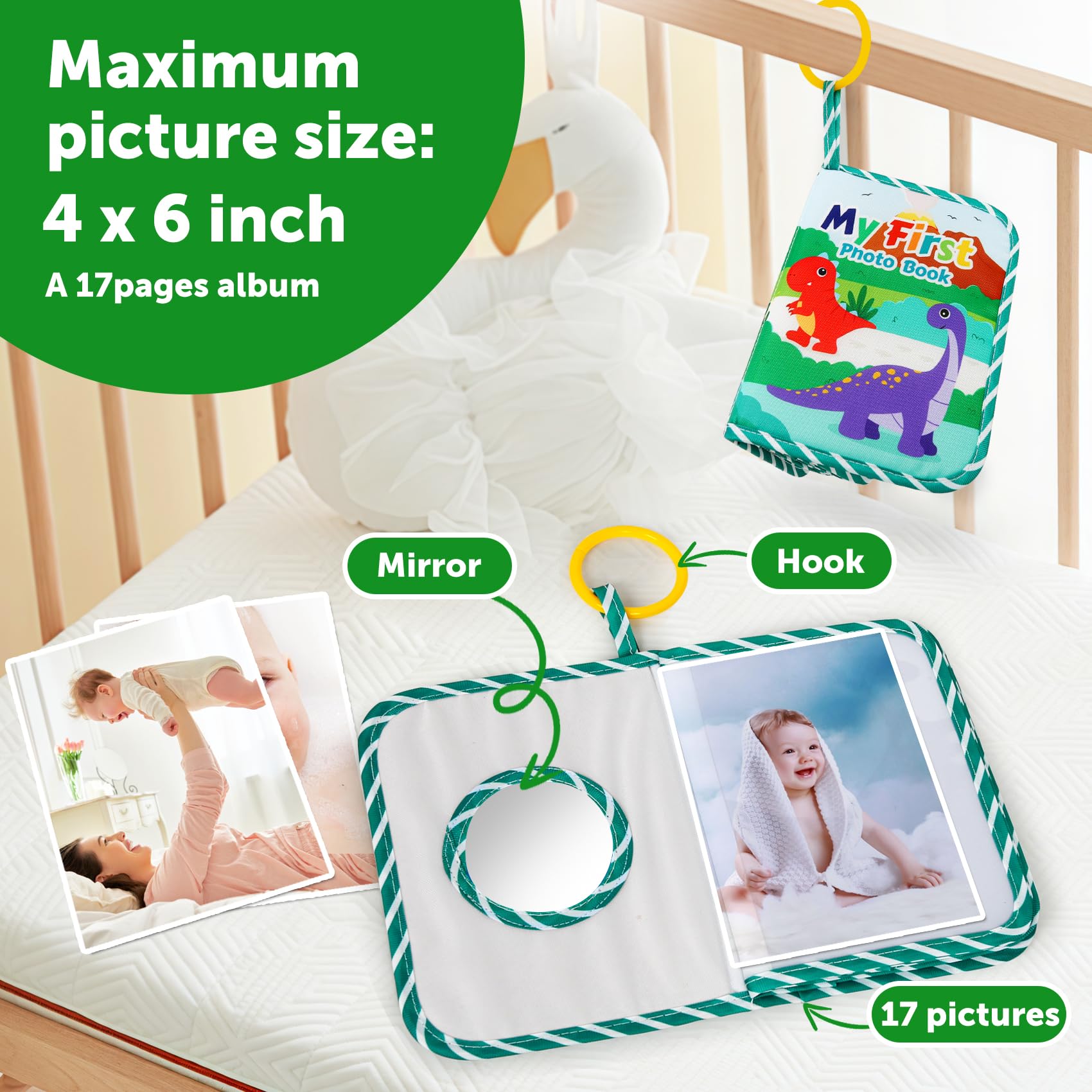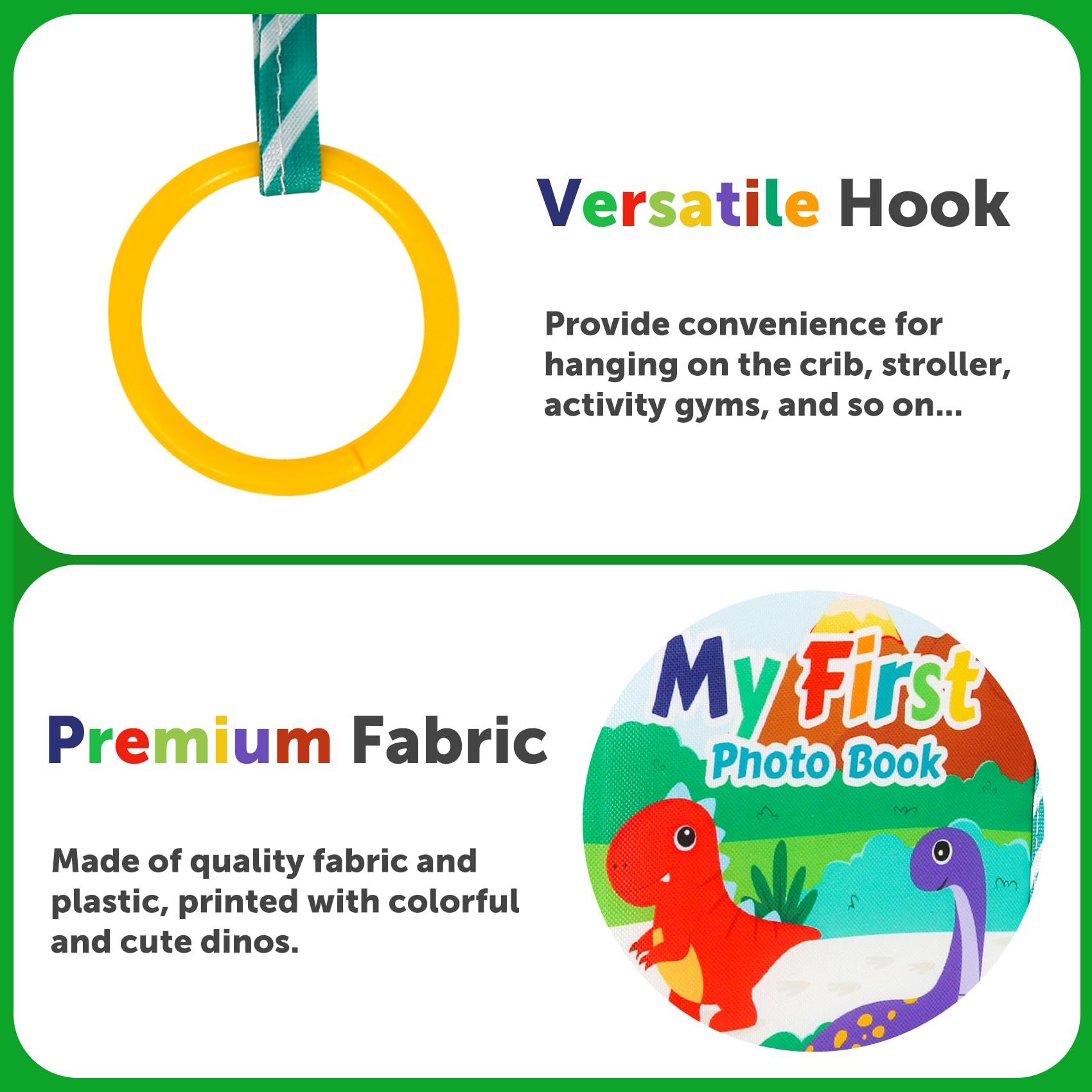 A 17pages Album: Can hold 17 pictures with max size of 4 X 6 inch. Hangable for strollers and excercise gym and so on. Good for indoor play as well as travel and outgoing
