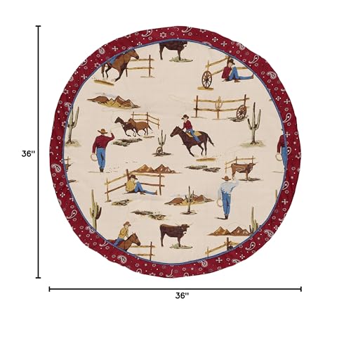 Playmat is designed using a multicolor western cowboy horse print and finished with dark blue denim piping and a red bandana print border - Brushed Microfiber
