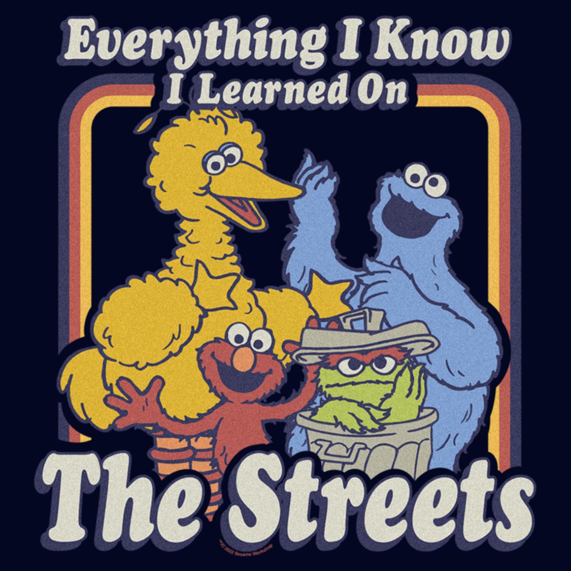 Strut your stuff with this stylish new men's t-shirt that is perfect for every occasion! Featuring Big Bird, Cookie Monster, Elmo, and Oscar the Grouch with the text: "Everything I Know I Learned on the Streets," across the front.