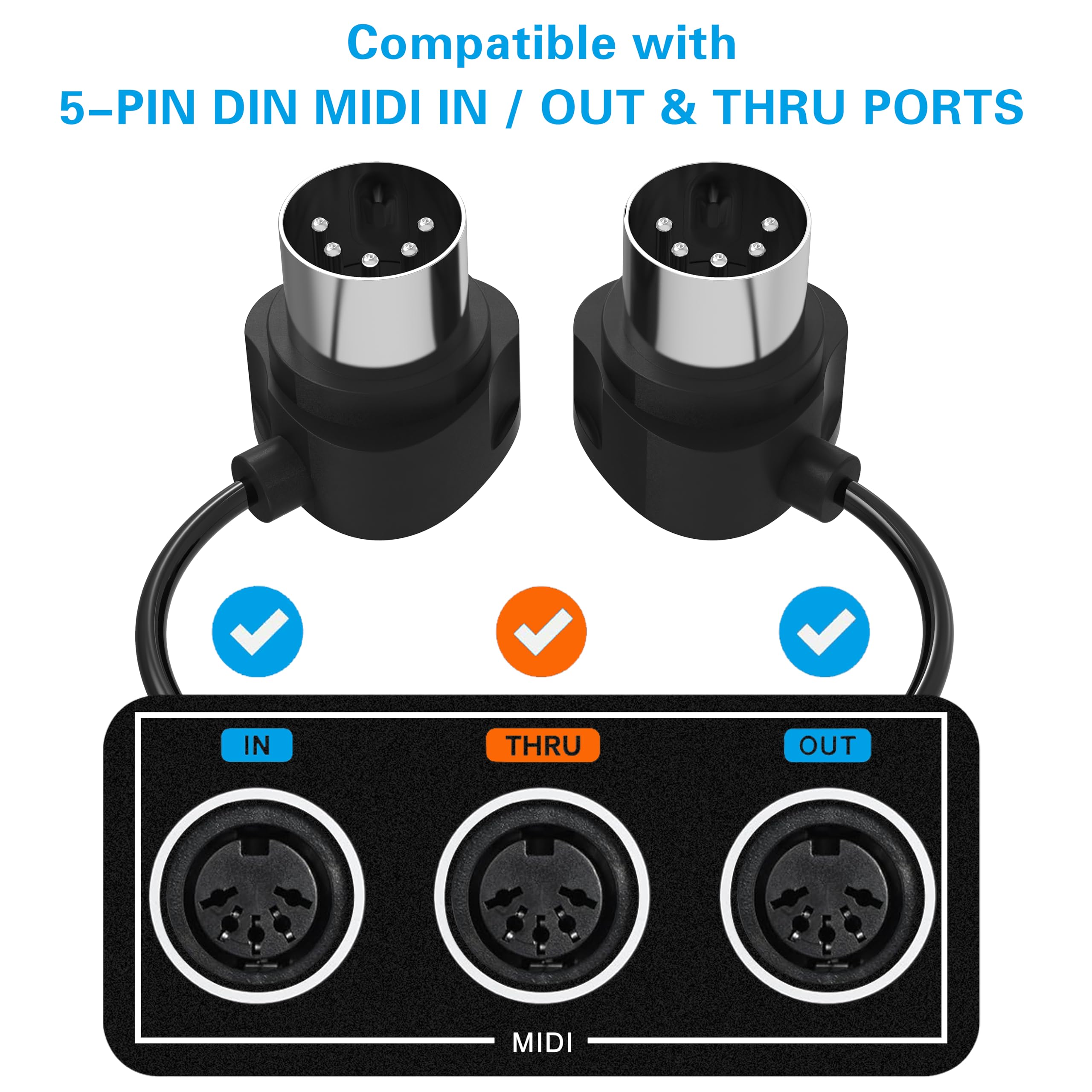Plug & Play, No extra difficult driver installation. Easy set up, truly plug and play. Works for standard MIDI device, provides the function of connecting the MIDI IN & MIDI OUT ports on MIDI instrument devices. New heavy-duty, molded connector design increases durability and resists damage.